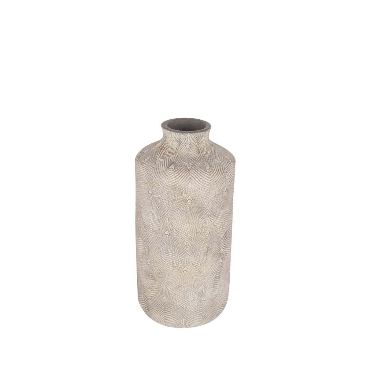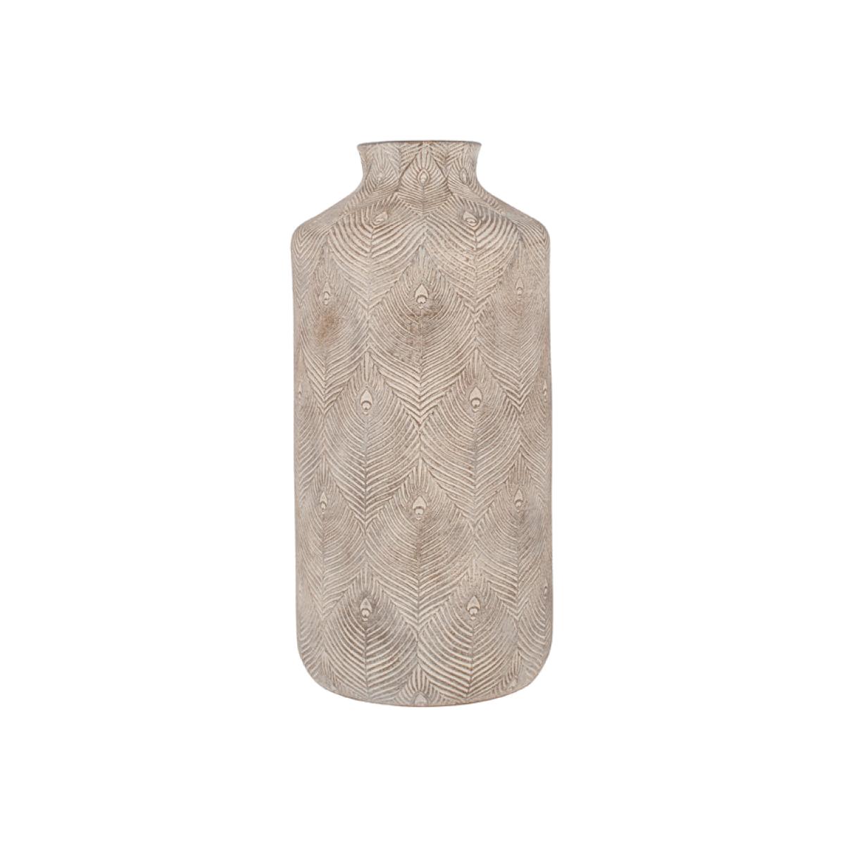A tall elegant stoneware vase from the Philippines with a beautiful stamped peacock feather design and finished in a soft matt grey. Each vase is handmade therefore you will be the proud owner of a completely unique piece. The vase has a waterproof lining if you choose to add fresh flowers.