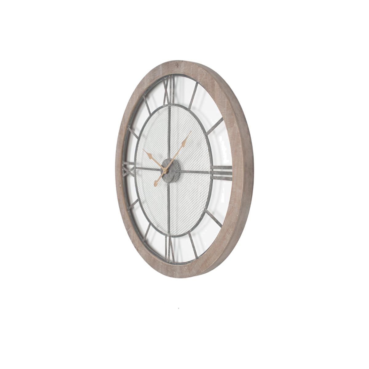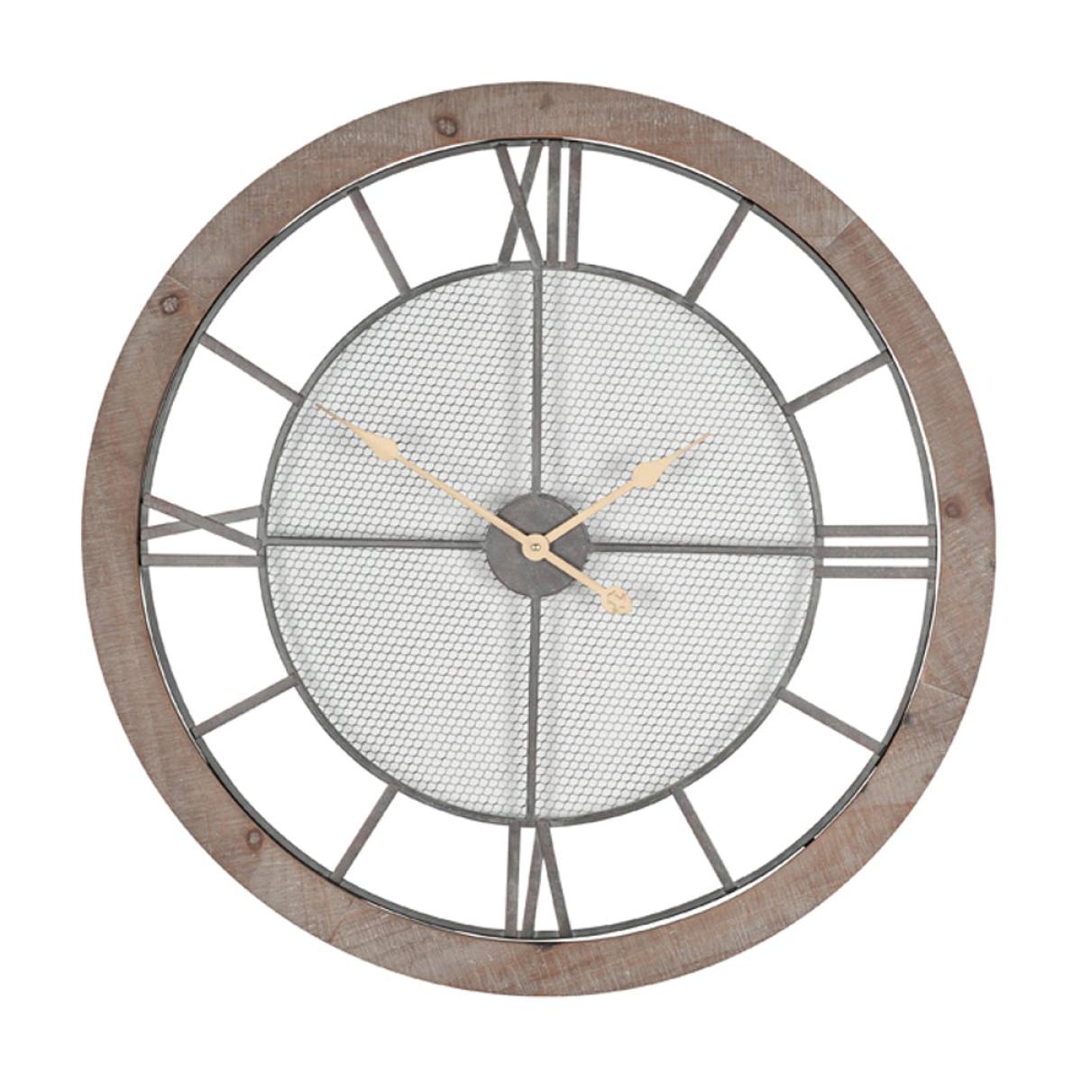 This smart round wood clock has contrasting mesh detail which will look perfect in an industrial natural setting. The large roman numerals are an added feature and make this clock easy to read and the perfect timepiece for any wall.