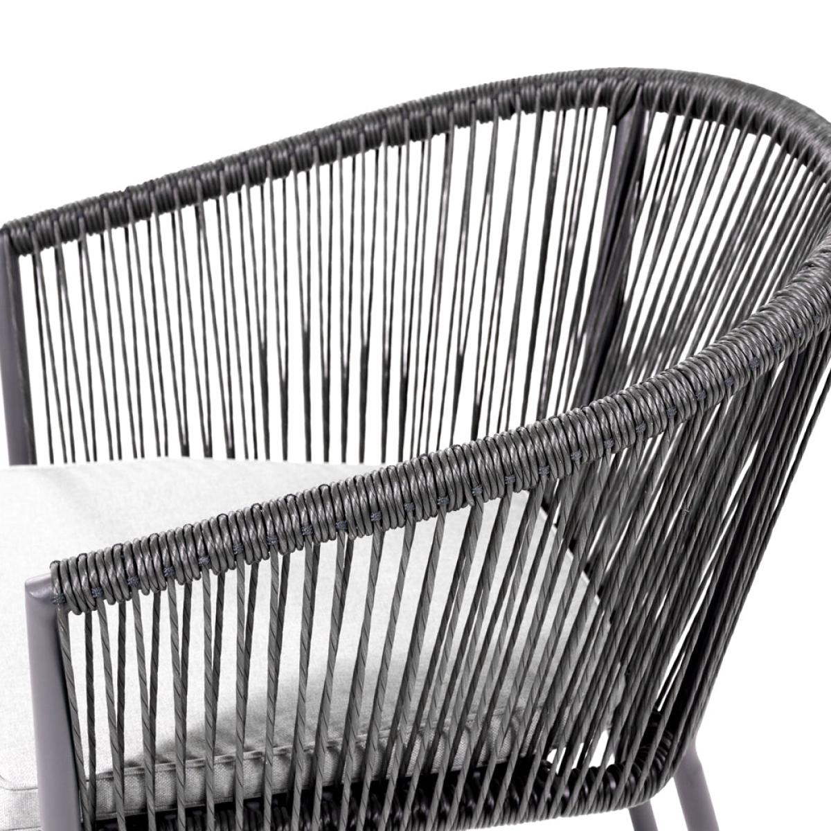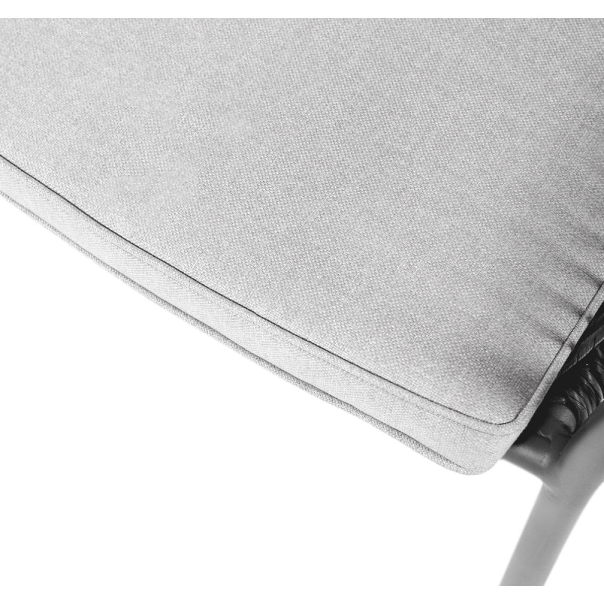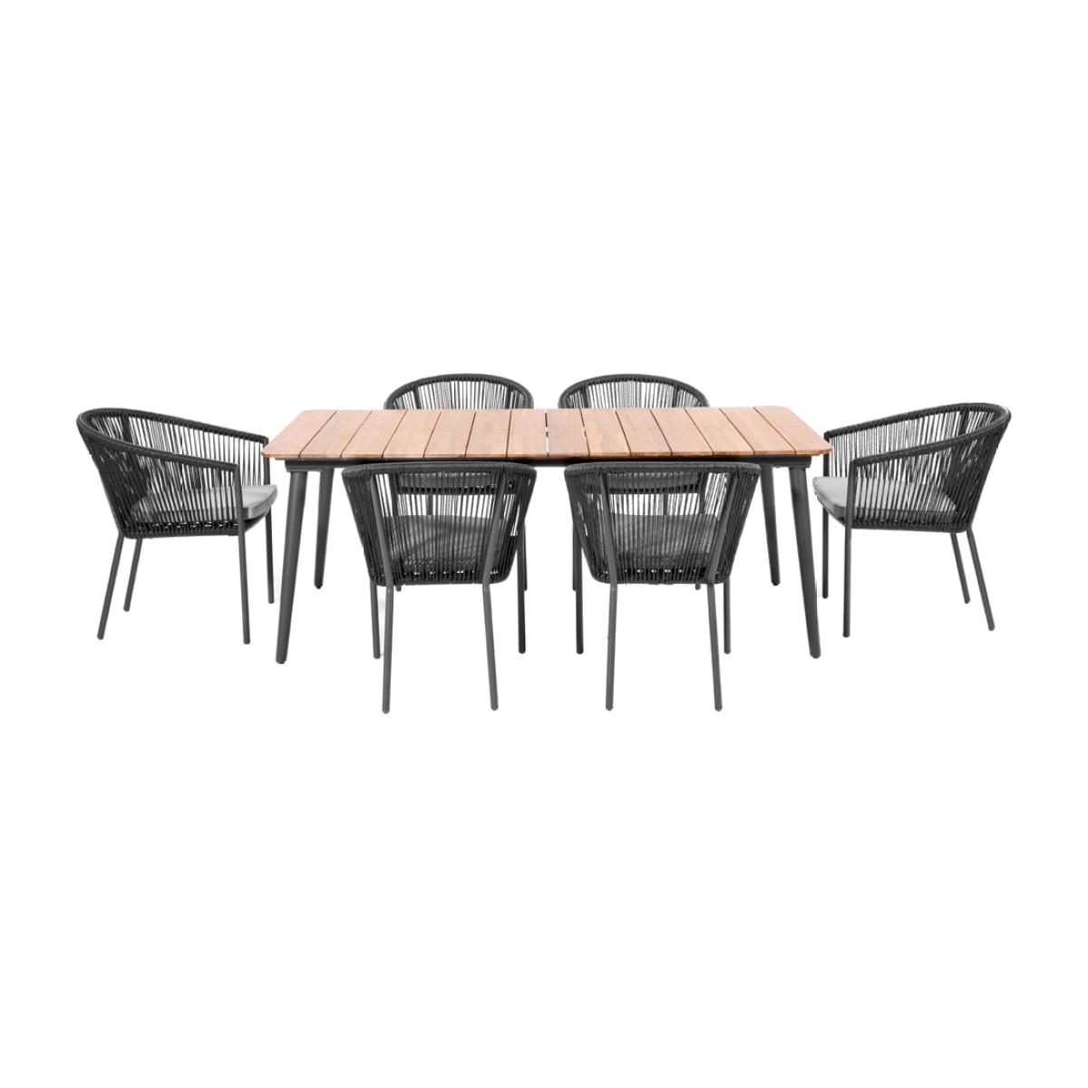 The Remi Dining Set is available in grey twisted Polystring. This modern dining set includes an Acacia wood-topped table and six contemporary dining chairs including a seat pad for added comfort. The chairs are easily stackable to keep them neat and tidy when not in use. The frame is powder-coated aluminium to ensure maximum protection from inclement weather. Each chair is topped with a soft natural cushion, making this the perfect place to relax.