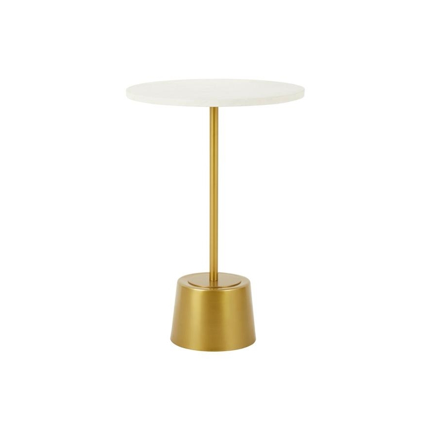 This side table has a clean white marble top which contributes to its sophistication. The top rests upon the antique brass finish rod with angled pedestal support. The tapered base gives this piece stability while creating an elegant visual appeal in warm metallic tone. Use this table to make an eclectic floral arrangement with coordinating interior.
