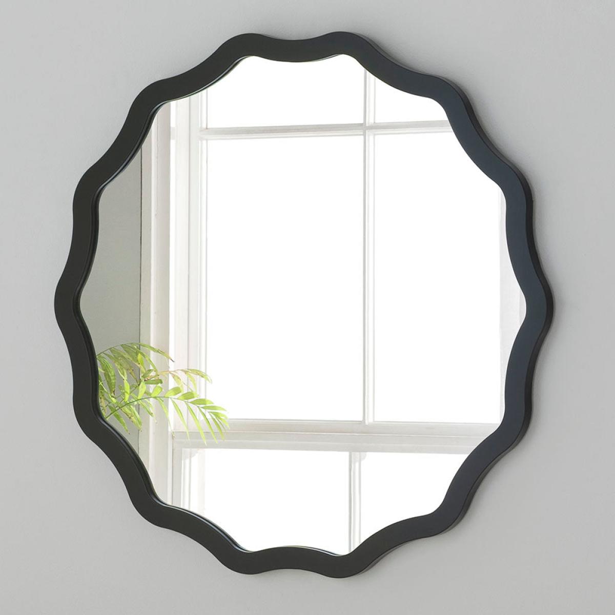 The Olivia's Rowan Round Wall Mirror in Black, handcrafted in the UK, is the epitome of sophistication and elegance. This exquisite mirror features a striking scalloped frame, meticulously constructed from wood and finished by hand by skilled artisans, showcasing exceptional craftsmanship. The wooden backing adds to its durability and quality. The mirror glass itself boasts exceptionally clear and crisp reflective qualities, perfect for enhancing any interior with a light and airy ambiance. For added convenience, this mirror is equipped with two hanging loops attached to the back, one on each side, facilitating easy wall hanging. Please note that wall mounting plugs and screws are not included. This product is a testament to fine British craftsmanship, making it not just a mirror but a piece of art that brings a touch of luxury to any room. Additional Information
