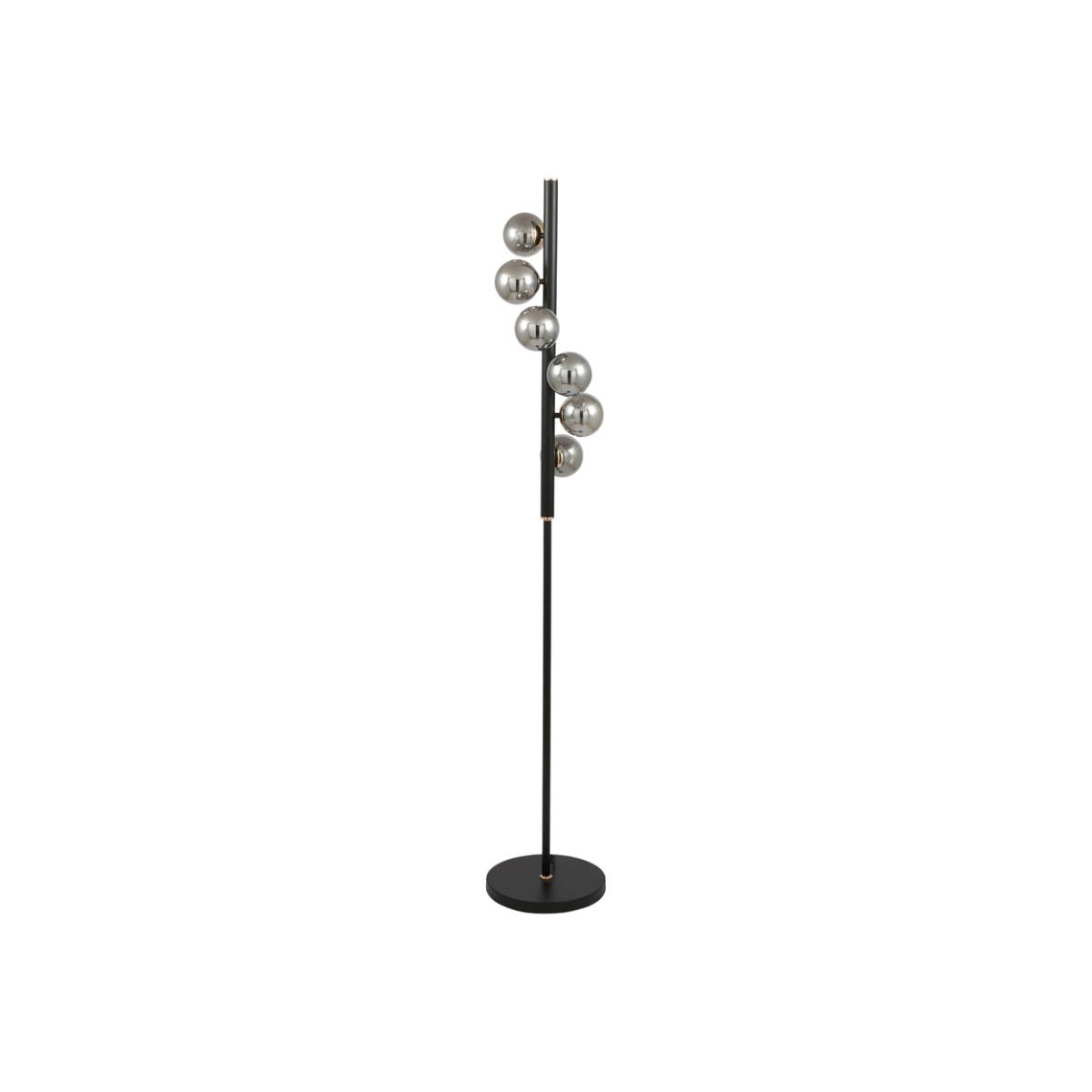 A sophisticated floor lamp with 6 smoke glass balls, black post and brass coloured detailing creating a chic, futuristic look. Create a statement with this stunning floor lamp. Pair with a matching table lamp and pendant style if needed.