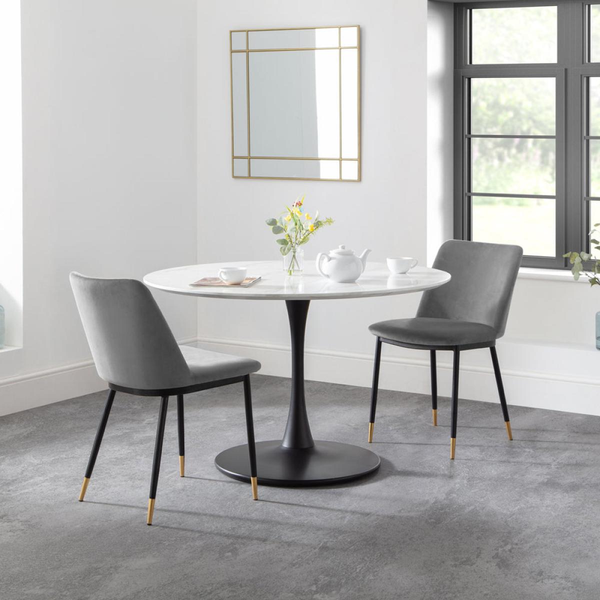 The Delaunay Dining Chair offers a simple, modern design finished in a Grey Velvet with black legs and brushed brass tips for an elegant finish. Perfect for adding a touch of glamour to your living room or kitchen space, this elegant chair will perfectly match a range of dining tables. The Delaunay Chair is available in a variety of colours. Dimensions: H: 83 x W: 50 x D: 59 cm Materials: Velvet/Metal Assembly Required:Yes Care Instructions:Wipe with a clean damp cloth. Avoid household cleaners & abrasives