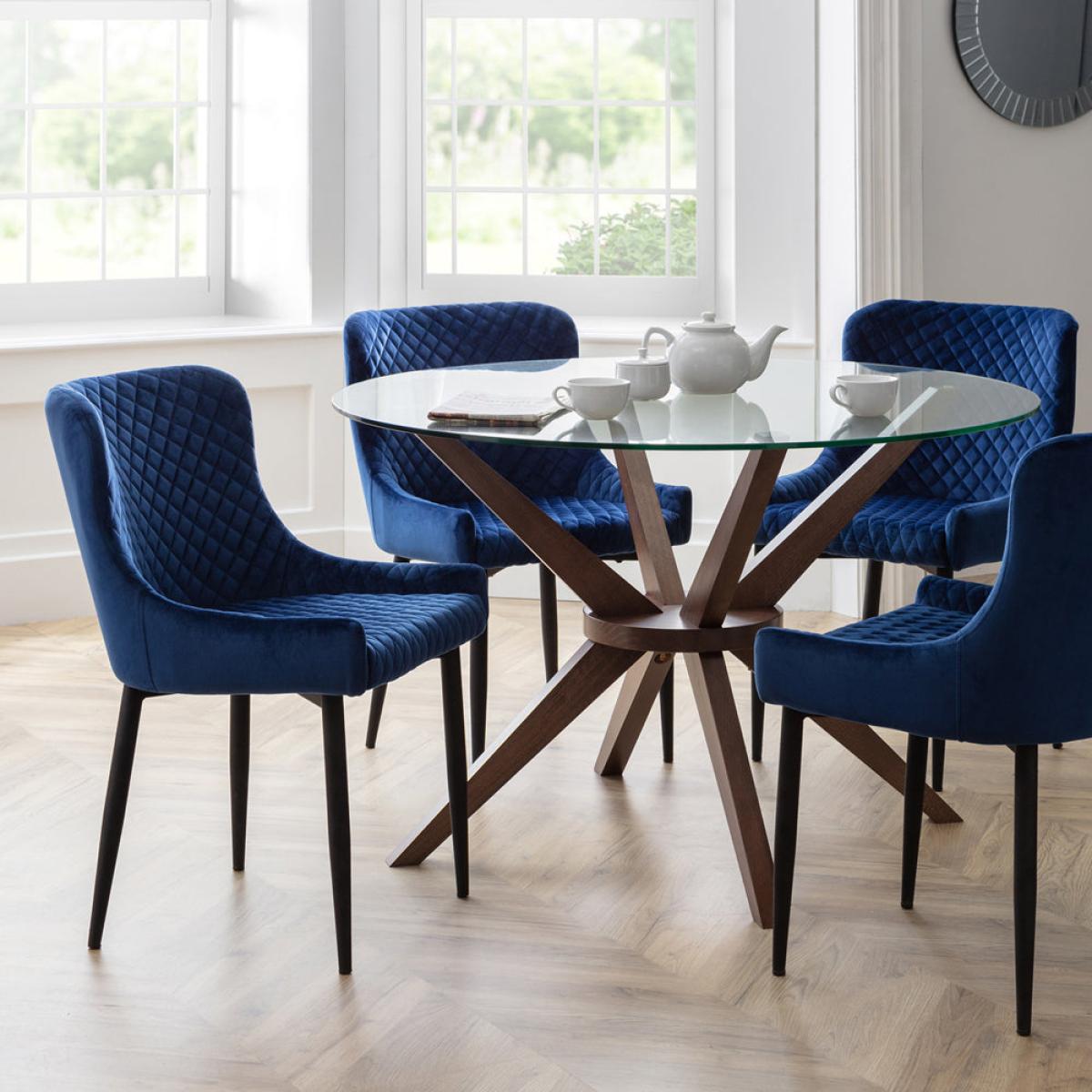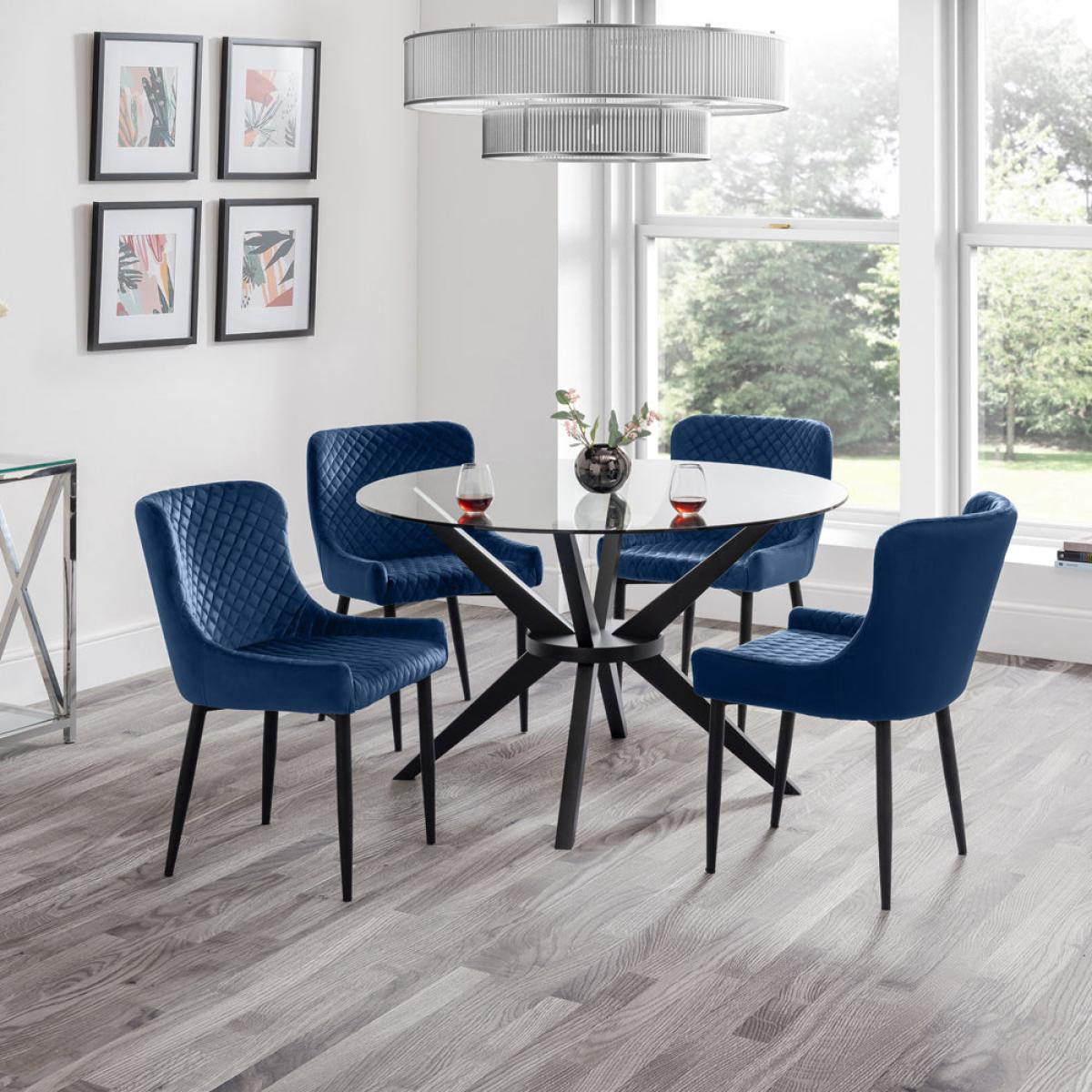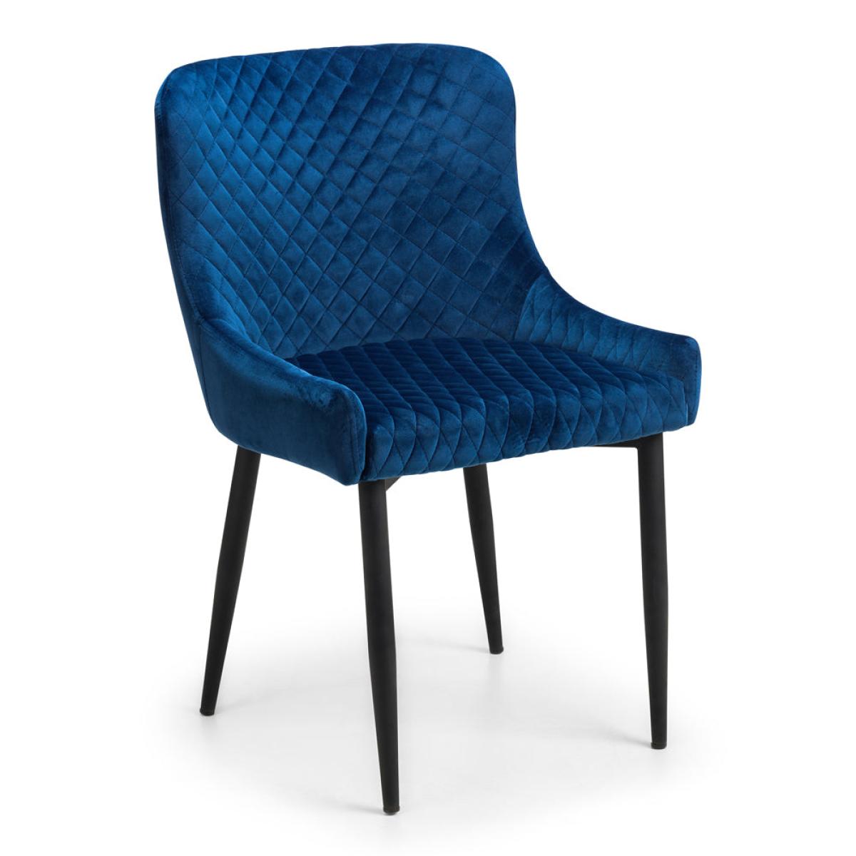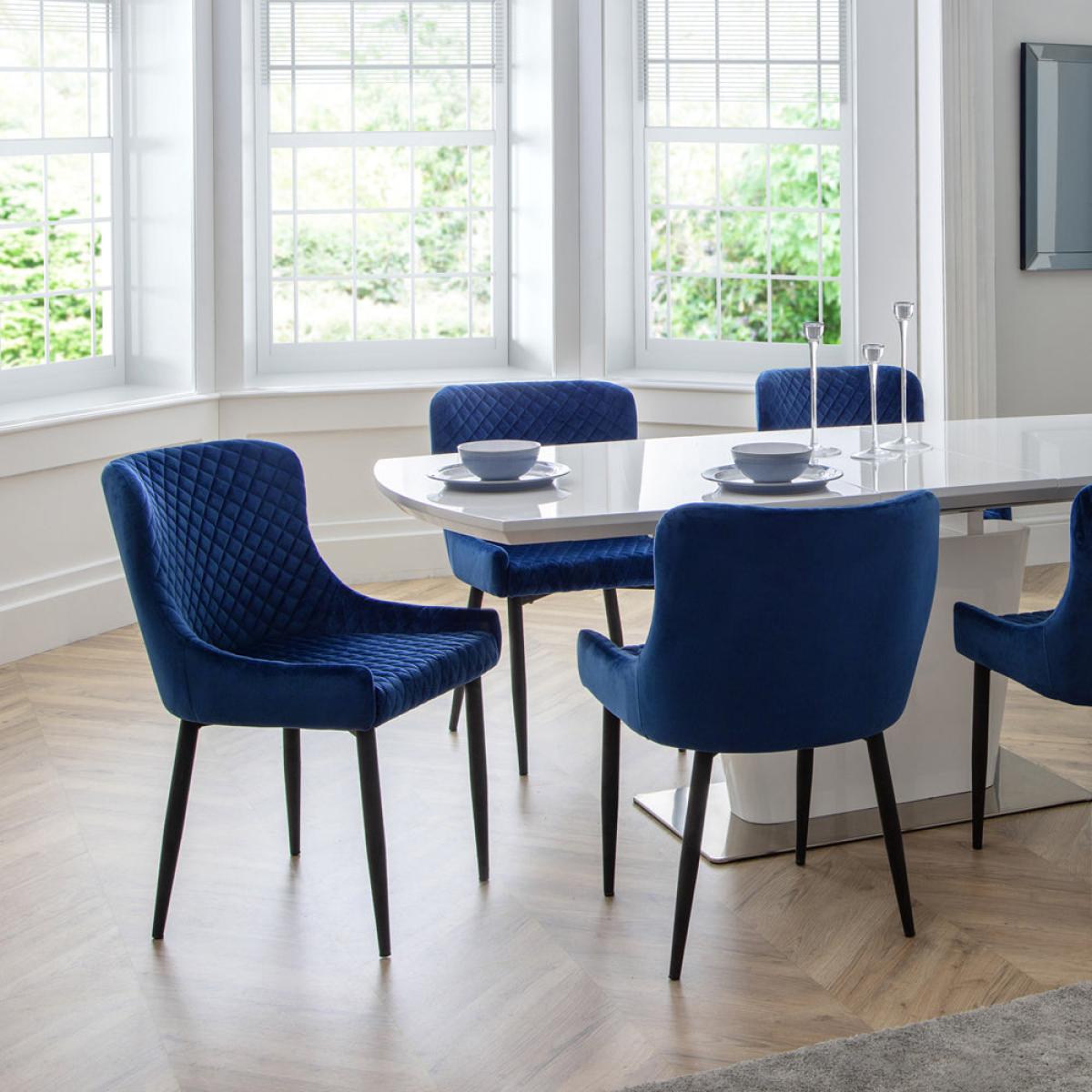 Combining a classic style with a modern twist, the Set of 2 velvet dining chair is beautifully upholstered in a blue velvet fabric with luxurious quilted detailing. Featuring contemporary black pai. View More. Combining a classic style with a modern twist, the Set of 2 velvet dining chair is beautifully upholstered in a blue velvet fabric with luxurious quilted detailing. Featuring contemporary black painted legs, this dining chair adds a touch of elegance to any dining area.