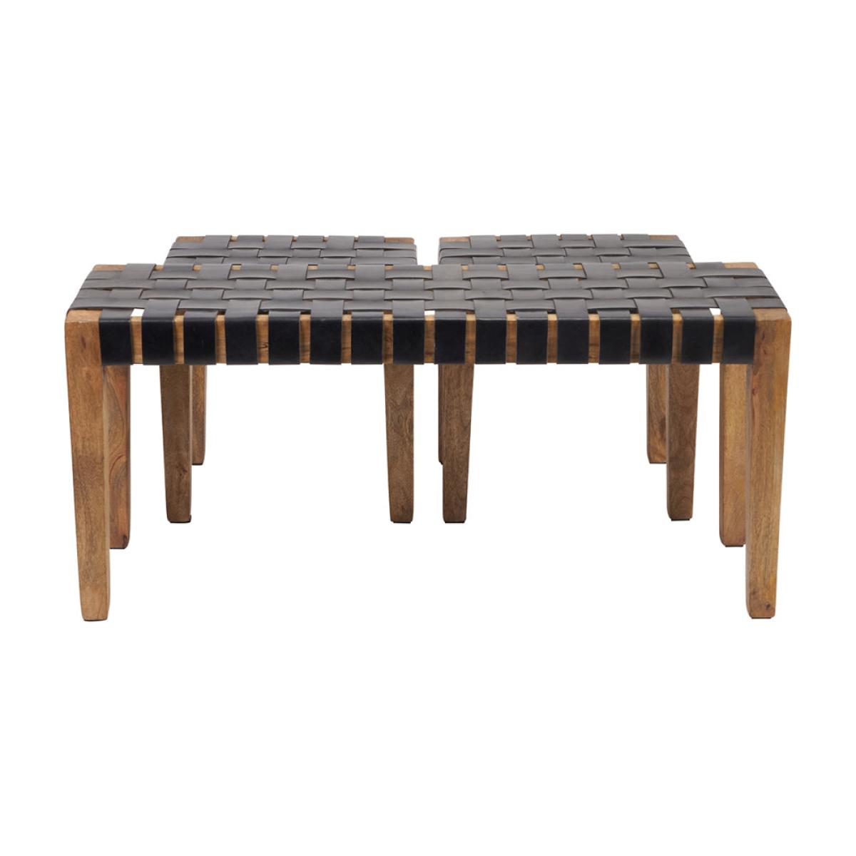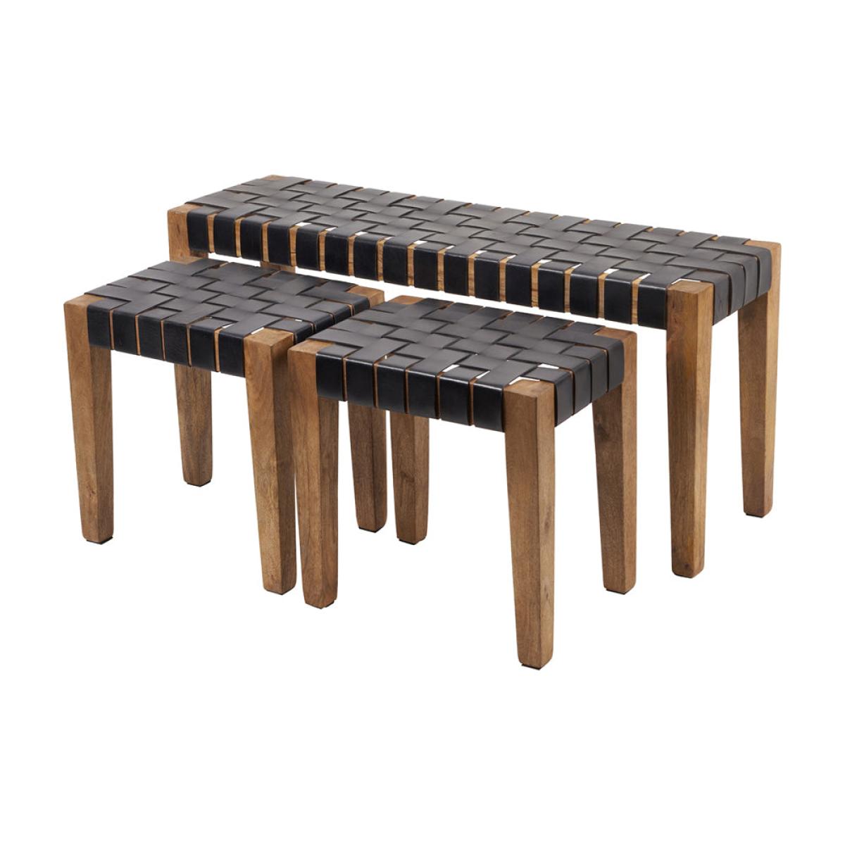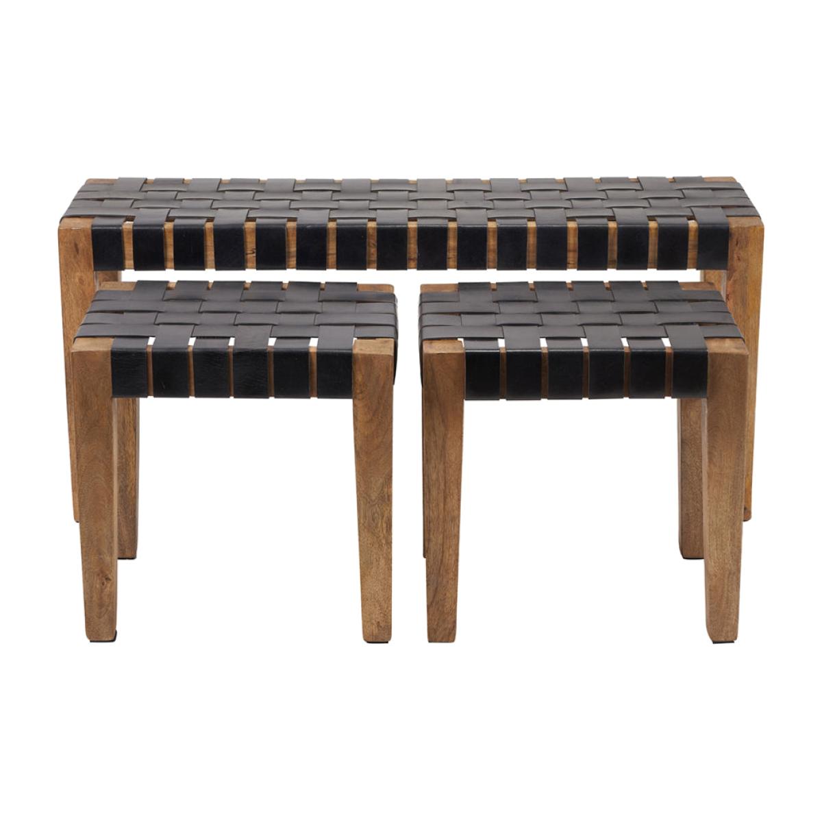 This contemporary set of 3; bench and 2 stools in sleek mango wood and black woven leather certainly makes a statement. The black woven leather creates texture and tactility against the strong wooden frame. This set of 3 is perfect for occasional seating in a multitude of rooms and has the advantage of nesting, with the two stools sitting comfortably underneath the bench for a brilliant space saving solution.