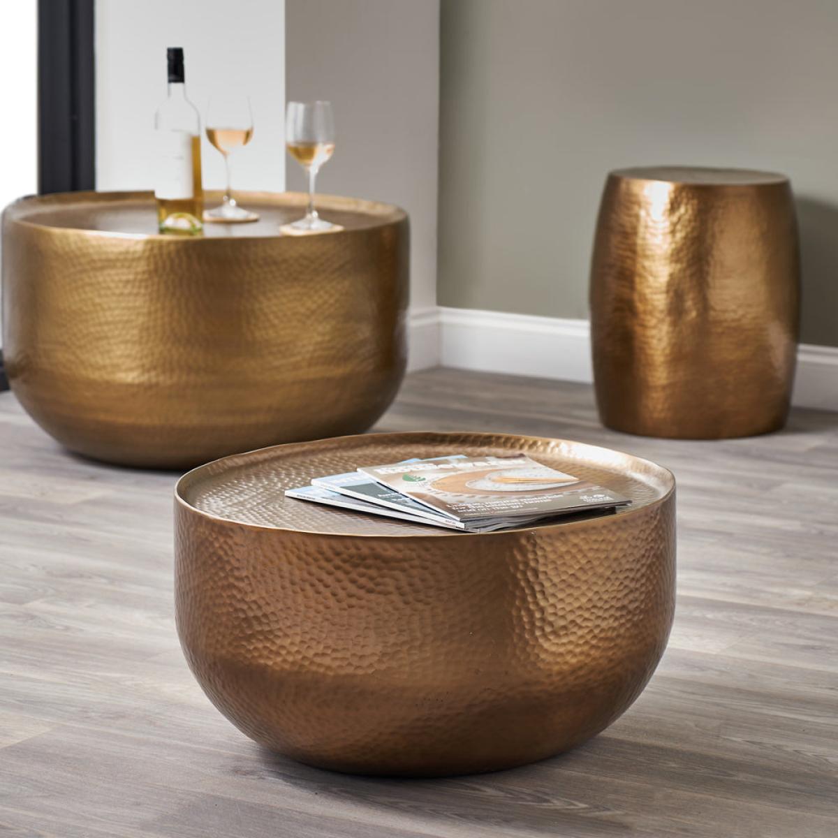 The Sammie Collection includes two sizes of hand-hammered and polished antique brass aluminium tables. These artisanal pieces create a unique focal point in any room. Available in a larger side table.