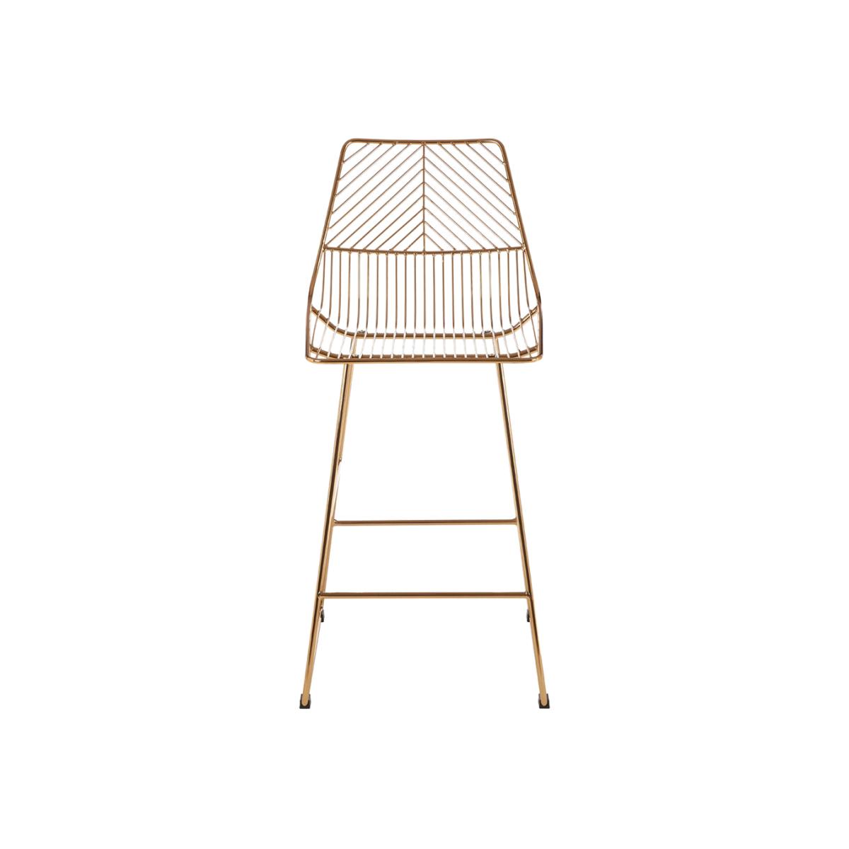 Clean lines define this stunning bar chair from the Soft Industrial Collection. The open metal bars give this item a lightness that will perfectly complement the solidity of a kitchen island or peninsula. The warmth of the gold finish will uplift any space and will work particularly well against neutrals such as black and white. The seat tapers gracefully down and out to give an eye-pleasing silhouette, while the legs continue the linear form down from the seat and are finished with rubber ends for stability and protection. This chair is 101cm high, with a width of 47cm and a depth of 56cm. Dimensions: H: 101 x W: 47 x D: 56 cm Materials: Metal Assembly Required:Yes Care Instructions:Wipe clean with a damp cloth. Do not use abrasive cleaners