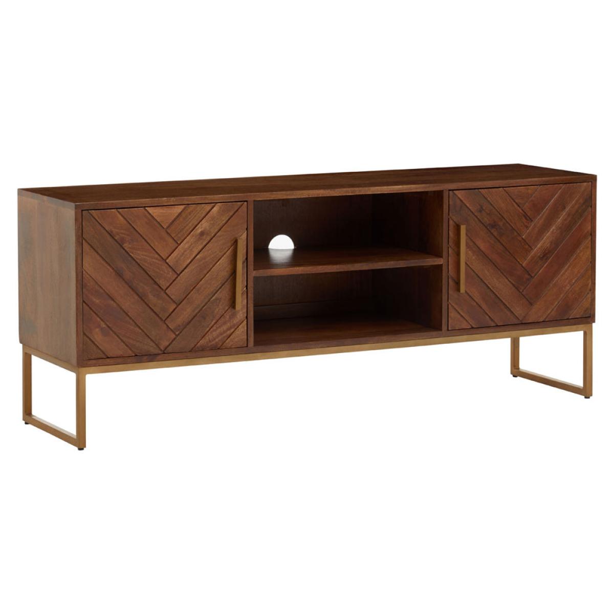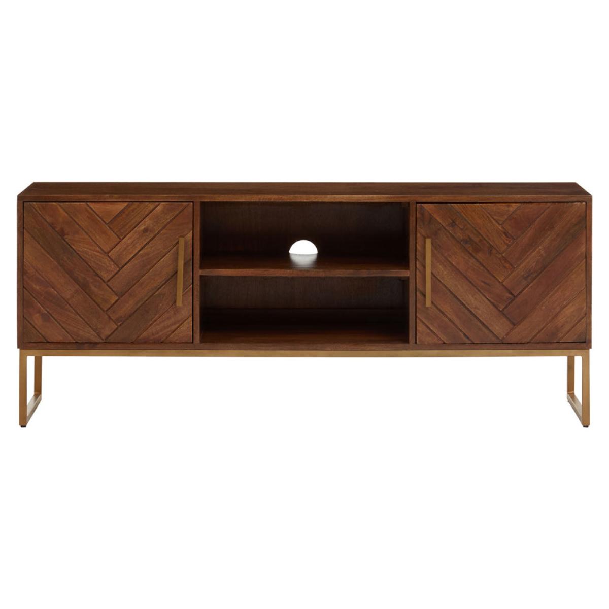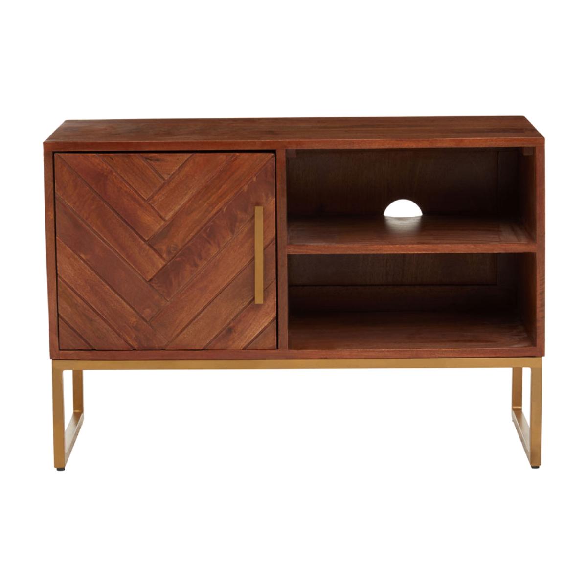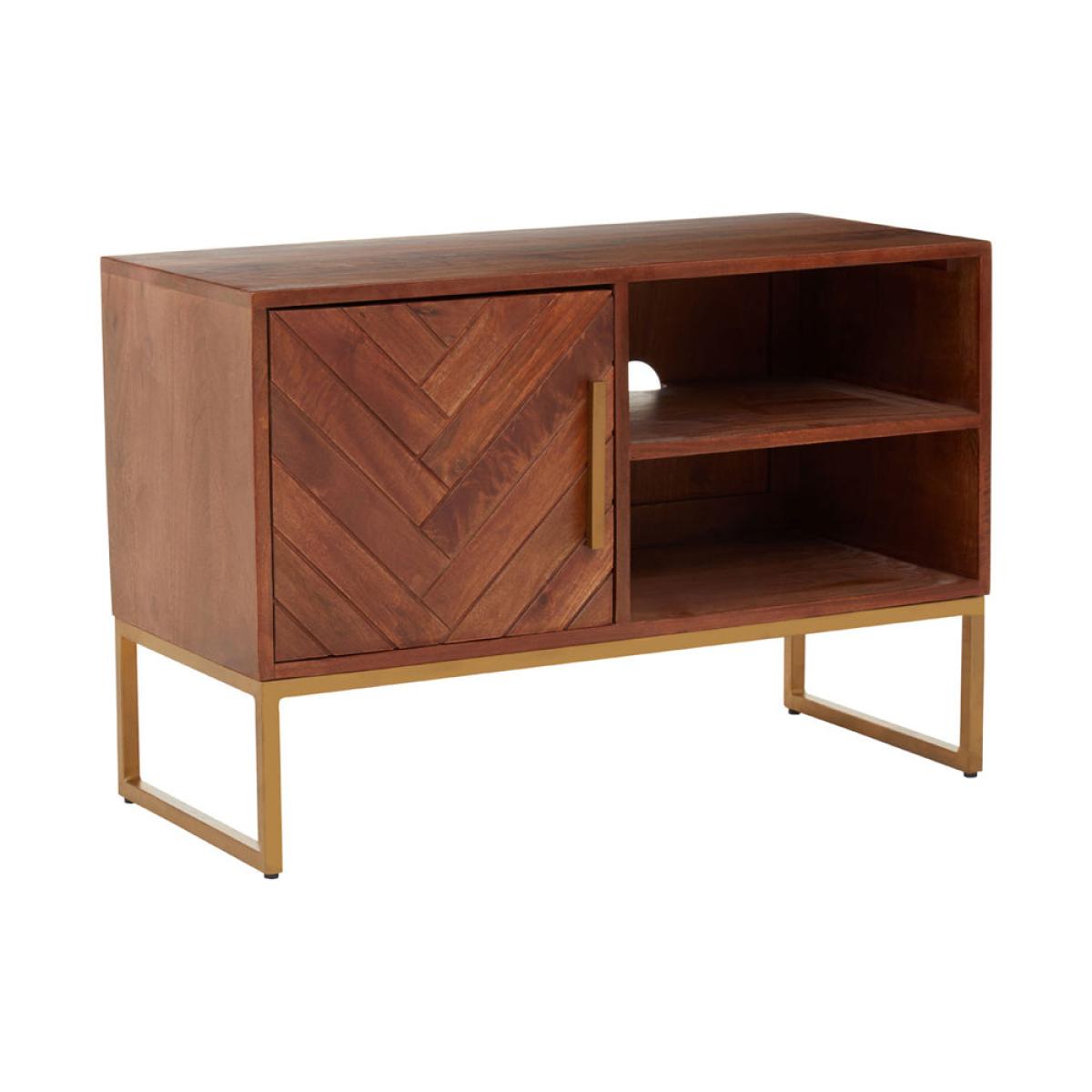 Rich dark wood combines perfectly with gold accents in the mid-century modern-inspired Gaya media unit. A herringbone pattern adorns the front of the unit to add further texture and detail to this stunning piece from Olivia’s Soft Industrial Collection. The unit is divided into two parts- one side boasts a herringbone-patterned cupboard door to keep accessories hidden away, while the other side has two open shelves plus a hole for wires. A brushed gold metal door handle and a gold metal base complete the look. The versatile Gaya media unit provides a neat, tidy and stylish place to display your television and its accessories. Dimensions: Small - H: 60 x W: 90 x D: 40 cm Large - H: 60 x W: 150 x D: 40 cm Materials: Wood, Metal Assembly Required: No Care Instructions:Wipe with damp cloth, do not use abrasive cleaner