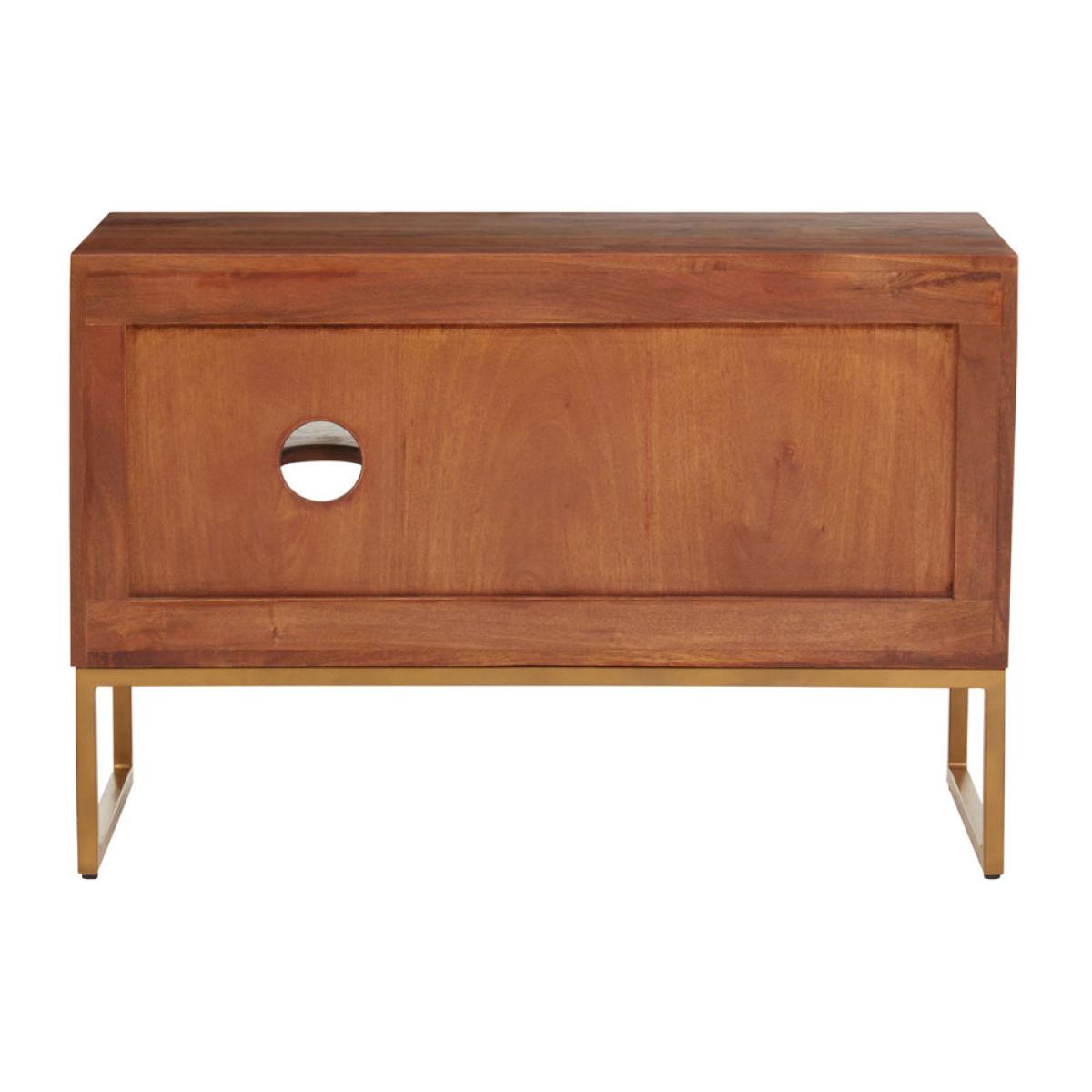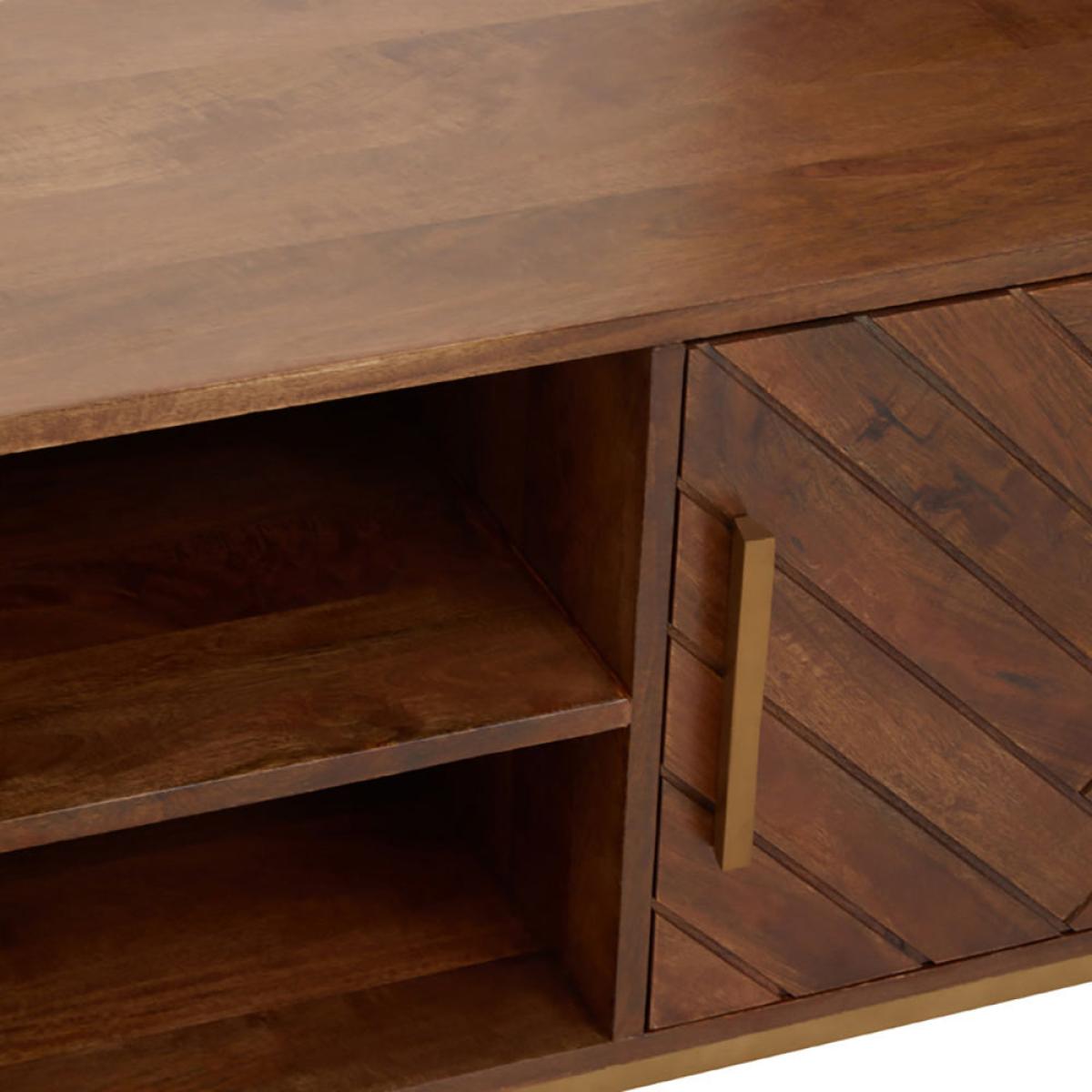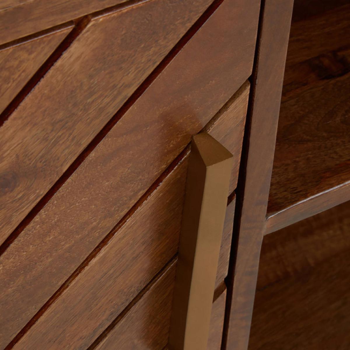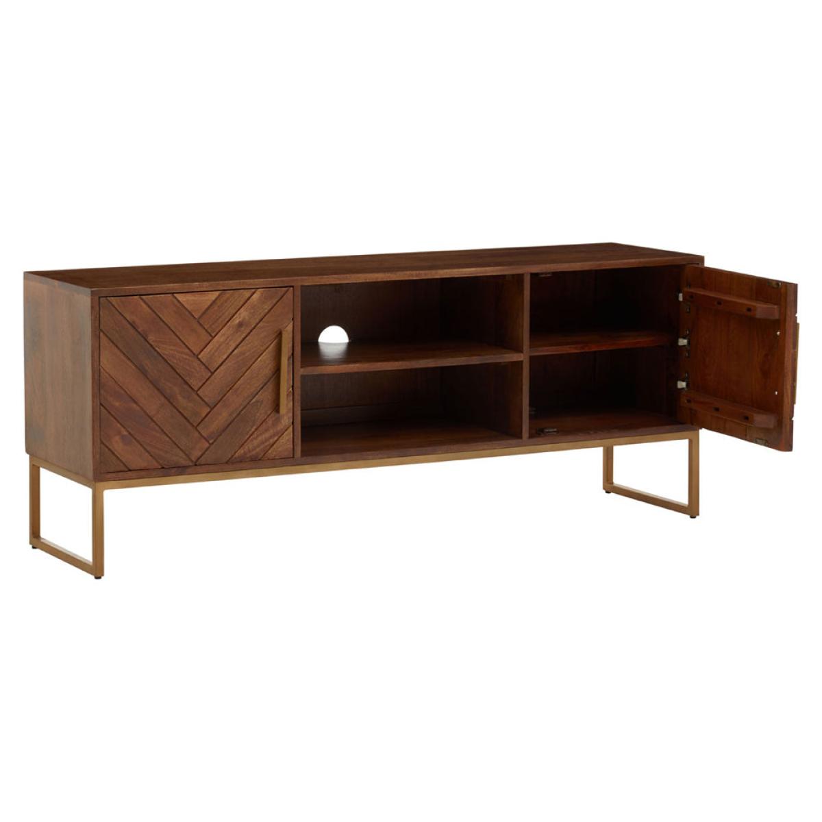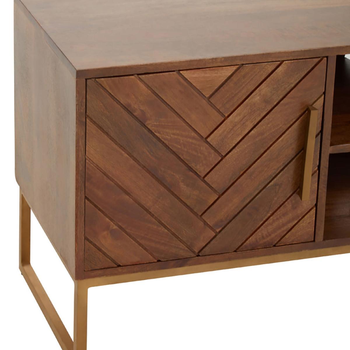 Rich dark wood combines perfectly with gold accents in the mid-century modern-inspired Gaya media unit. A herringbone pattern adorns the front of the unit to add further texture and detail to this stunning piece from Olivia’s Soft Industrial Collection. The unit is divided into two parts- one side boasts a herringbone-patterned cupboard door to keep accessories hidden away, while the other side has two open shelves plus a hole for wires. A brushed gold metal door handle and a gold metal base complete the look. The versatile Gaya media unit provides a neat, tidy and stylish place to display your television and its accessories. Dimensions: Small - H: 60 x W: 90 x D: 40 cm Large - H: 60 x W: 150 x D: 40 cm Materials: Wood, Metal Assembly Required: No Care Instructions:Wipe with damp cloth, do not use abrasive cleaner