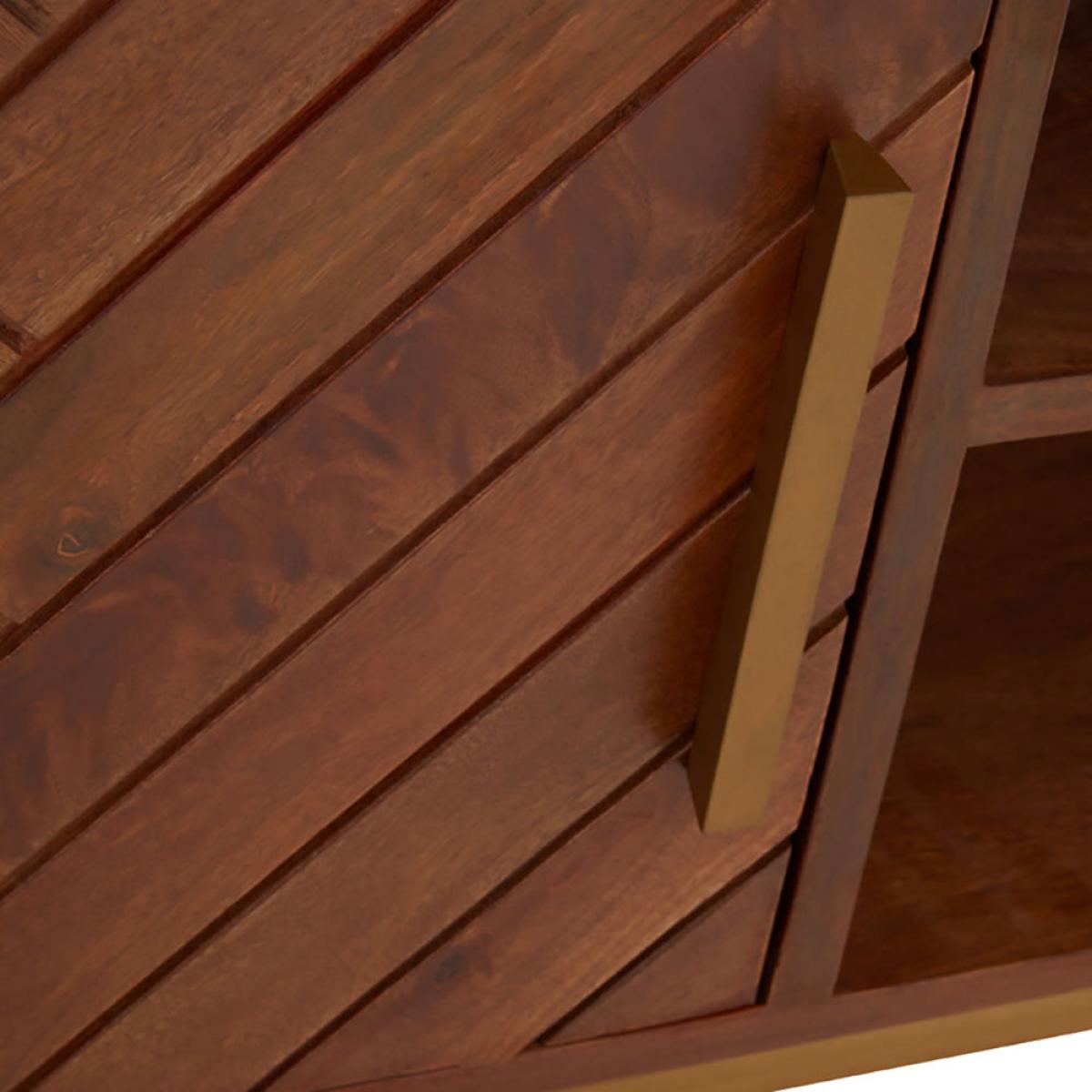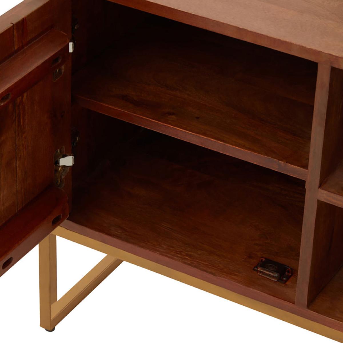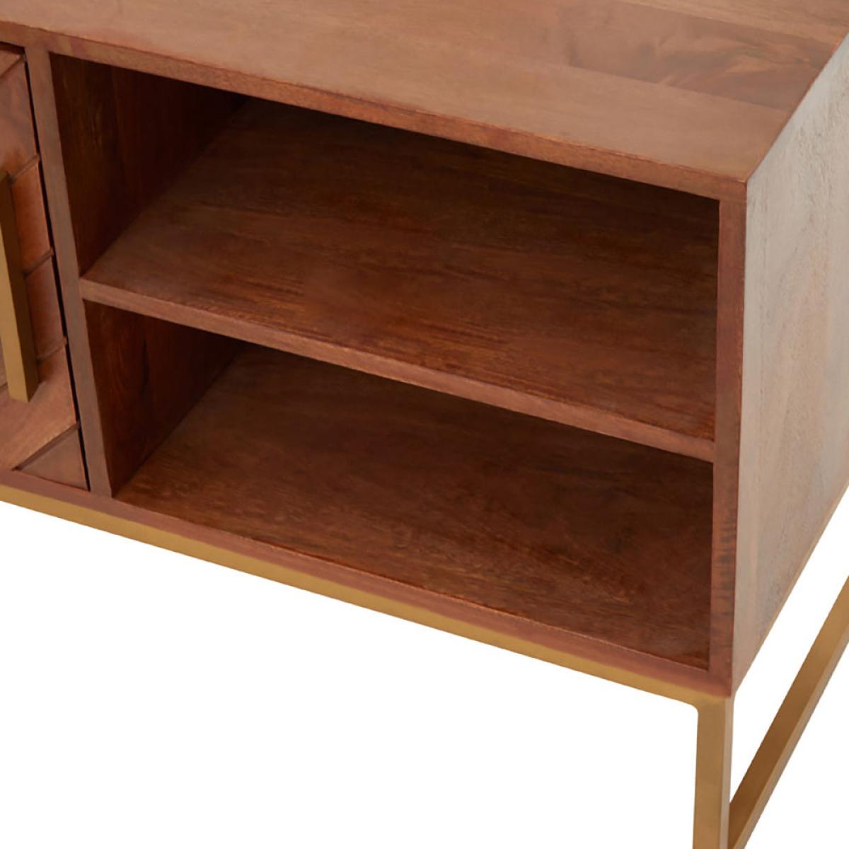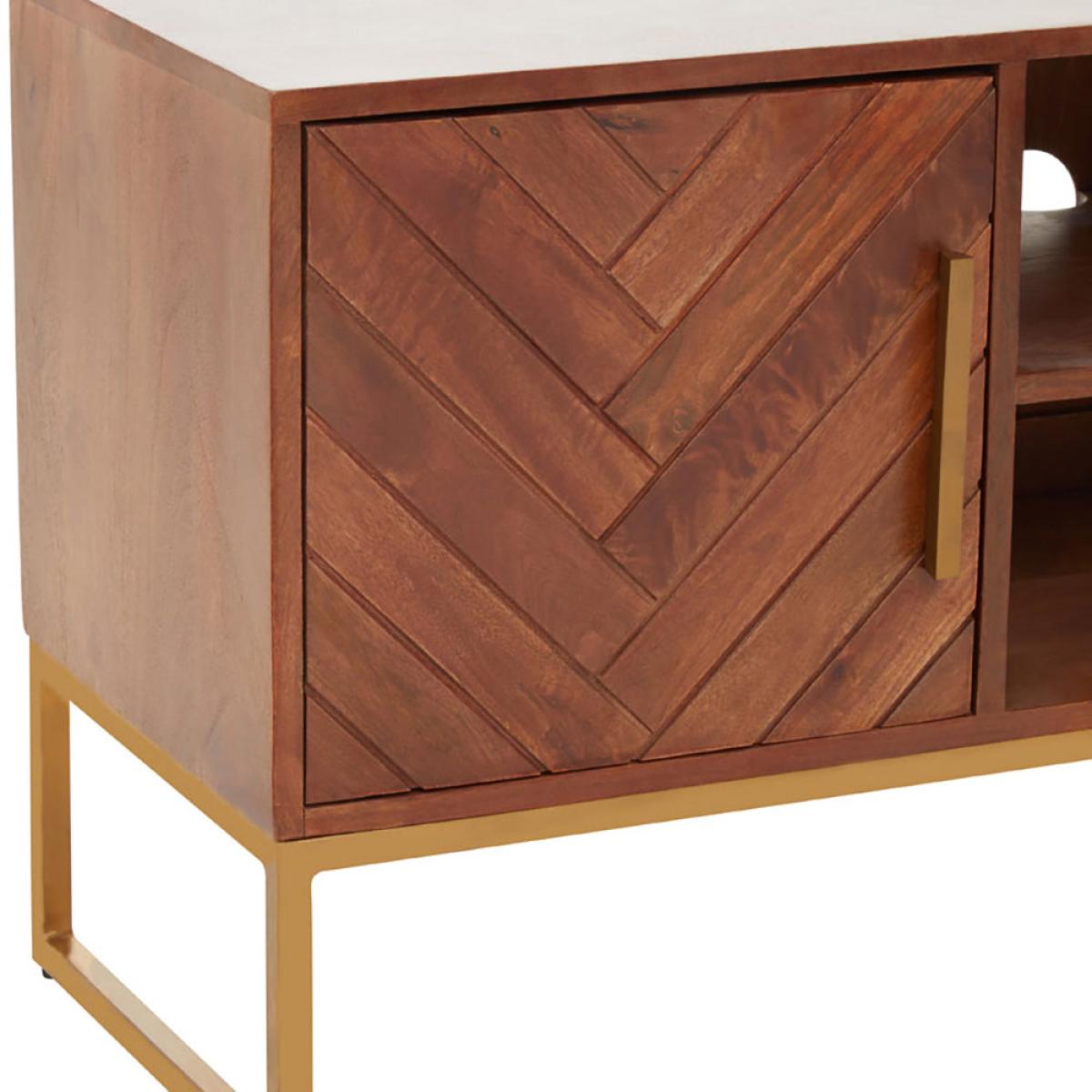 Rich dark wood combines perfectly with gold accents in the mid-century modern-inspired Gaya media unit. A herringbone pattern adorns the front of the unit to add further texture and detail to this stunning piece from Olivia’s Soft Industrial Collection. The unit is divided into two parts- one side boasts a herringbone-patterned cupboard door to keep accessories hidden away, while the other side has two open shelves plus a hole for wires. A brushed gold metal door handle and a gold metal base complete the look. The versatile Gaya media unit provides a neat, tidy and stylish place to display your television and its accessories. Dimensions: Small - H: 60 x W: 90 x D: 40 cm Large - H: 60 x W: 150 x D: 40 cm Materials: Wood, Metal Assembly Required: No Care Instructions:Wipe with damp cloth, do not use abrasive cleaner