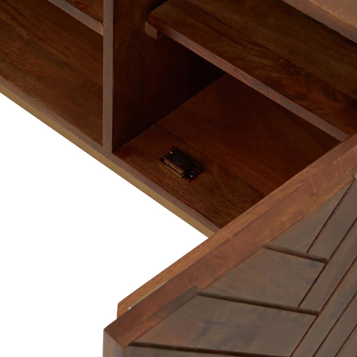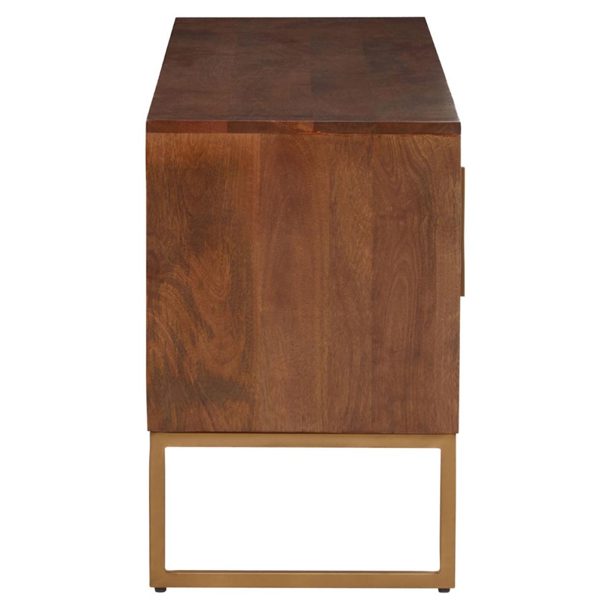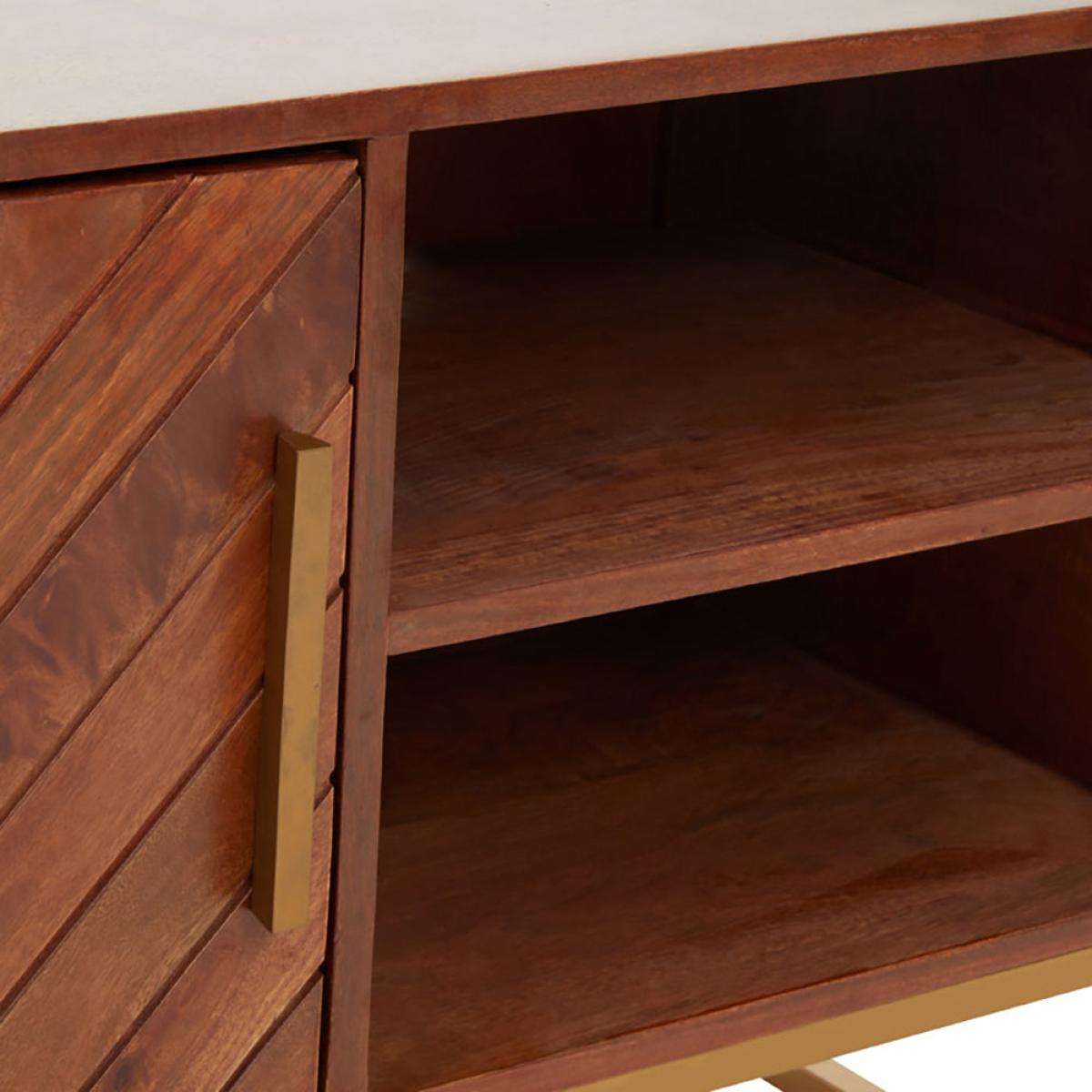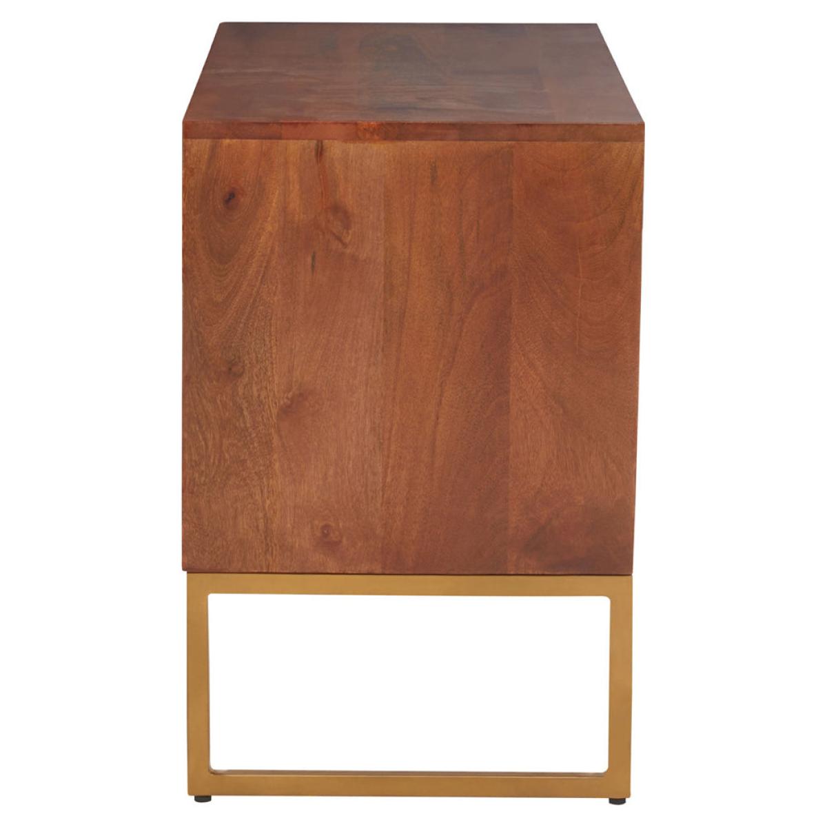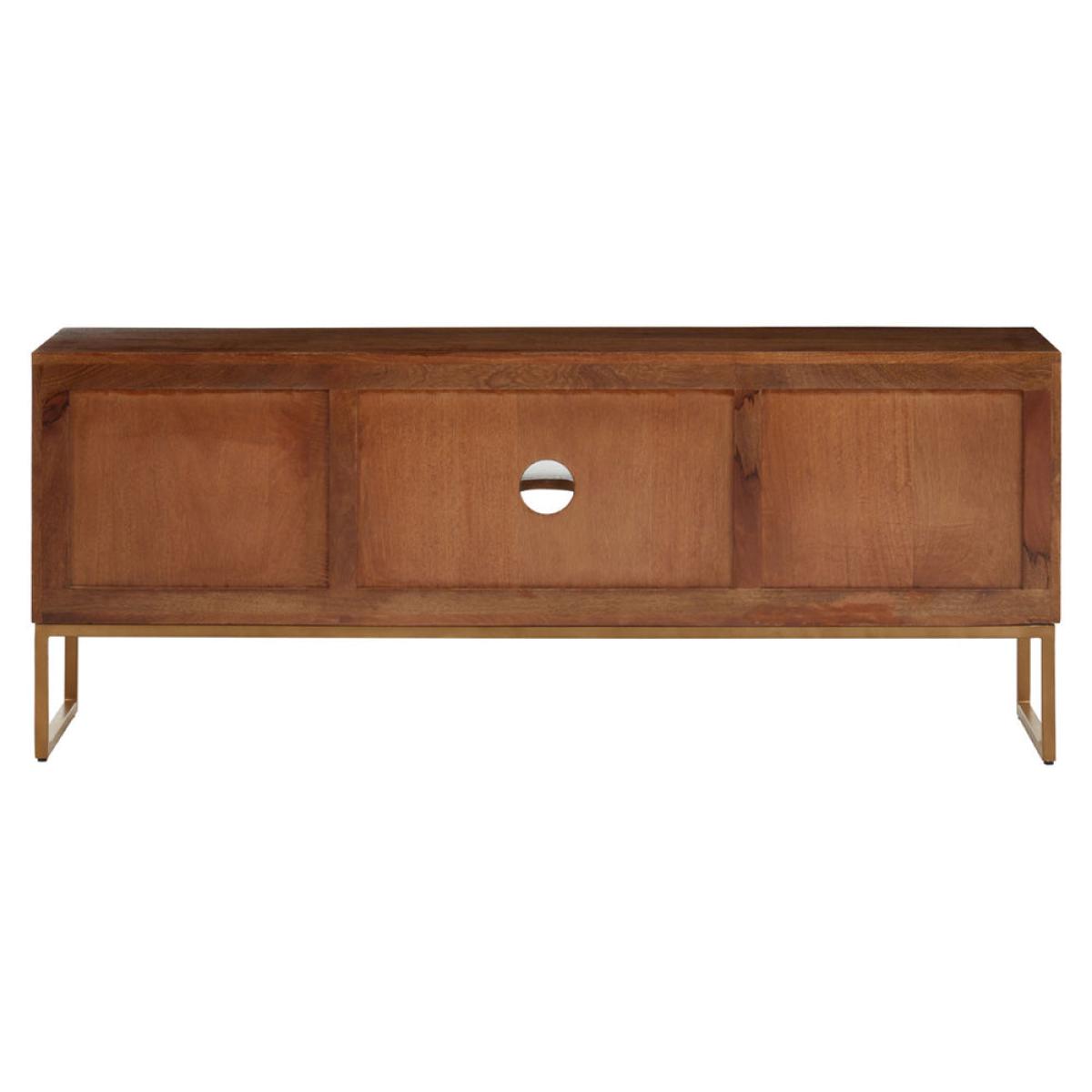 Rich dark wood combines perfectly with gold accents in the mid-century modern-inspired Gaya media unit. A herringbone pattern adorns the front of the unit to add further texture and detail to this stunning piece from Olivia’s Soft Industrial Collection. The unit is divided into two parts- one side boasts a herringbone-patterned cupboard door to keep accessories hidden away, while the other side has two open shelves plus a hole for wires. A brushed gold metal door handle and a gold metal base complete the look. The versatile Gaya media unit provides a neat, tidy and stylish place to display your television and its accessories. Dimensions: Small - H: 60 x W: 90 x D: 40 cm Large - H: 60 x W: 150 x D: 40 cm Materials: Wood, Metal Assembly Required: No Care Instructions:Wipe with damp cloth, do not use abrasive cleaner