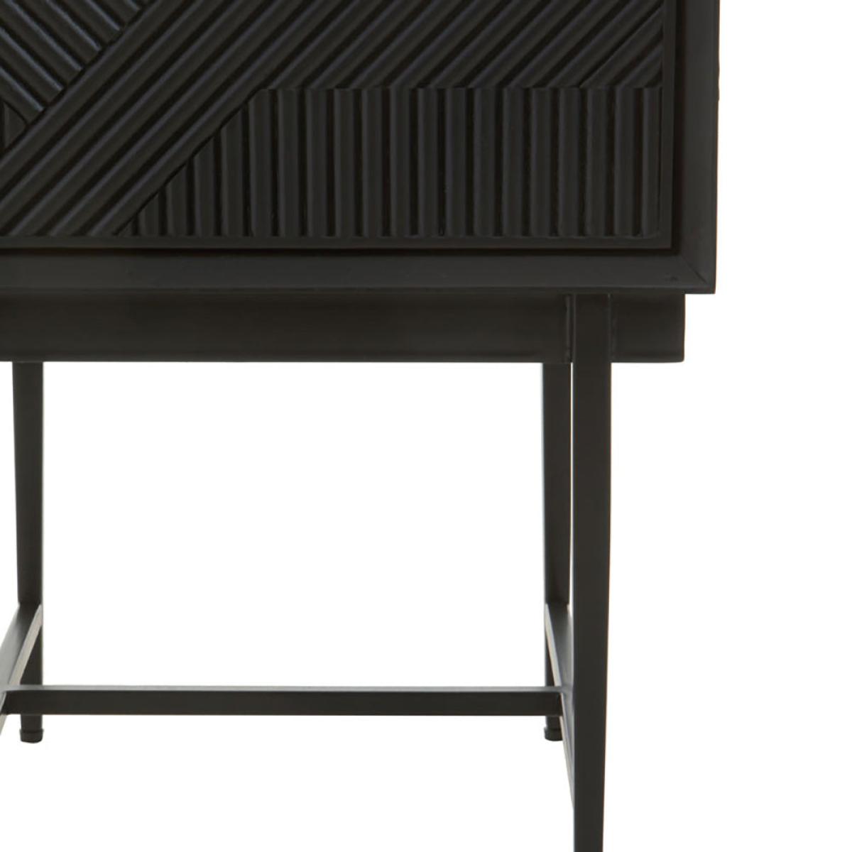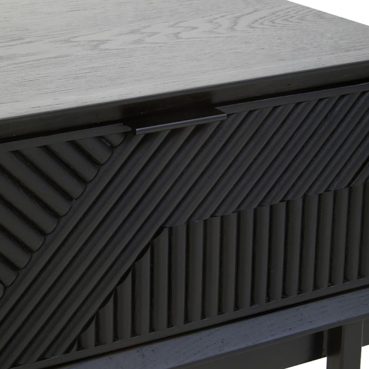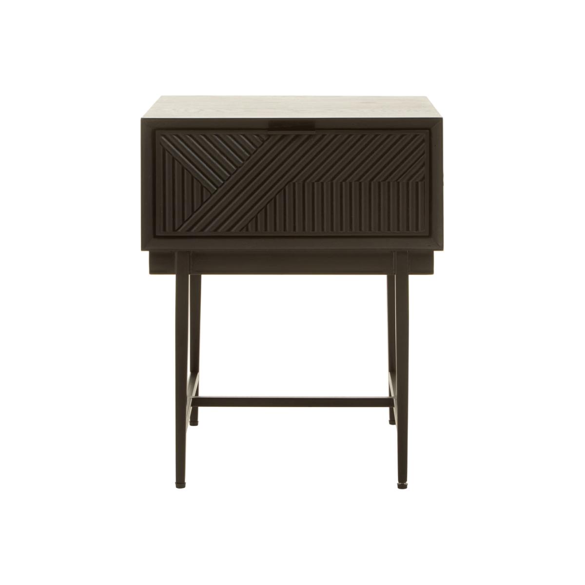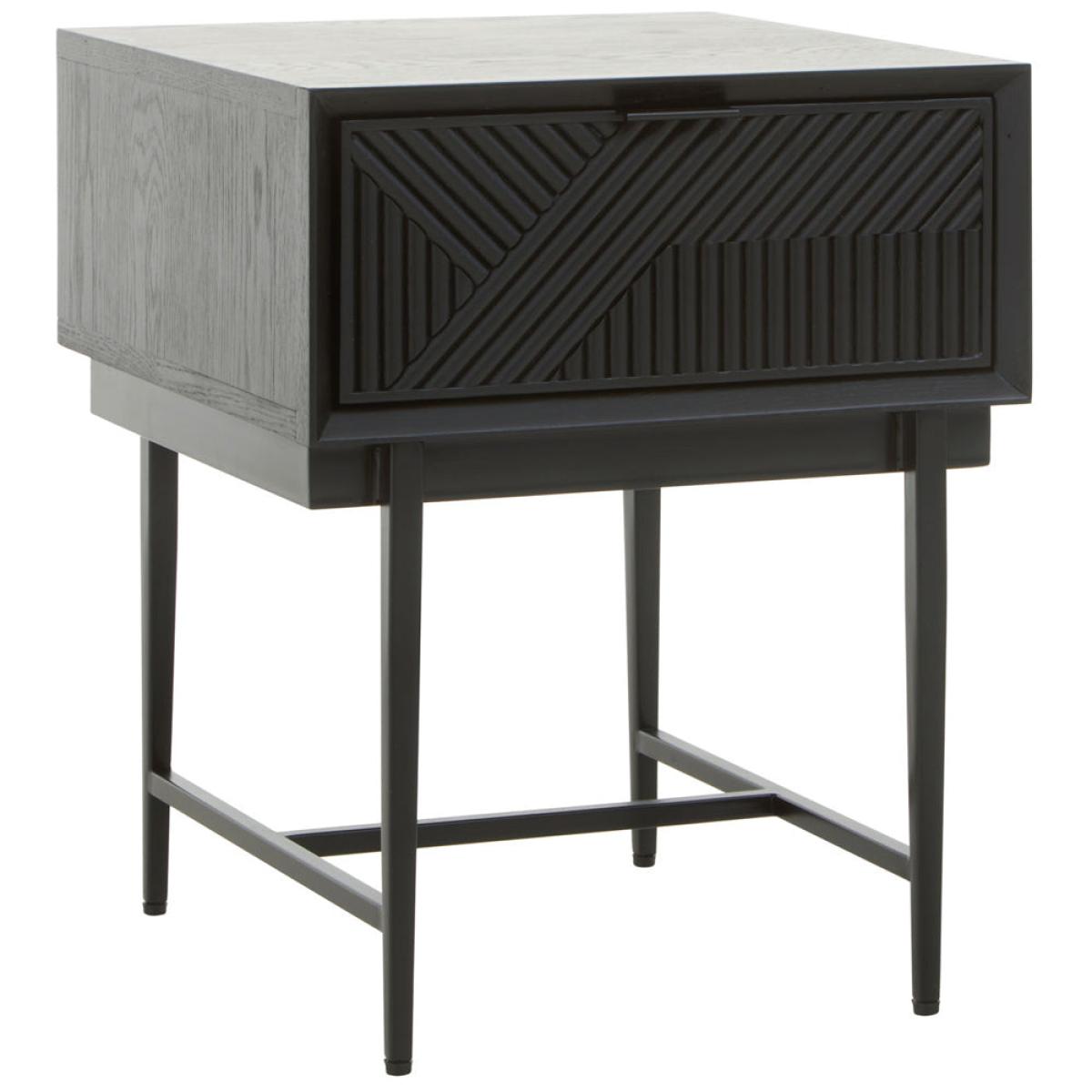 The gorgeous Jakar side table is part of Olivia's Soft Industrial Collection and has a carved effect wooden exterior with a black finish. It features a stylish geometric pattern on the front, giving the piece texture and depth. The top is simple and understated, while the slim black metal legs continue the minimalist theme. A large drawer hides behind the bold front panel, with ample storage space for hiding away everyday clutter. This makes it easy to keep your living space tidy. Perfect for both contemporary and rustic décor styles, the table is 55 cm high, 45 cm wide and 45 cm deep. Dimensions: H: 55 x W: 45 x D: 45 cm Materials: Metal Assembly Required: No Care Instructions: Clean with a soft cloth, do not use abrasive cleaners