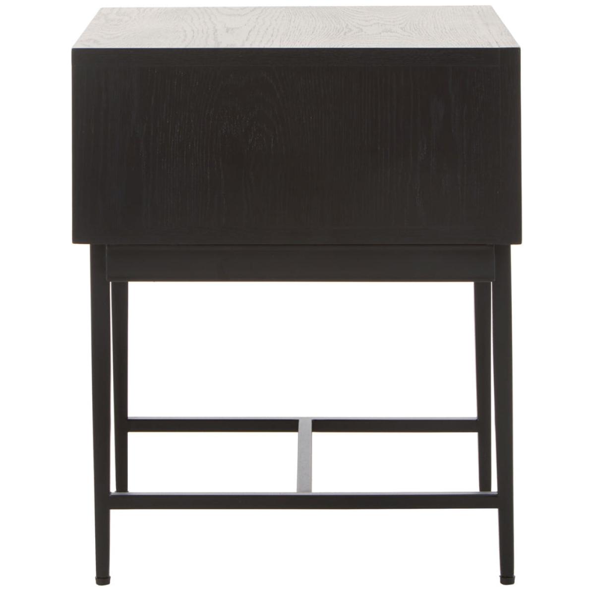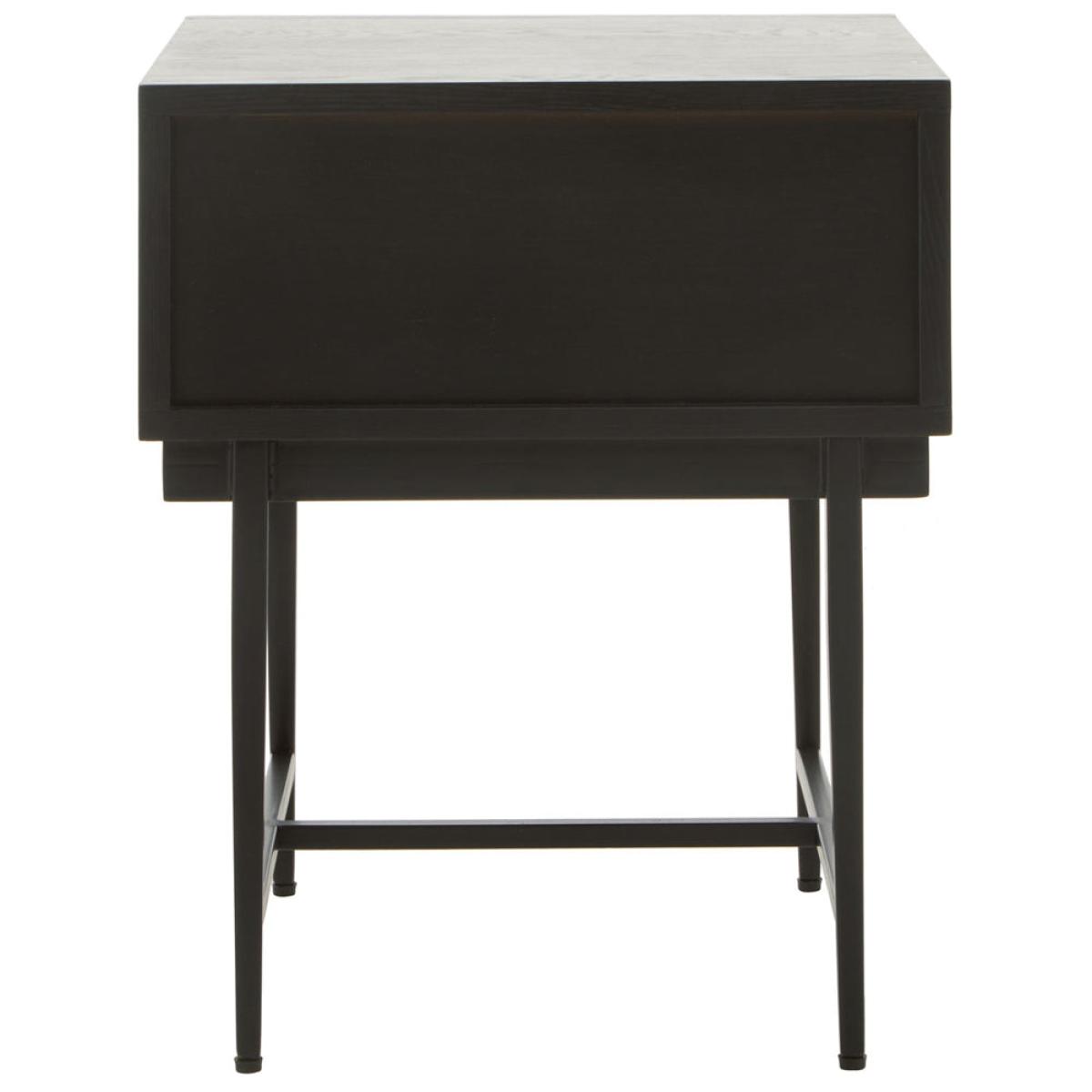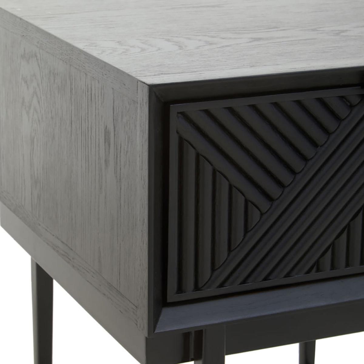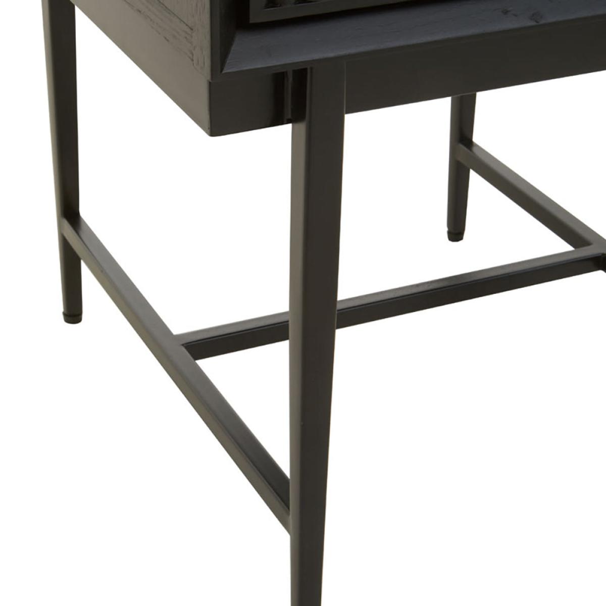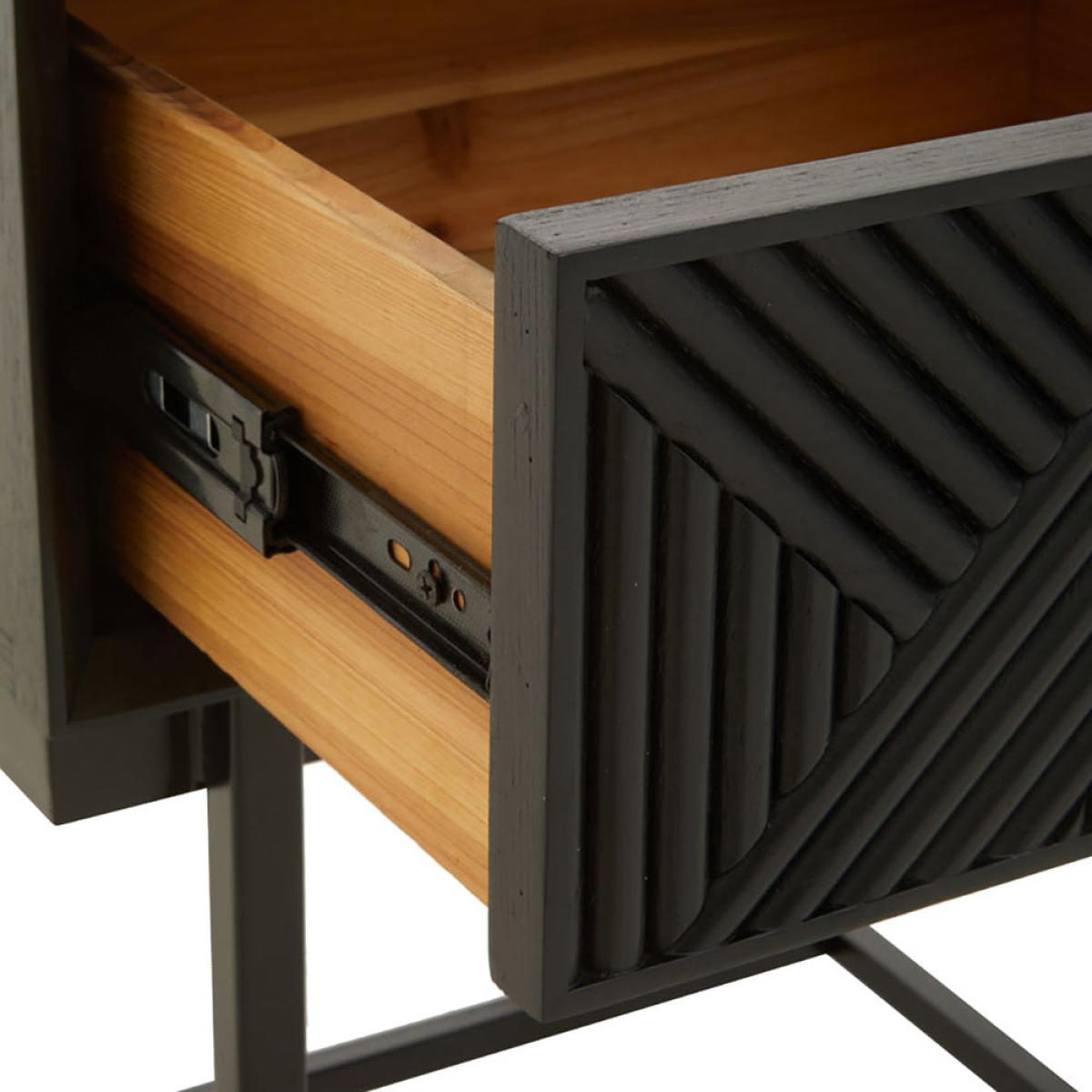 The gorgeous Jakar side table is part of Olivia's Soft Industrial Collection and has a carved effect wooden exterior with a black finish. It features a stylish geometric pattern on the front, giving the piece texture and depth. The top is simple and understated, while the slim black metal legs continue the minimalist theme. A large drawer hides behind the bold front panel, with ample storage space for hiding away everyday clutter. This makes it easy to keep your living space tidy. Perfect for both contemporary and rustic décor styles, the table is 55 cm high, 45 cm wide and 45 cm deep. Dimensions: H: 55 x W: 45 x D: 45 cm Materials: Metal Assembly Required: No Care Instructions: Clean with a soft cloth, do not use abrasive cleaners