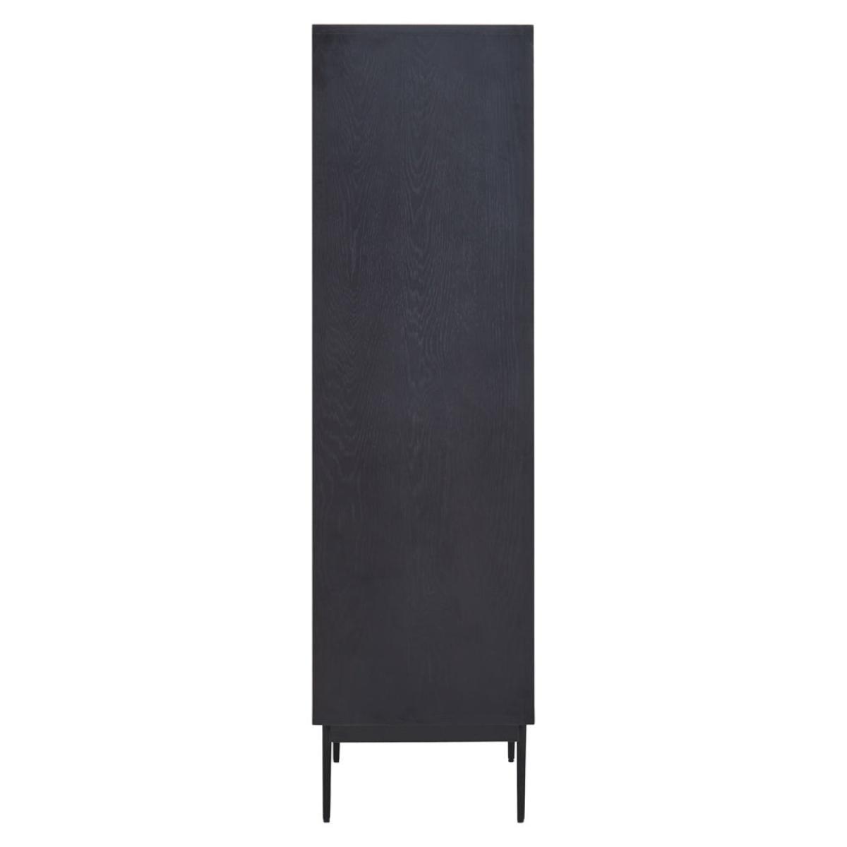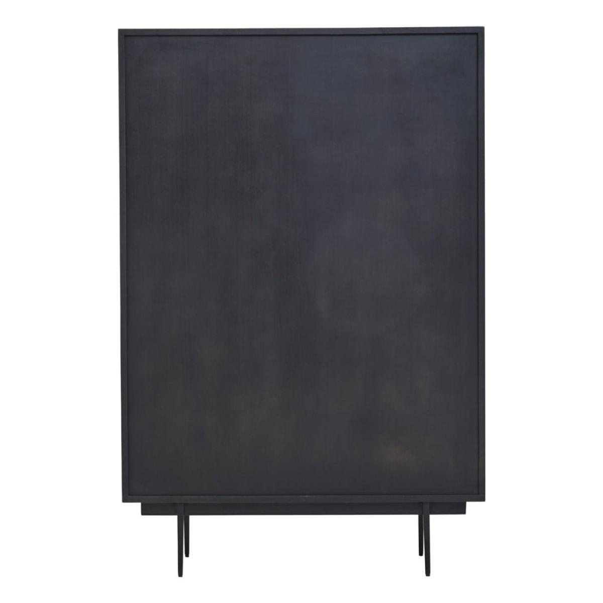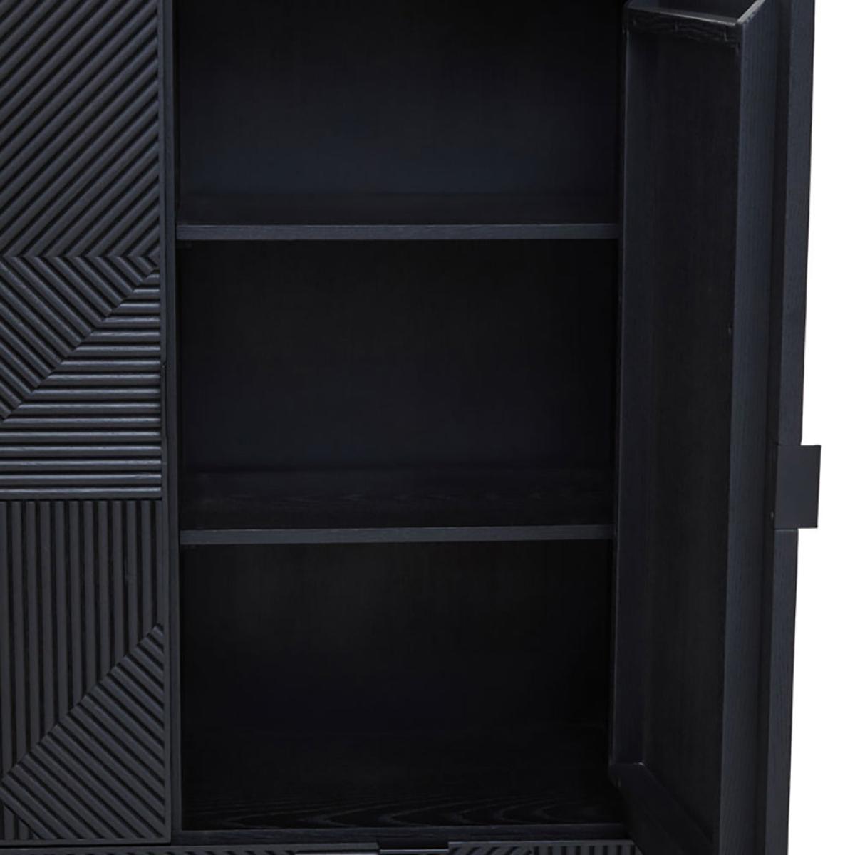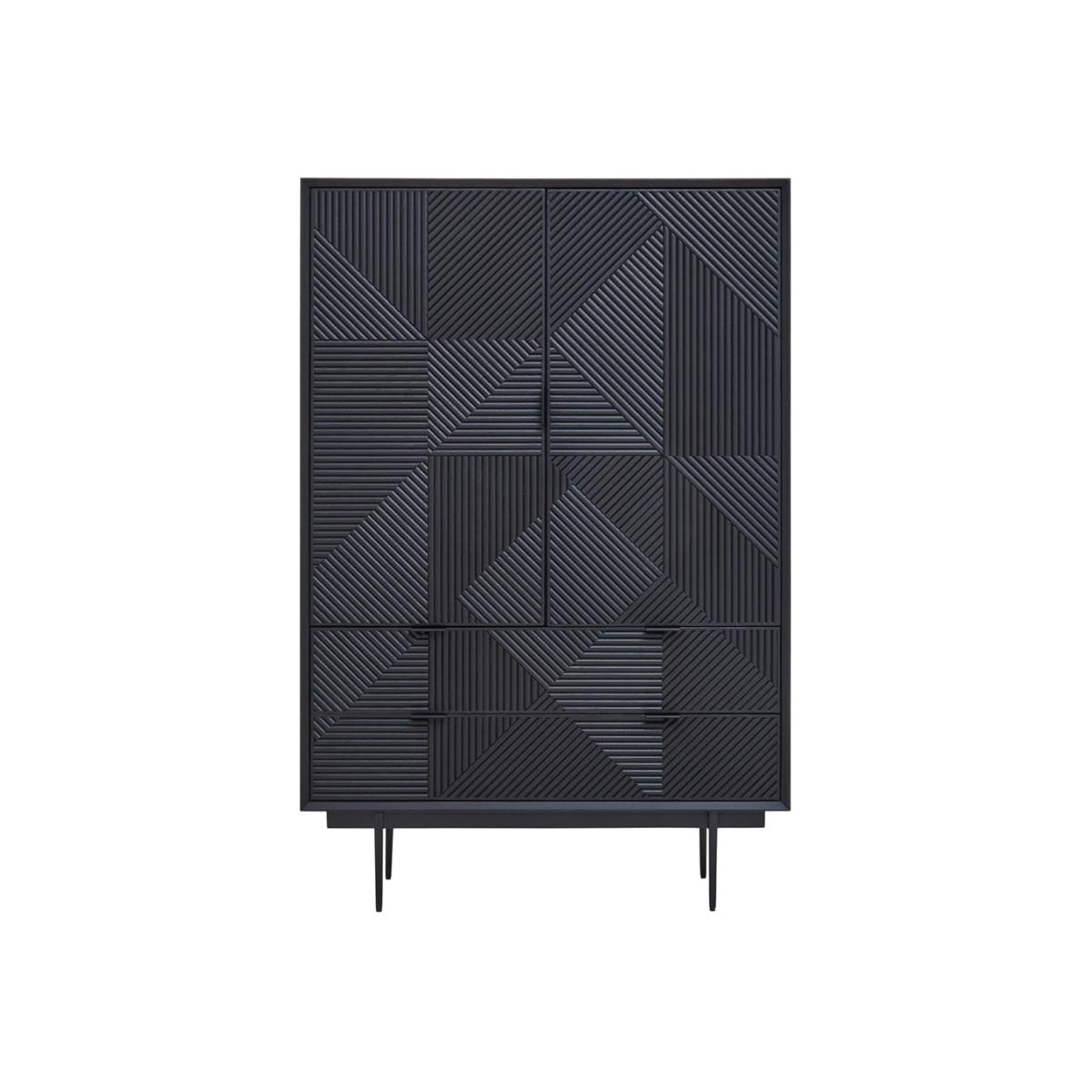 A dramatic merging of mid-century form and modern industrial styling, this Jakar Wooden Cabinet captures the current zeitgeist in modern interiors. The clean lines and solid structure of the body of the cabinet juxtapose perfectly with the delicacy of the tapered legs. Finished in black, the front of the cabinet features grooved panelling set in a geometric pattern that adds interest and texture to the piece. The combination of two large drawers and shelving set behind the cupboard doors ensures that this item will provide plenty of storage as well as style. Dimensions H: 150 x W: 100 x D: 40 cm. Dimensions: H: 150 x W: 100 x D: 40 cm Materials: Metal Assembly Required: No Care Instructions: Clean with a soft cloth, do not use abrasive cleaners