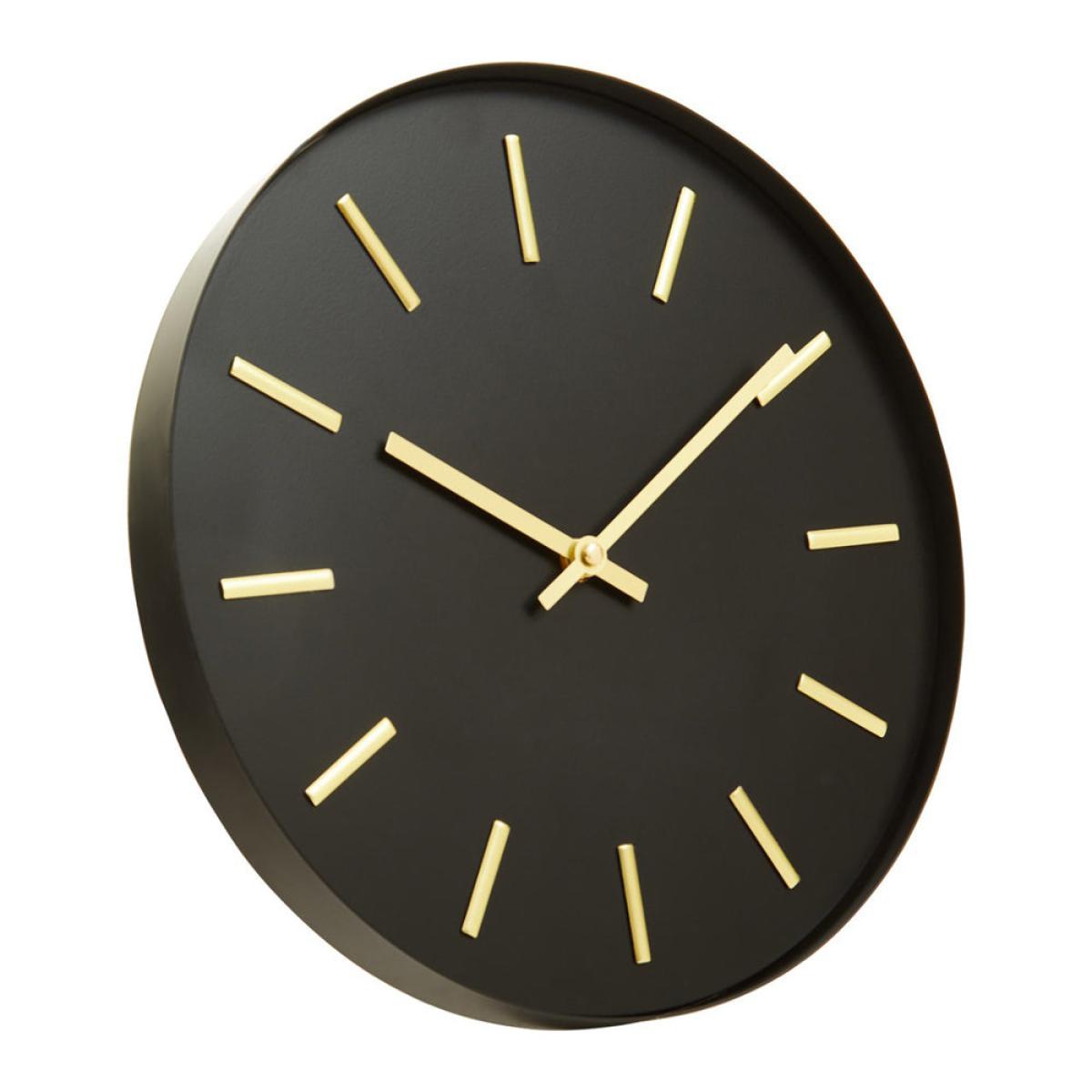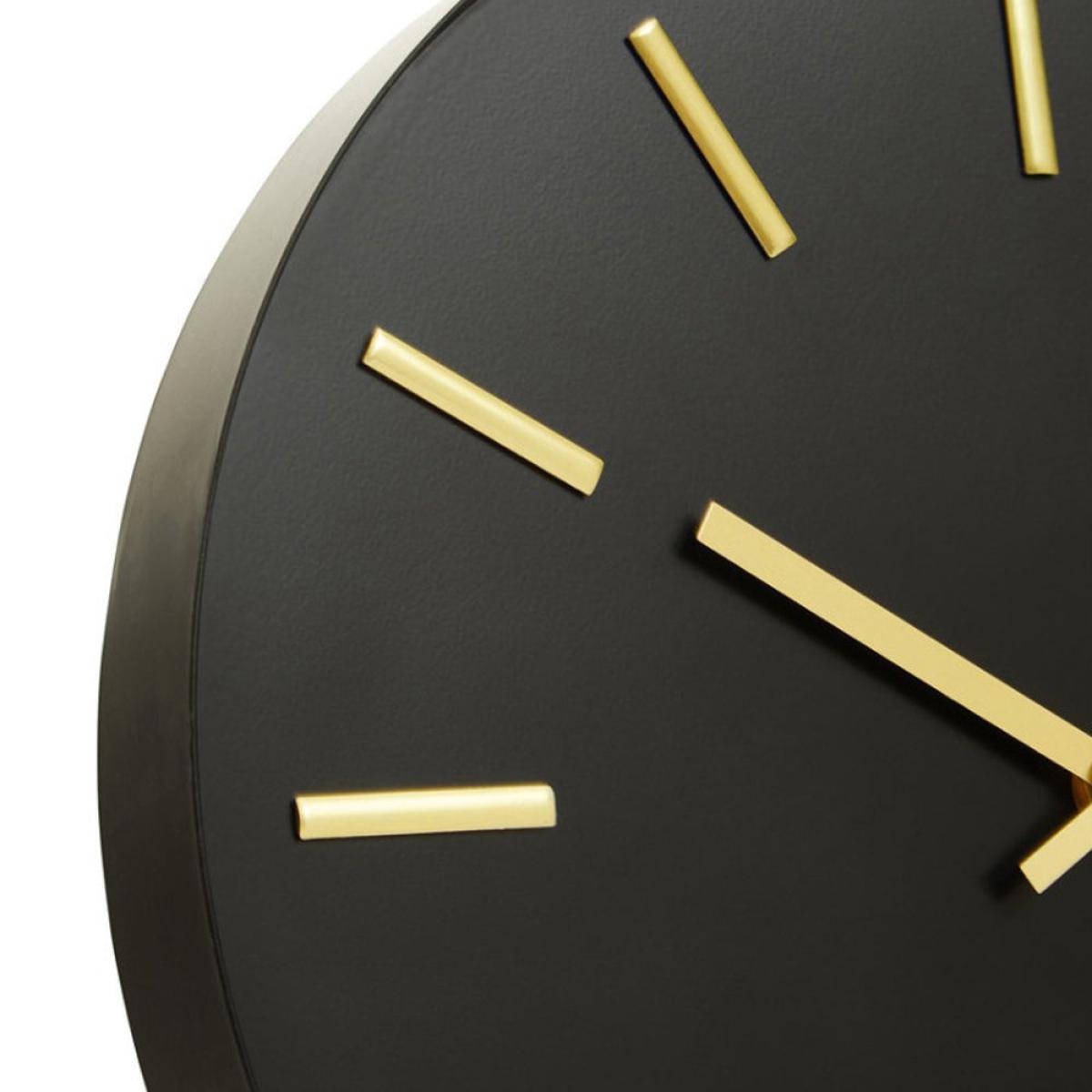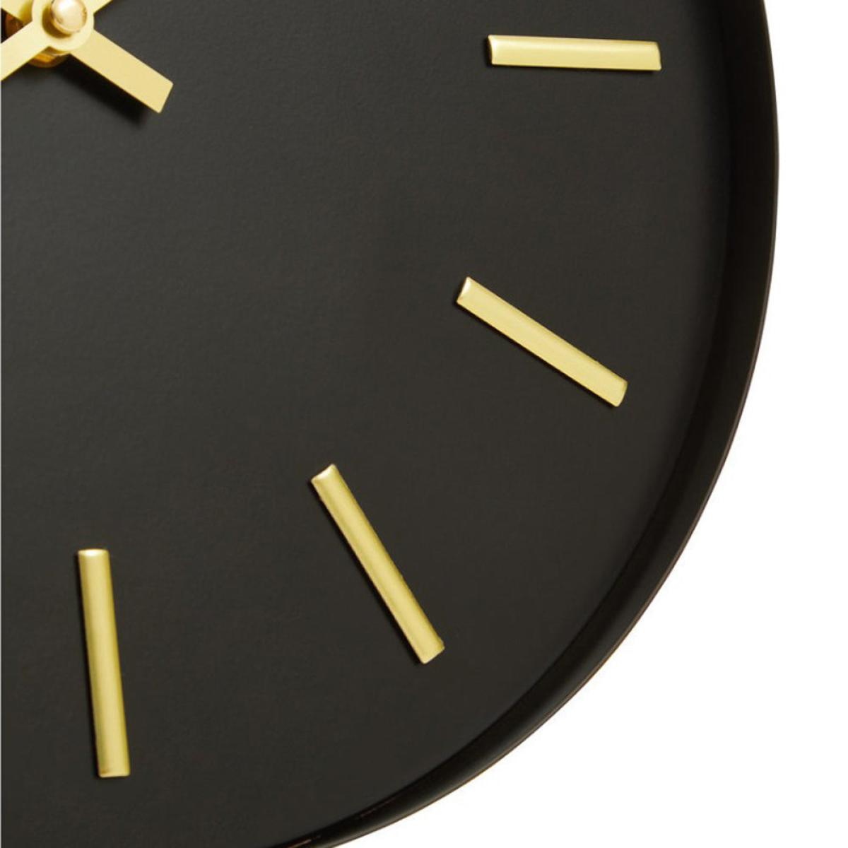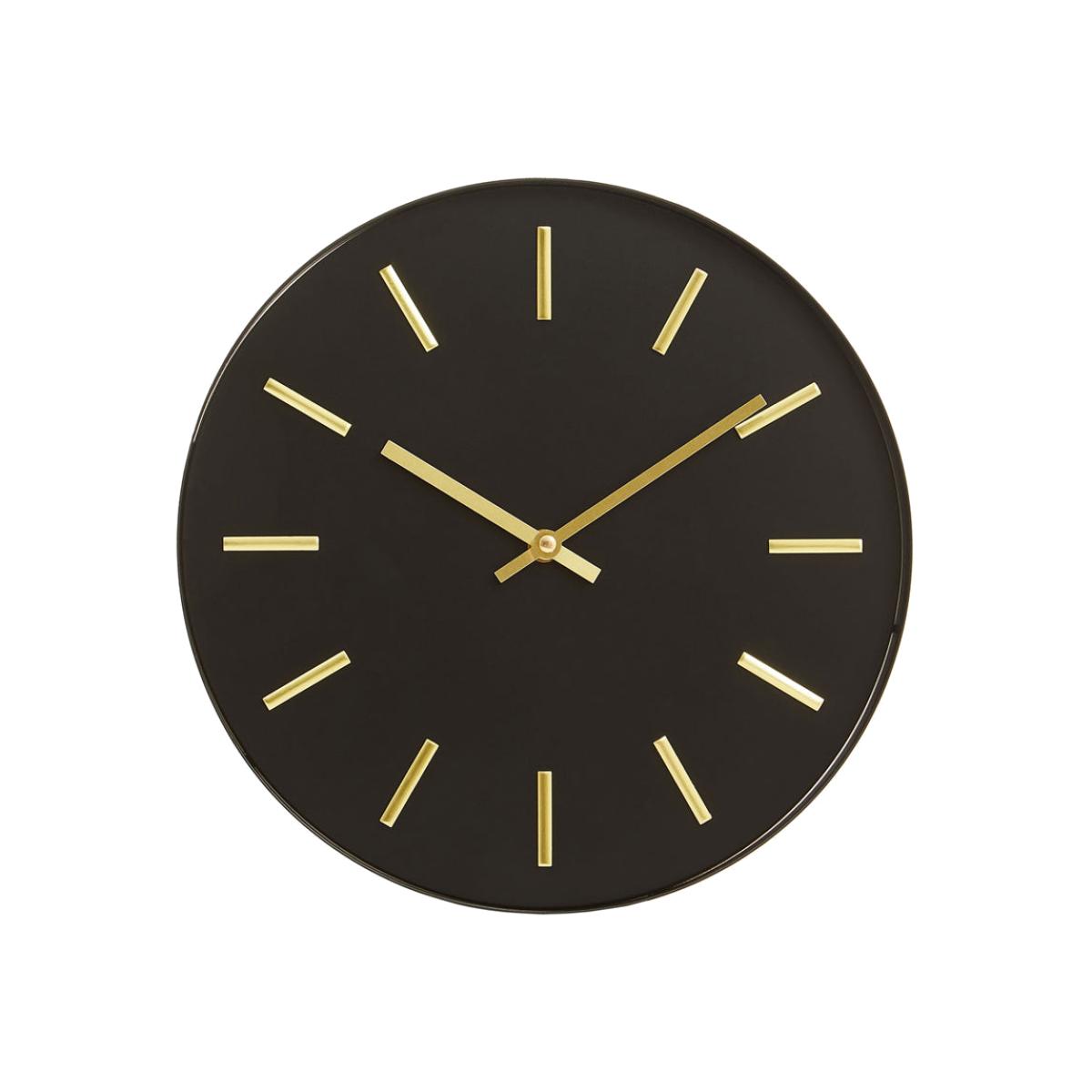 Black and gold combine to striking effect in this Olivia’s Soft Industrial Collection Vitas metal wall clock. Add drama to any room in your home with this stylish wall clock, which is perfect for any contemporary or industrial-inspired décor. Sleek black metal provides the background for the timepiece, allowing the gold hands and number details to really stand out. Paired with the simplicity of the design, these contrasting colours help to fuse an industrial feel with a hint of glamour. With dimensions of 30cm in diameter and 5cm deep, the eye-catching Vitas metal wall clock will look perfect in your kitchen, study or lounge. Dimensions: H: 30 x W: 30 x D: 5 cm Materials: Wood Assembly Required: No Care Instructions:Wipe clean with a soft cloth. Do not use abrasive cleaners Additional Information: Please note, this product composition contains natural wood, variations in colour may apply. Battery: 1 x AA - not included