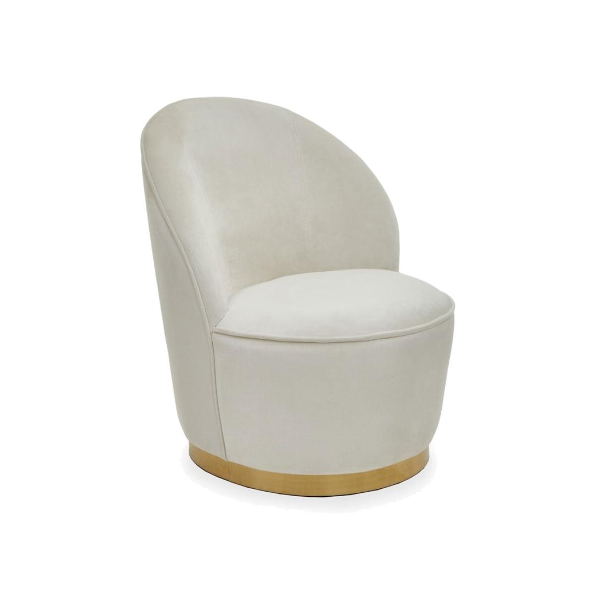 This barrel style chair is sleek and graceful in cream velvet upholstery that enhances its elegant curves and craftsmanship. The plush seat is supported with a gold finish round metal base that contributes to the glam appearance. Dimensions: H: 68 x W: 57 x D: 58 cm Materials: Wood Assembly Required: No Care Instructions: Seek professional advice for cleaning. Please note, This product composition contains natural wood, variations in colour may apply.