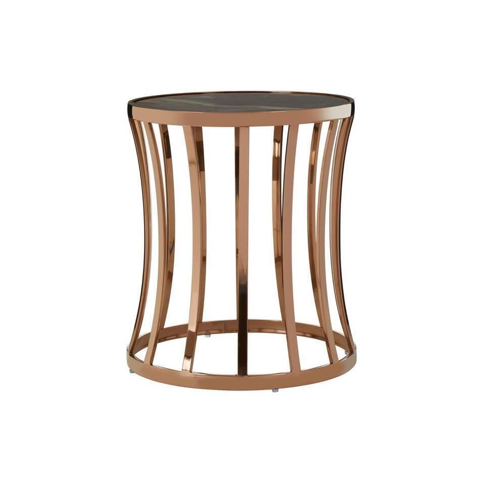This side table will elevate design in the living room thanks to it gently curving stainless steel design and faux marble top. The steel has a rich rose gold colour and the faux marble's pattern gives it a textured look.