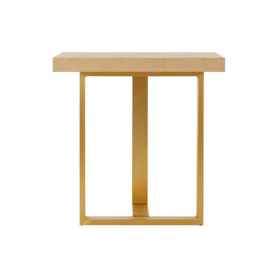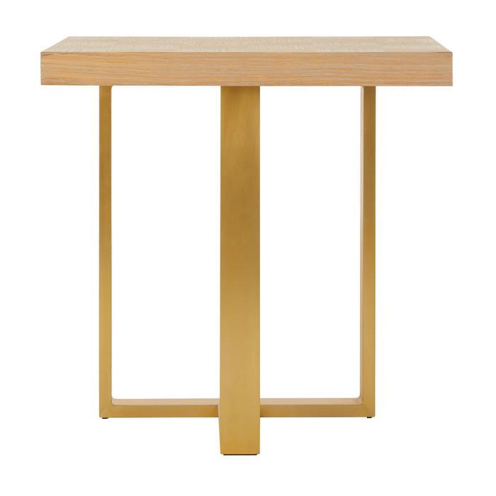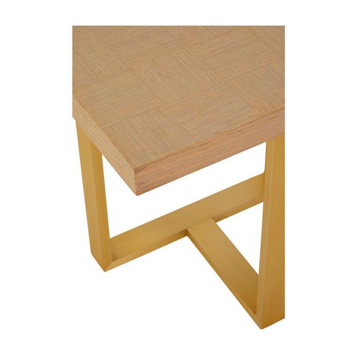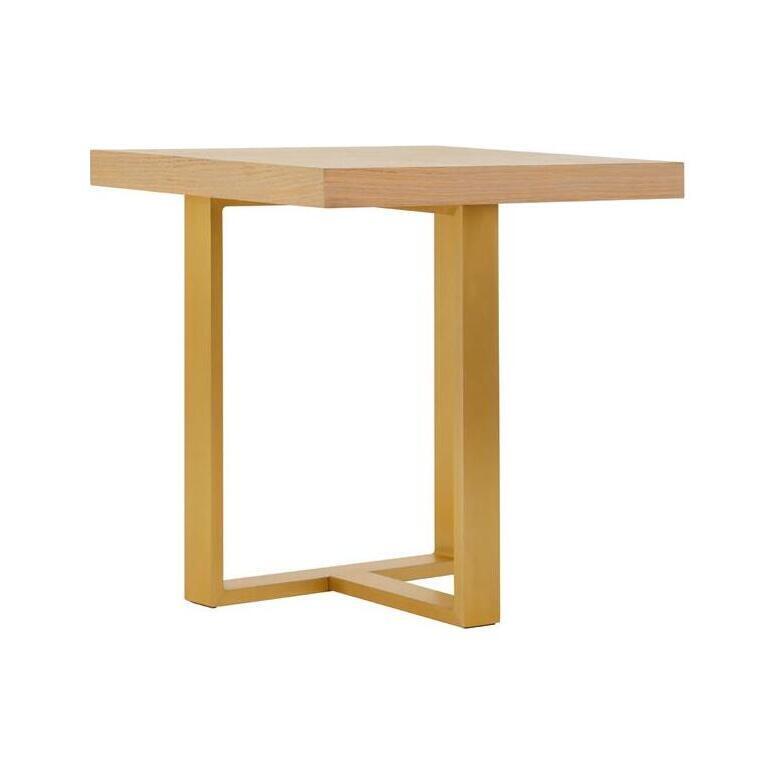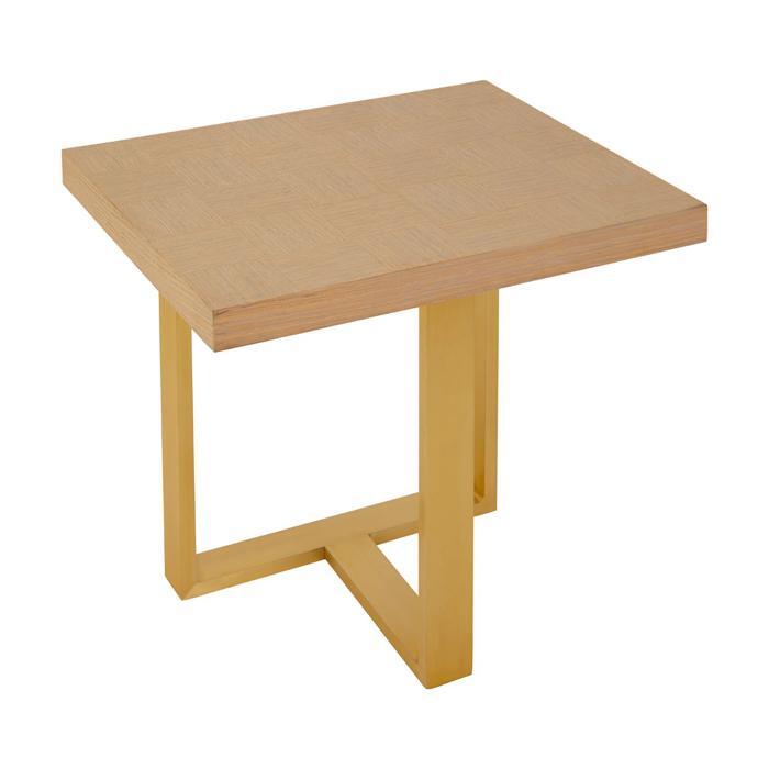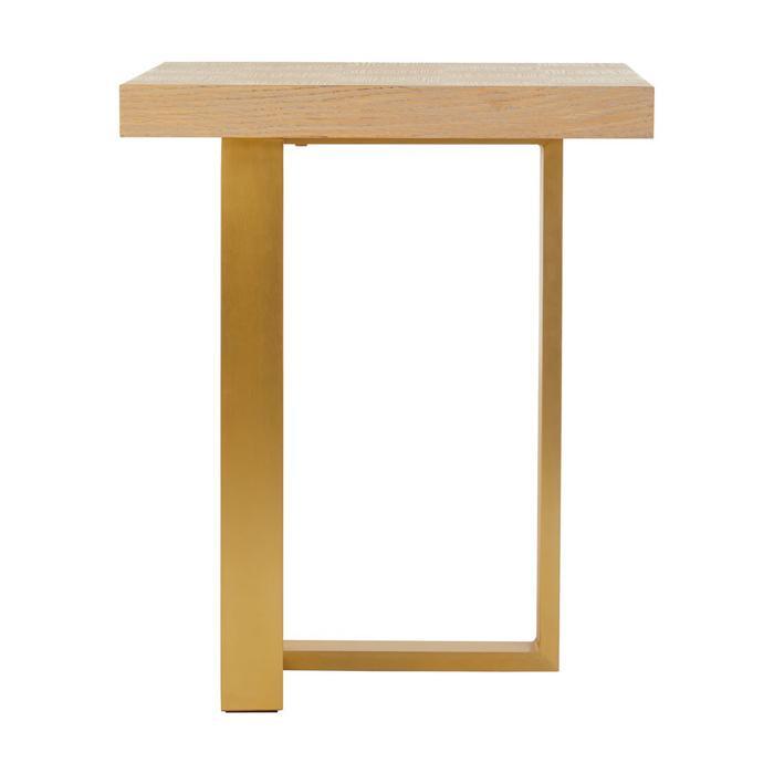 This side table boasts intersecting legs made from smooth metal, with a gold finish that makes it easy to coordinate with warm metallic accessories and textiles. Their minimal aesthetic. Complements. The rectangular block of oak wood that forms the tabletop.