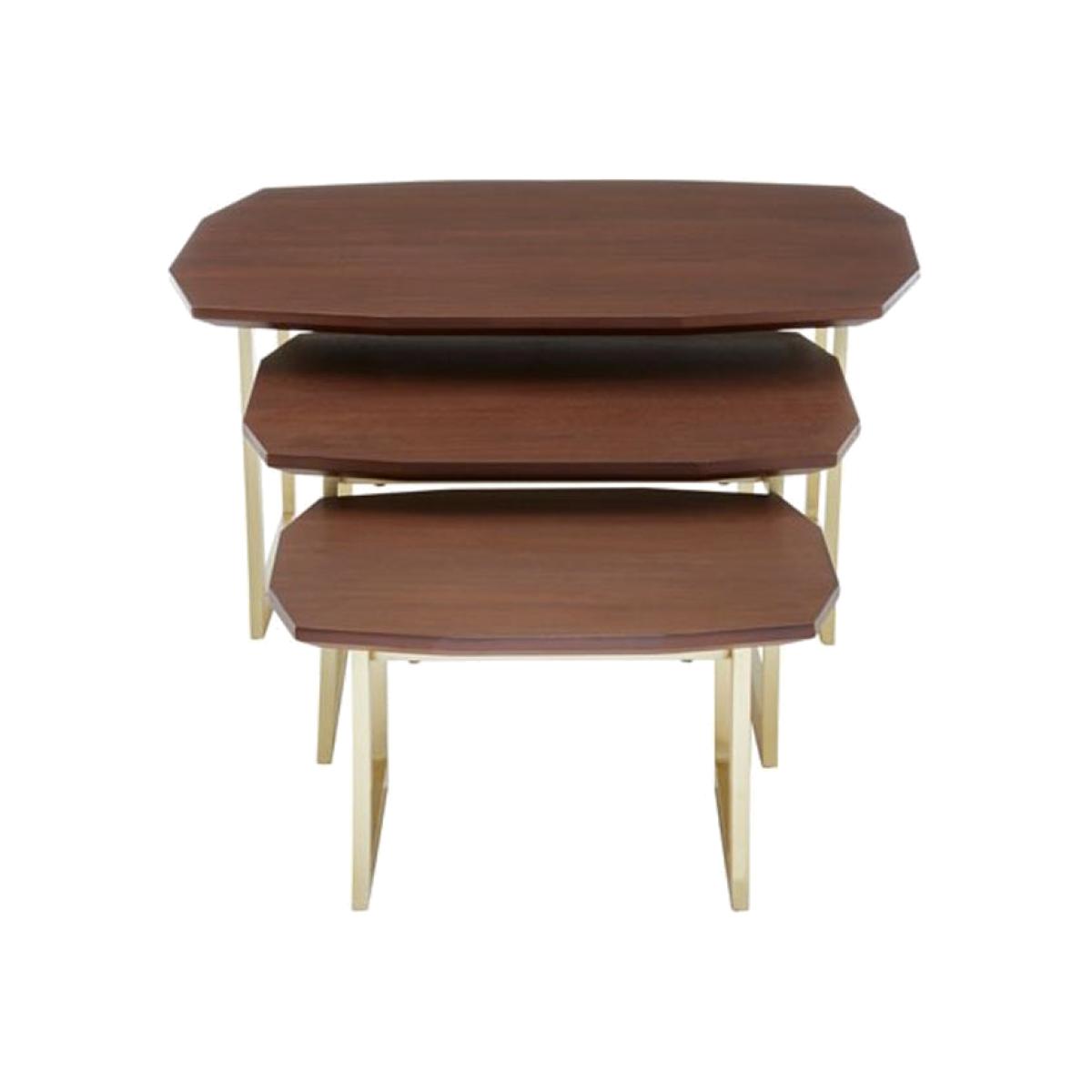Sleek dark wood and glistening golden details make the Liv by Olivia's Vera Set of 3 Nesting Tables a beautiful addition to a sophisticated home. The elegant squared metallic frames support the wooden table tops in an eye-catching design, adding flair and elegance to a living area. The three tables offer many possible combinations for display and complement both modern and vintage decorative themes with their classic mid-century-style looks. Their dark wood and bright gold tones are suited to enhancing both rich dark colour schemes and fresh lighter neutrals, making these nesting nicely designed tables a truly versatile and chic choice. Dimensions: H:37 x W:80 x D:80 cm