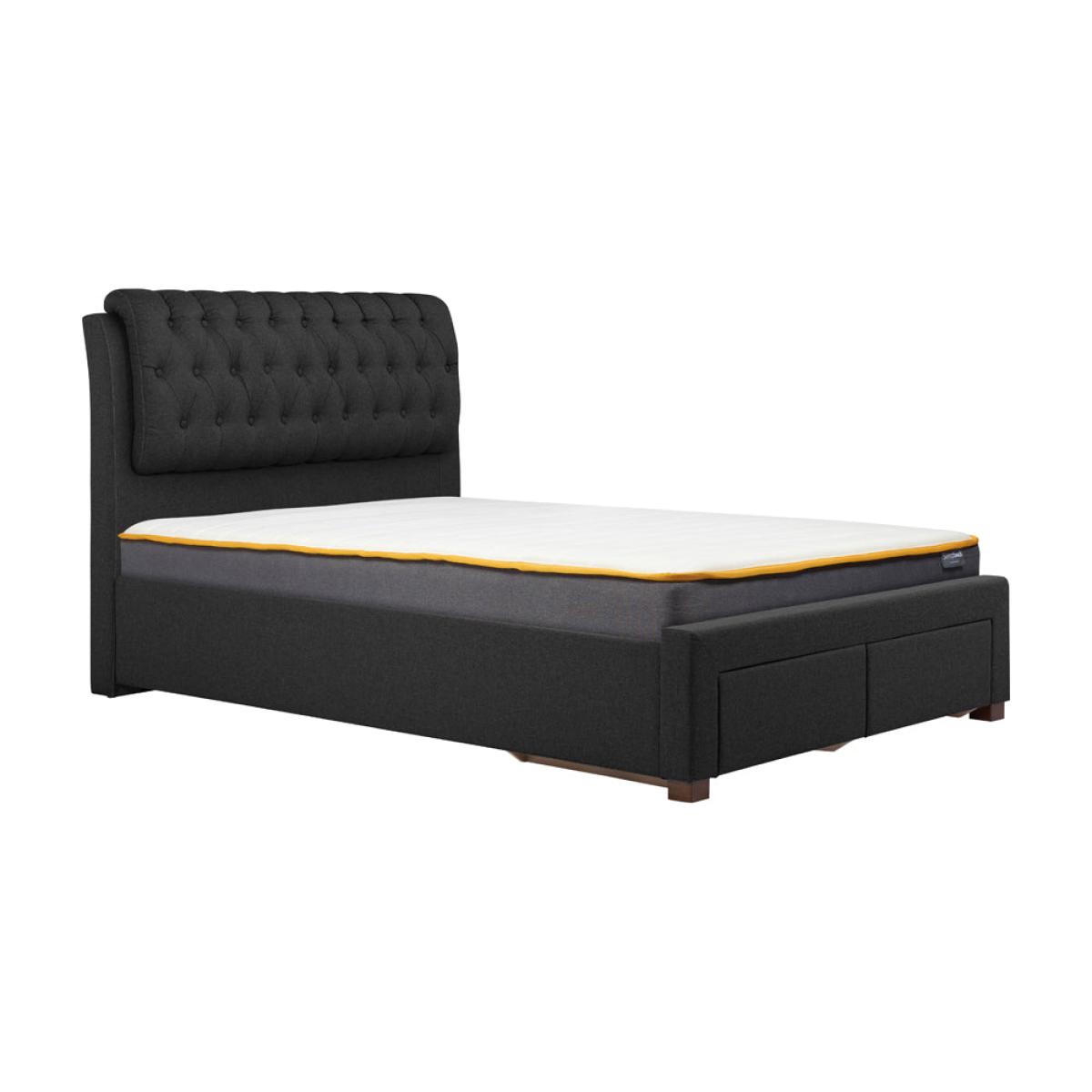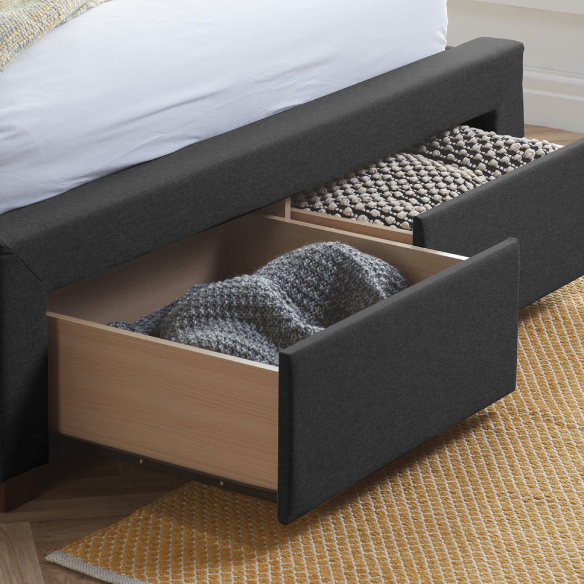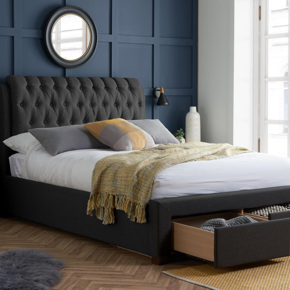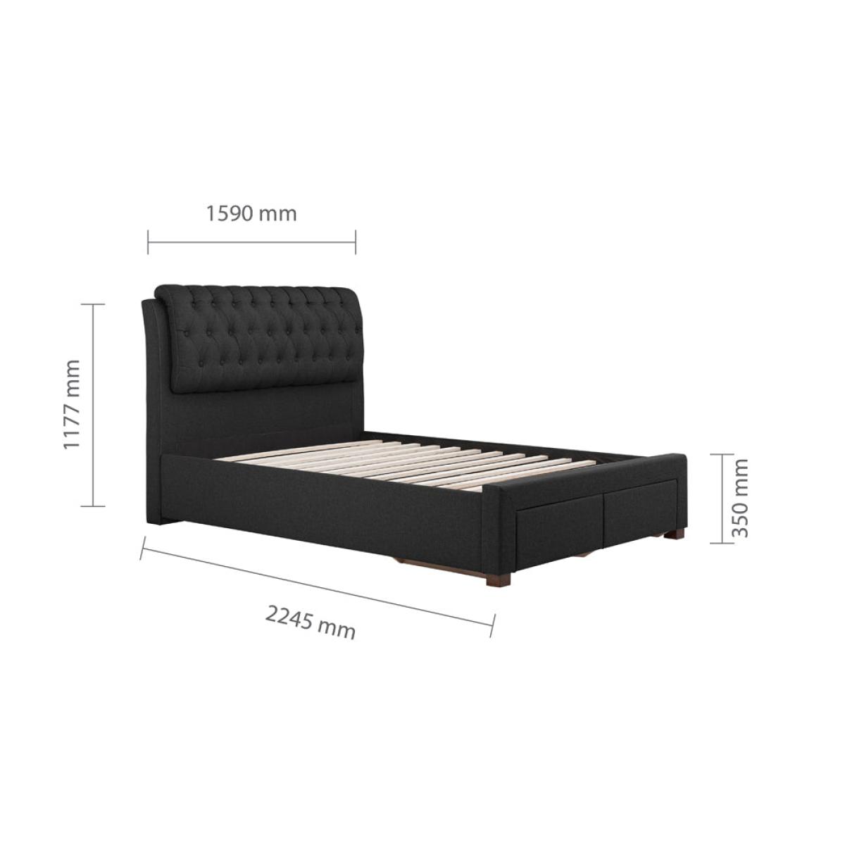 A delightfully upholstered bed that is really brought to life by a detailed buttoned headboard design, the Veronica not only looks great, but offers practicality with two spacious drawers built into the end of the bed. Available in either light dove grey, grey or charcoal polyester, the Veronica frame features a solid slatted base provides firmer support and allows air to circulate beneath the mattress. The maximum weight load for the 4"6 frame is 300 kg, and the 5" frame is 400 kg. Please note: Olivia's beds are only suitable for a UK standard size mattress and the recommended maximum mattress height is 305 mm. Dimensions: Double - H: 117.7 x W: 145 x D: 213.5 cm. Kingsize - H: 117.7 x W: 159 x D: 224.5 cm Materials: Polyester Assembly Required:Yes Care Instructions: Fabric can be gently brushed or lightly vacuumed to remove any dust. With any spillages, take immediate action to remove excess liquid. Do not rub or use any detergents. Always follow cleaning instructions included in the assembly instructions
