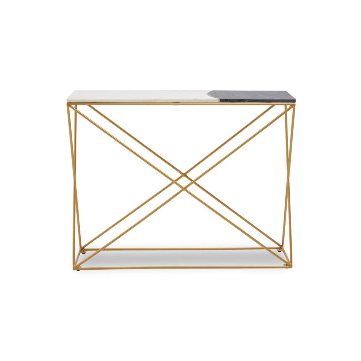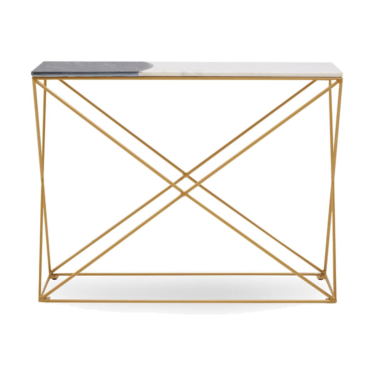 This console table has a random geometric crisscross, patterned brass finished base topped with a shiny white marble, the console table is sure to impress and elevate the modern aesthetic of its su. View More. This console table has a random geometric crisscross, patterned brass finished base topped with a shiny white marble, the console table is sure to impress and elevate the modern aesthetic of its surroundings with clear lines and sharp edges.