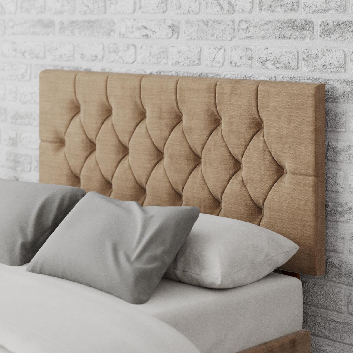 * Velour fabric headboard* Deep buttoned headboard design* Timeless Olivier range* Hand upholstered with deep padding* Solid mahogany struts* 60cm headboard panel height* 40mm deep polyester padding* Compatible with standard size UK bed bases and divans* Manufactured in the UK Create a statement look in your bedroom with this striking headboard from the Olivier range, offering a comfortable and relaxing recline while refreshing your space. Showcasing a decorative look, this headboard is hand upholstered in a velour fabric with timeless deep buttoned design details and deep padding for added comfort. Handcrafted with a 15mm thick panel and with solid mahogany struts ensure your headboard is sturdy and long lasting for years to come and the deep polyester padding will add a comfortable and supported surface. Available from single to super king sizes, this headboard is suitable for all standard bed bases making it a convenient and simple upgrade to your existing bed frame and a range of contemporary colours make it a versatile choice for various bedroom aesthetics.