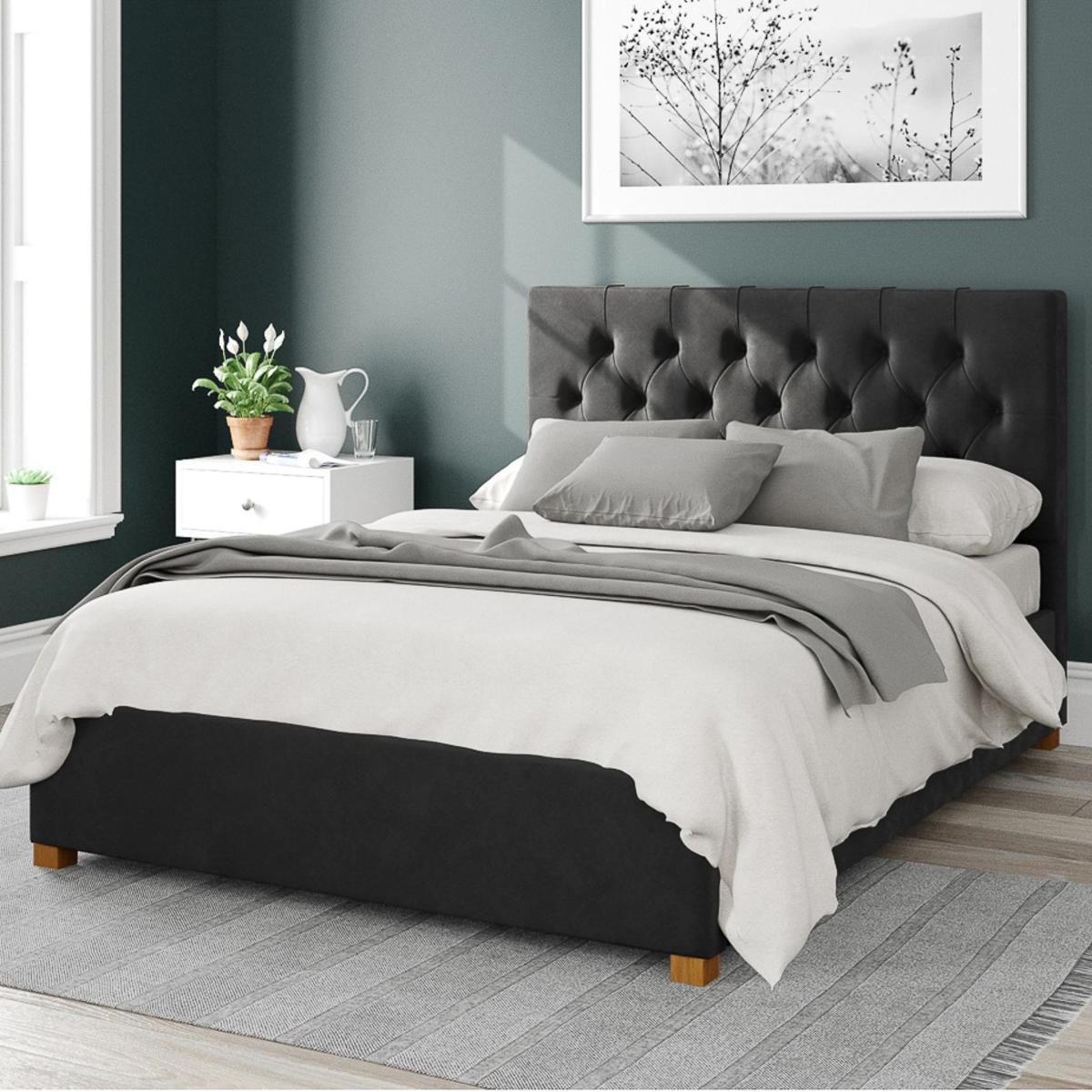 * Plush velvet fabric ottoman bed* Deep buttoned headboard design* Timeless Olivier range* Hand upholstered with deep padding* Large storage area with fabric dust protection sheet* Hands free access to storage (mattresses up to 60kg) - mattress not included* Solid hardwood feet* Manufactured in the UK Experience prestigious styling and the pampered touch of this stunning ottoman bed from the Olivier range, perfect for creating a statement look in your bedroom that offers an effective storage and sleeping solution. Hand upholstered with a luxurious plush velvet fabric in a range of gorgeously bold colours, the Chesterfield inspired headboard is made with deep padding and statement deep buttoned details for a timeless look. Manufactured in the UK, it features quality spring slats that provide added support for a peaceful night's sleep and the large storage area is designed to provide ample space for all your bedding and accessories. The ottoman design can be easily accessed with gas lift pistons, so once the mechanism is open it will hold in place and a fabric dust protection sheet is there to keep your belongings clean and tidy. Complete with solid hard wood feet to provide a stable foundation and ensure the bed remains sturdy and secure, they also add a stylish touch to the overall design.