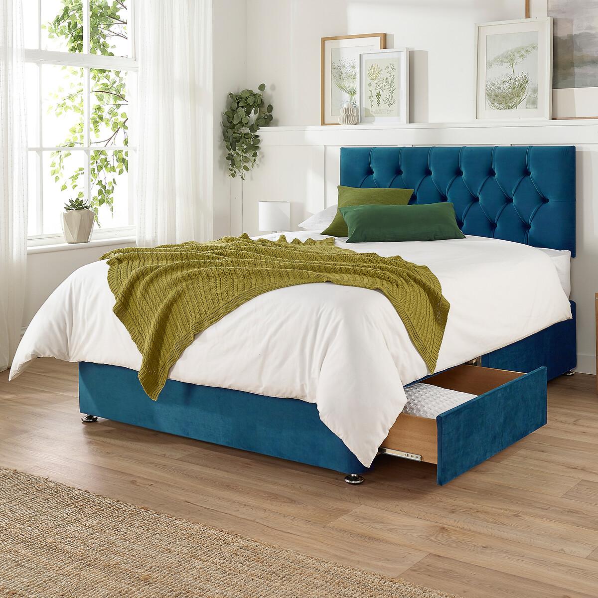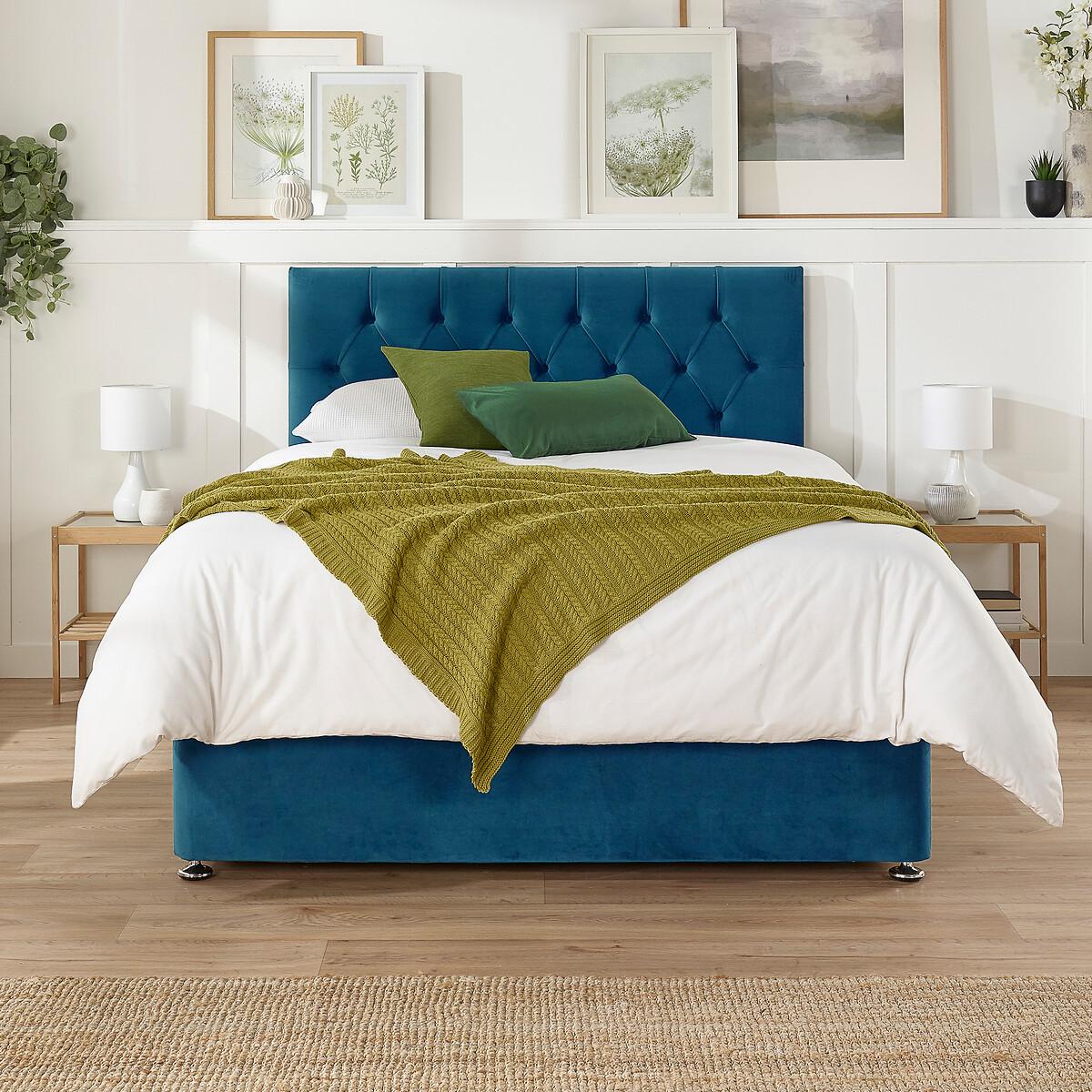 Wrapped generously in sumptuous velvet fabric, this divan bed and headboard set is a testament to luxury and practicality. Luxurious velvet fabric gives an opulent feel and remarkable durability. Soft to the touch yet resilient, this fabric effortlessly turns any bed into the unequivocal focal point of your bedroom. A generously padded headboard ensures maximum comfort when you want to sit up in bed. Stylish gliding feet allow ease of movement within the bedroom. Two well proportioned drawers offer hidden storage for hair and make up, undergarments or general bedroom clutter. The Olivier Divan is also available with a 4 drawer storage option, and as a set with a Pocket+ memory mattress. Product details: • Divan base • Button tufted padded headboard • Matching headboard is supplied with solid wood mounting struts for easy installation • Two Drawer Storage • Metal runners and ball bearing glide movement • Hand upholstered velvet • Meets all UK safety standards • Made to order • Made in the UK • 1 year warranty Composition - Velvet (100% polyester), wood frame, foam fillings Product dimensions:• Single 190 cm x 90 cm x 102 cm, Weight - 33 KG • Small Double 190 cm x 120 cm x 102 cm, Weight - 46 KG • Double 190 cm x 135 cm x 102 cm, Weight - 46 KG • King 200 cm x 150 cm x 102 cm, Weight - 51 KG • Super King 200 cm x 180 cm x 102 cm, Weight - 59 KGDivan height from floor to sleeping area - 38cm Internal drawer dimensions - 51.5cm x 72.5cm x 12.5cm. Package Dimensions:Single: • Parcel 1 Packaged Dimensions - 190 cm x 90 cm x 38 cm, Weight 27 kg • Parcel 2 Packaged Dimensions - 90 cm x 54 cm x 6 cm, Weight 6 kg. Small Double: • Parcel 1 Packaged Dimensions - 190 cm x 120 cm x 38 cm, Weight 12 kg • Parcel 2 Packaged Dimensions - 190 cm x 120 cm x 38 cm, Weight 26 kg • Parcel 3 Packaged Dimensions - 120 cm x 54 cm x 6 cm, Weight 8 kg. Double: • Parcel 1 Packaged Dimensions - 190 cm x 135 cm x 38 cm, Weight 12 kg • Parcel 2 Packaged Dimensions - 190 cm x 135 cm x 38 cm, Weight 26 kg • Parcel 3 Packaged Dimensions - 135 cm x 54 cm x 6 cm, Weight 8 kg. King: • Parcel 1 Packaged Dimensions - 200 cm x 150 cm x 38 cm, Weight 13 kg • Parcel 2 Packaged Dimensions - 200 cm x 150 cm x 38 cm, Weight 28 kg • Parcel 3 Packaged Dimensions - 150 cm x 54 cm x 6 cm, Weight 10 kg Super King: • Parcel 1 Packaged Dimensions - 200 cm x 180 cm x 38 cm, Weight 15 kg • Parcel 2 Packaged Dimensions - 200 cm x 180 cm x 38 cm, Weight 31 kg • Parcel 3 Packaged Dimensions - 180 cm x 54 cm x 6 cm, Weight 13 kg. This product will be dispatched by one of our trusted suppliers. You’ll be contacted by their selected courier about your delivery. Please note this item will be delivered to your doorstep. Please note that this item cannot be delivered to the Offshore Islands, Northern Ireland or the Republic of Ireland. ASPIR01