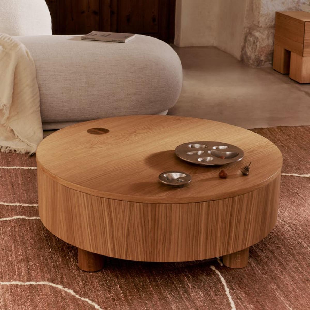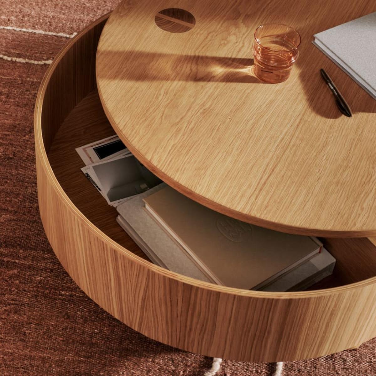 Functional design and minimalist spiritThe Olles Coffee table brilliantly embodies the fusion of sleek design and understated ingenuity. With its soft lines, sturdy legs and FSC®-certified oak veneer finish, it is part of the trend towards warm minimalism, where form follows function without ever sacrificing it. Sculptural furniture for everyday useWith its generous diameter and ideal height, Olles works equally well as a coffee table or a concealed storage box. Its pivoting Tray opens smoothly to reveal a vast compartment, perfect for plaids, books or everyday objects. An elegant solution for well-groomed interiors, combining aesthetics and practicality. The authenticity of Wood, the modernity of gestureLacquered oak veneer, applied to a plywood and MDF structure, gives the table a refined, natural look, while guaranteeing strength and durability. The subtle veining of the wood and the soft touch of the clear lacquer make it as pleasing to look at as it is to use. It's perfect for a contemporary living room, a bohemian chic bedroom or a Japanese-inspired interior. Why choose the Olles Coffee table? - Minimalist, organic design with rounded lines - Double function: Coffee table and concealed Storage Box - Pivoting Tray for easy access to contents - FSC®-certified Oak: a responsible wood with a meticulous finish - Ideal for optimizing spaces with elegance A discreet, intelligent centerpieceWith Olles, transform your living room into a refined, functional and harmonious space. This two-in-one piece of furniture combines the natural beauty of wood with an eye for detail, for a design that combines style, comfort and ecological awareness. In detail: Variation : Natural oak Brand :Ferm Living Type : Coffee table Colour : Natural oak Material : Lacquered oak veneer FSC® certified with MDP core and plywood. Dimensions : Ø 80 x H 30 cm Weight : 44 lb Characteristics : FSC-certified wood - Coffee table / Box - Swivel Tray - Ample storage space - Wipe with a dry cloth Show less