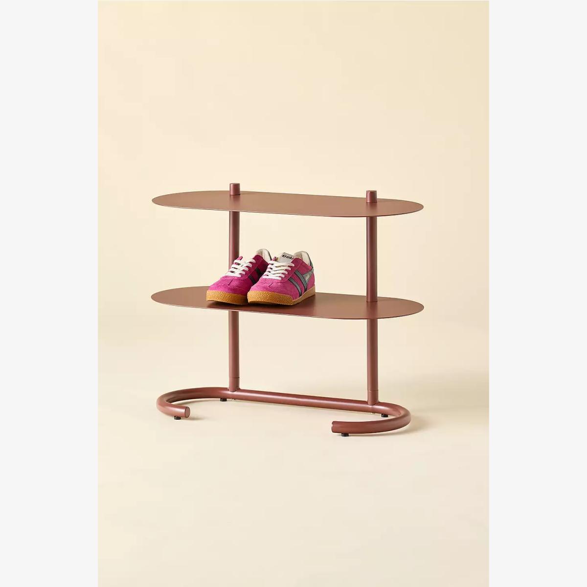 Contemporary standing shelf with a two-tier design. Features oval-shaped shelves for versatile storage, a brown finish, and a curved base for stability. Perfect for organising shoes, books, plants, decor and more! *Online return only. This item cannot be returned instore. Please note furniture items currently cannot be shipped to Northern Ireland or The Republic of Ireland. Delivery of large furniture items may take 1-2 weeks and are therefore not eligible for Next Day Delivery.* **Content + Care** \- 100% Iron \- Wipe clean **Size + Fit** \- Dimensions: L: 31.8 cm x W: 66 cm x H: 52.7 cm \- Leg height: 25.34 cm \- Shelf dimensions: 22 cm \- Weight Capacity: 15kg each shelf \- Weight: 23.3kg \- Shipping package dimensions: L: 37.5cm x W: 8.9cm x H: 73cm