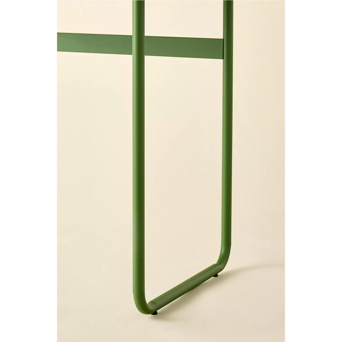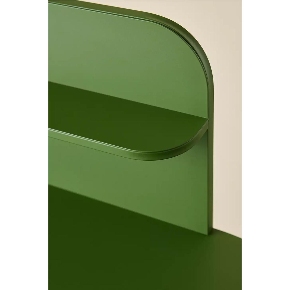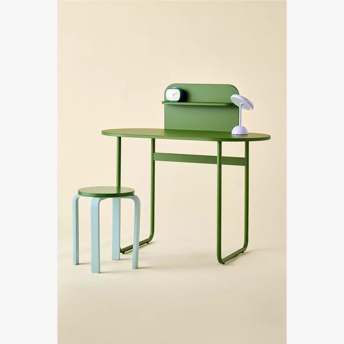 Modern desk in a green hue, perfect for compact spaces. Features a minimalist design crafted from metal with curved lines, a raised back panel for added storage, and slender tubular legs. *Online return only. This item cannot be returned instore. Please note furniture items currently cannot be shipped to Northern Ireland or The Republic of Ireland. Delivery of large furniture items may take 1-2 weeks and are therefore not eligible for Next Day Delivery.* **Content + Care** \- 100% Iron \- Wipe clean **Size** \- Dimensions: L: 55.9 cm x W: 10.7 cm x H: 103.8 cm \- Leg height: 71.6 cm \- TOP small storage weight: 3kg / Desk: 30kg \- Weight: 18.8kg \- Shipping package dimensions estimate: L: 62.9 cm x W: 13.3 cm x H: 116.15 cm \- Shipping weight: 22.7kg