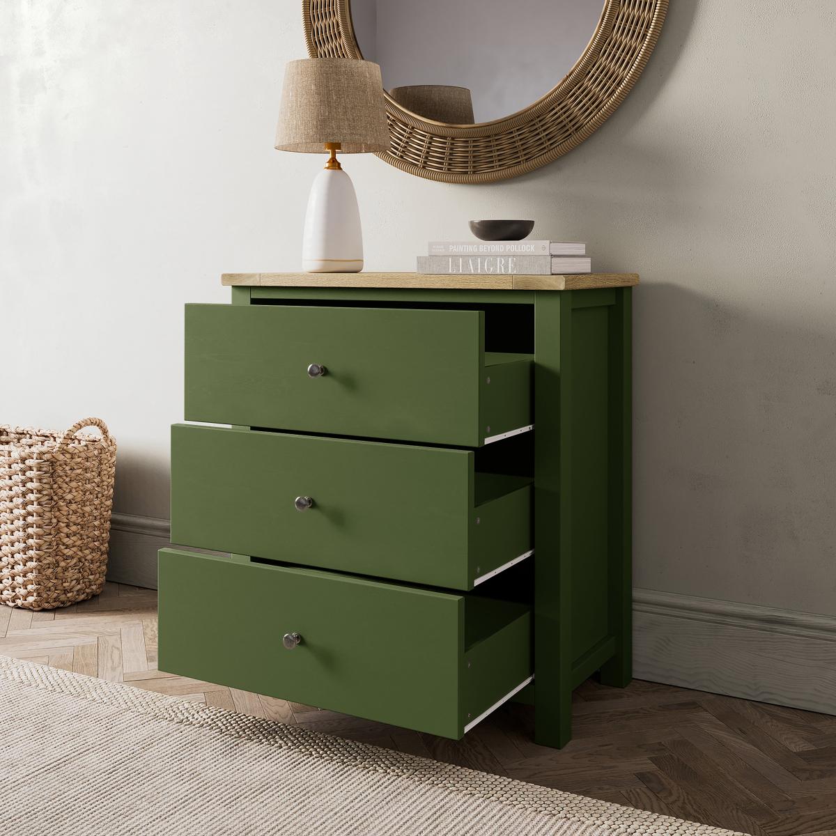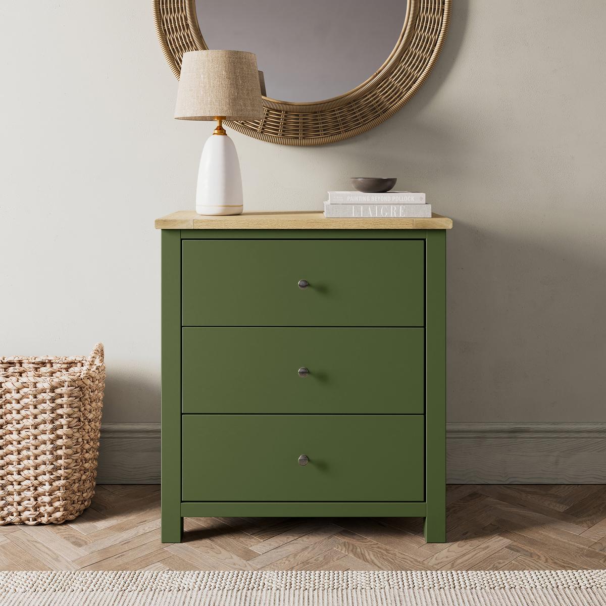 Dunelm Exclusive - Designed and Developed by Dunelm* Chest of drawers* 3 spacious drawers* Oak effect top* Painted finish* Brushed metal finish handle* Metal drawer runners Put yourself in a state of calm with this chest of drawers, which offers plenty of space for all your clothes and belongings. It has 3 wide drawers, each sized to fit your shoes and jumpers, to keep everything neat and tidy.