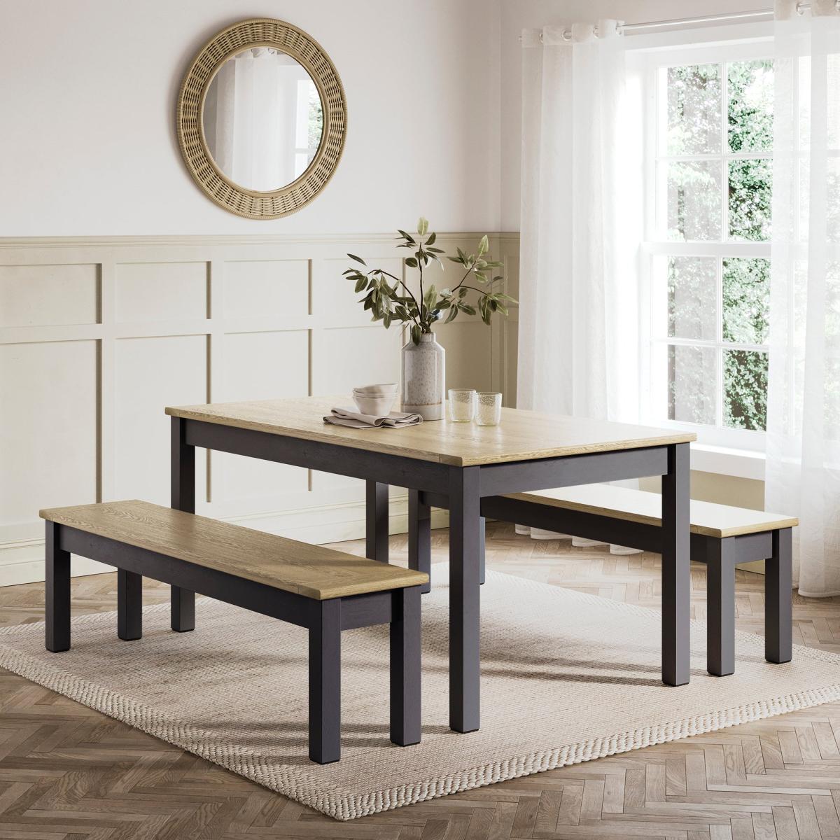 * 1 x Table and 2 x Benches * Wood grain effect Designed for relaxed dining with a contemporary touch, this six-seater table and bench set offers a stylish and practical solution for everyday meals and entertaining. The spacious tabletop provides plenty of room for family dinners, while the matching benches tuck neatly underneath when not in use—perfect for maximising space in modern homes.
