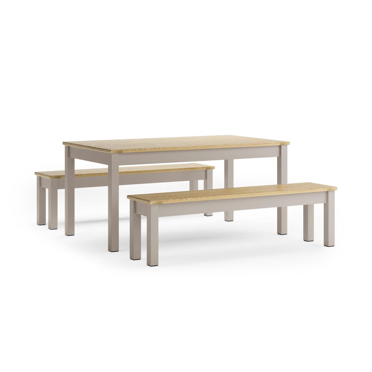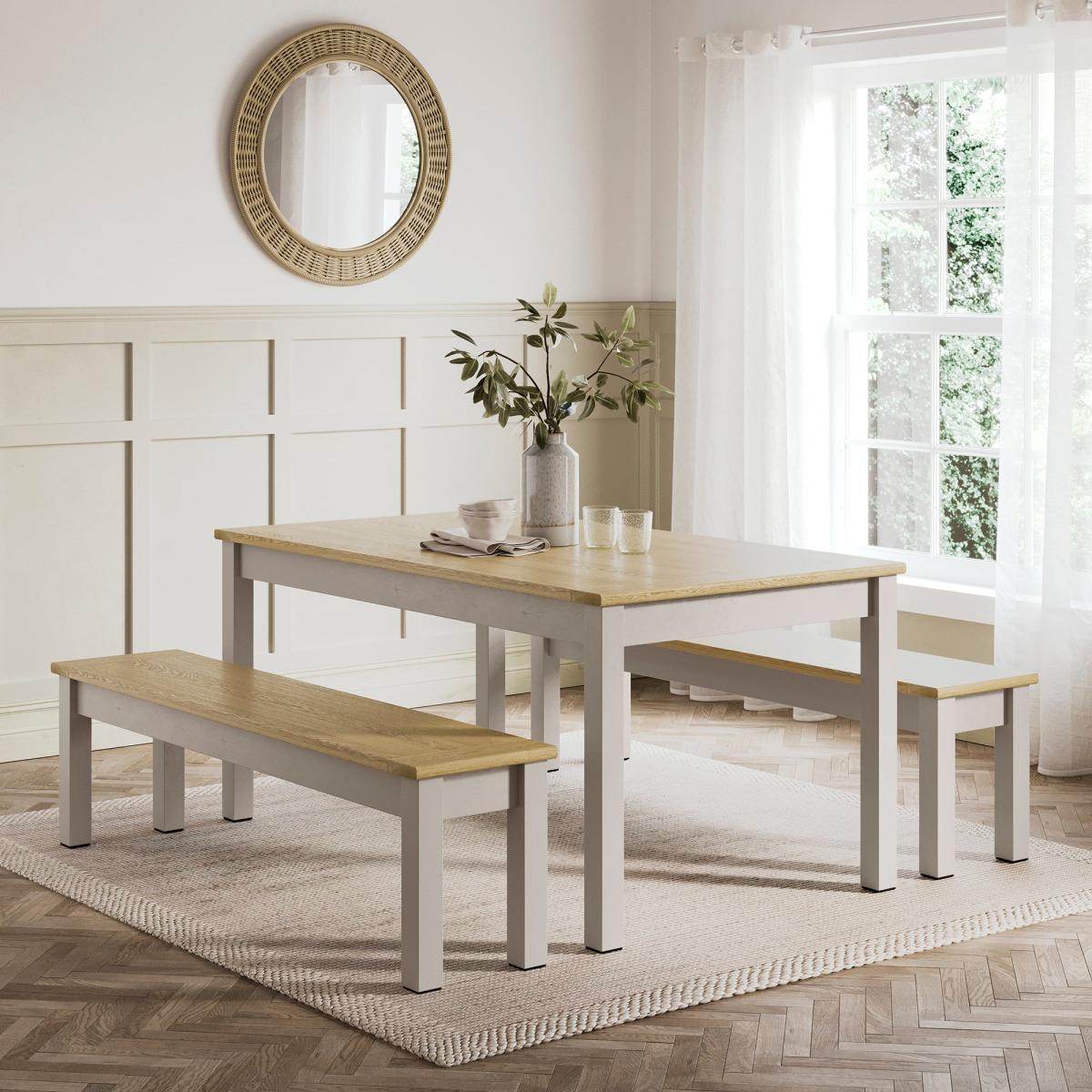 * 1 x Table and 2 x Benches * Wood grain effect Designed for relaxed dining with a contemporary touch, this six-seater table and bench set offers a stylish and practical solution for everyday meals and entertaining. The spacious tabletop provides plenty of room for family dinners, while the matching benches tuck neatly underneath when not in use—perfect for maximising space in modern homes.
