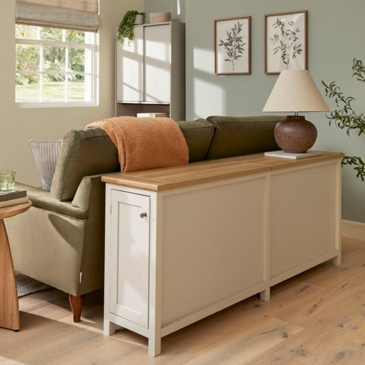 * Space saving storage * Wooden frame * Painted finish This cabinet is designed to make the most of every inch of your living space. Slim enough to sit neatly behind your sofa, it offers a clever combination of deep and raised storage compartments, perfect for everything from blankets and books to remotes and chargers. The open-top design allows for easy access while seated, and integrated cable management keeps wires tidy and out of sight.