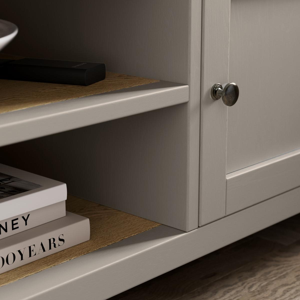 PRICE DROP:Our Olney Coffee Table with Shelf in Grey is now available at a new lower price. Was £149 Now £129. Get the perfect look for your living room with this stylish TV unit. With its oak effect finish, brushed metal brass handles and shelf and cupboard storage, you have everything you need to make entertaining a breeze.