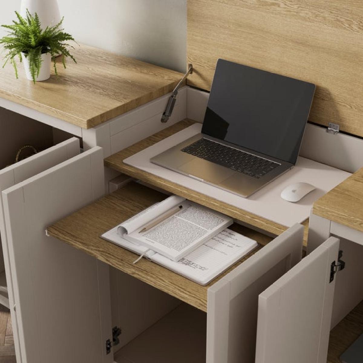 * Large sideboard * Wooden frame * Painted finish The Olney sideboard desk is a smart, dual-purpose piece that blends seamlessly into your home. At first glance, it appears to be a stylish sideboard, but hidden within is a pull-out desk that transforms the centre section into a functional workspace. When the workday is done, the desk slides back into place, leaving no trace of your home office setup.