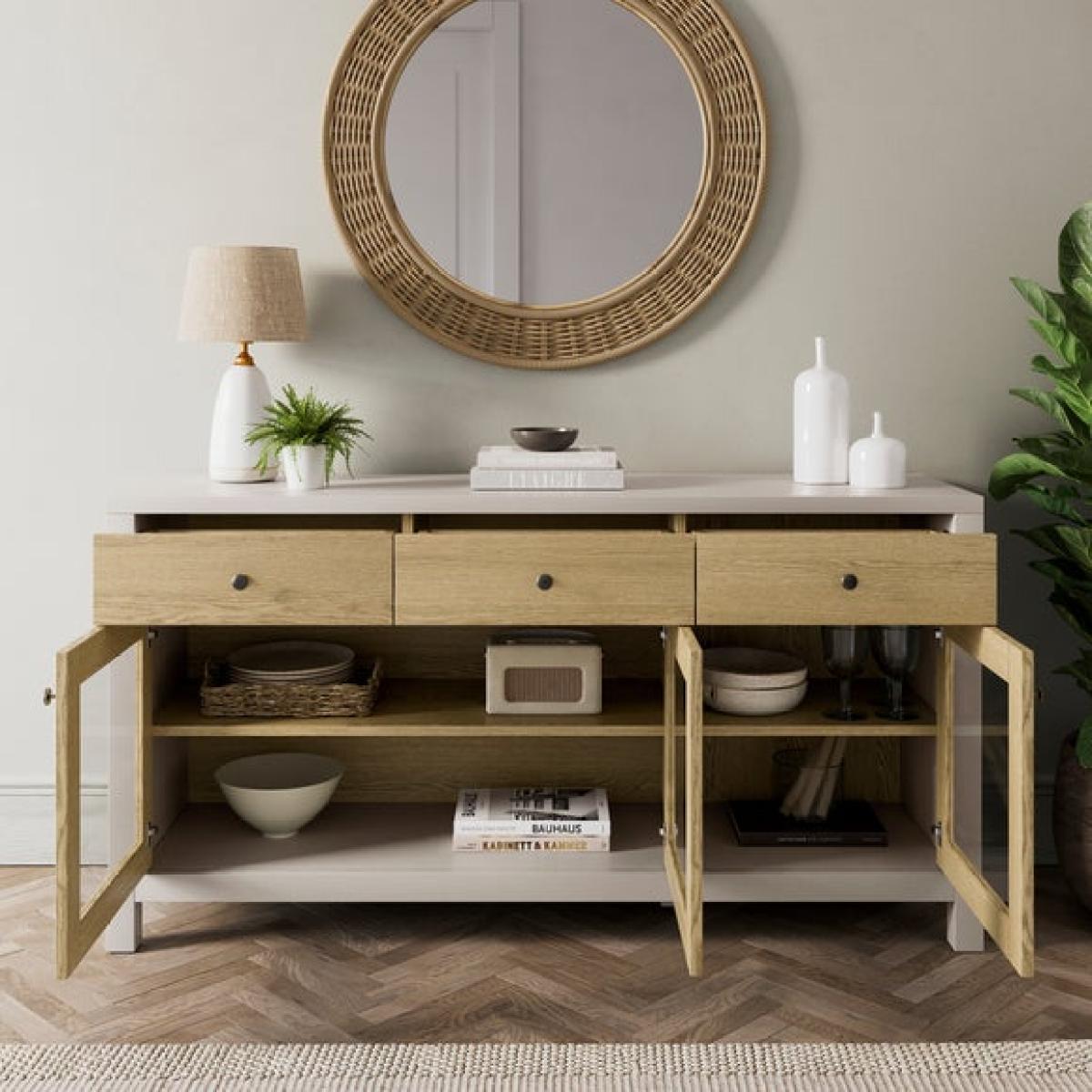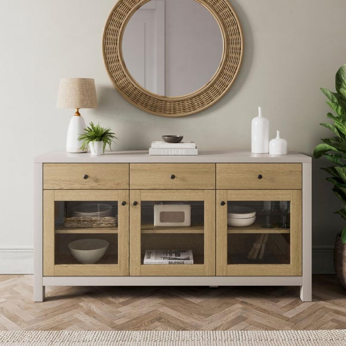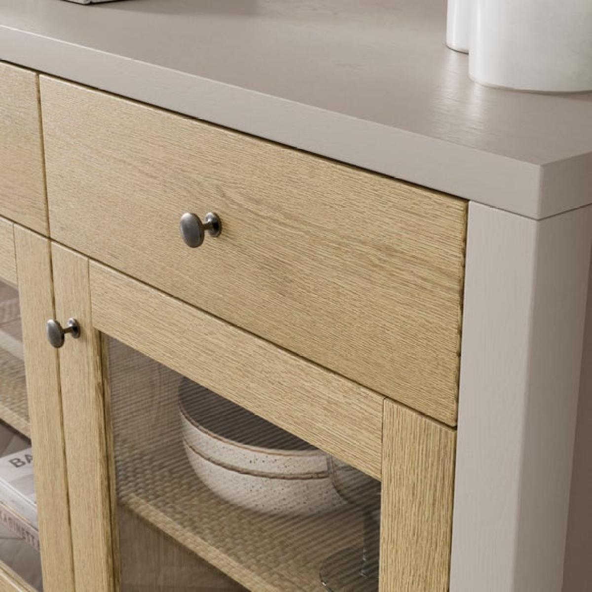 * Stone and light wood effect * Extra wide glazed sideboard * 3 drawers and 3 cupboards * Adjustable shelves This extra wide sideboard brings together a calming stone colour and a light wood-effect finish for a clean, modern feel. With three drawers and three spacious cupboards, there's plenty of room to keep your home organised. Glazed doors add a touch of elegance while letting you display your favourite pieces. Adjustable shelves offer flexibility, whether you're storing tableware, linens or board games. It's a smart, stylish solution for busy living or dining spaces.