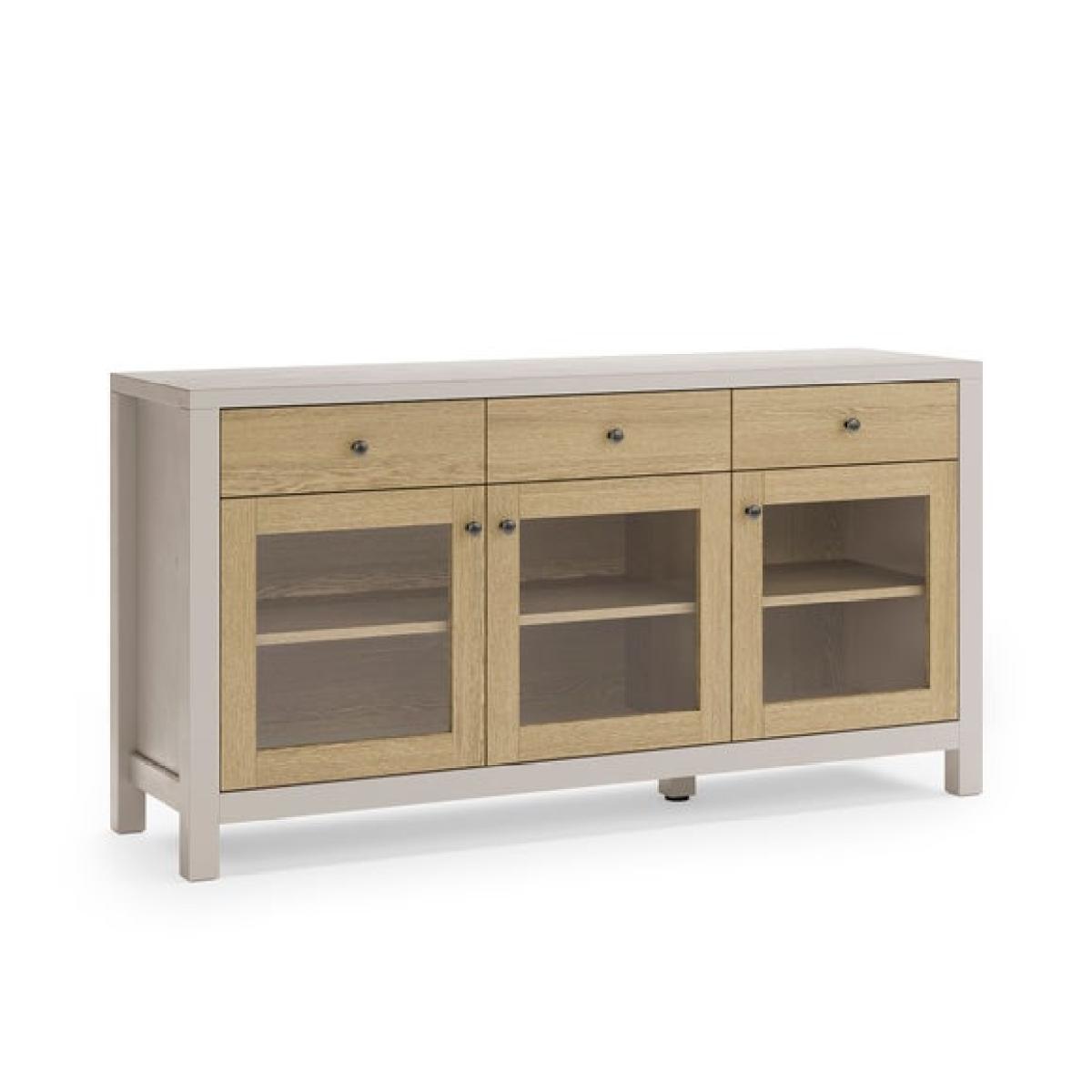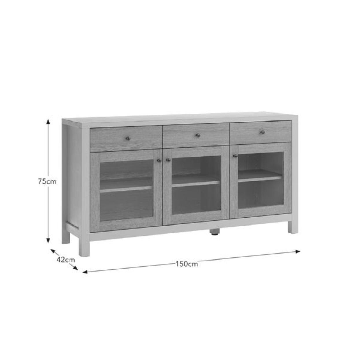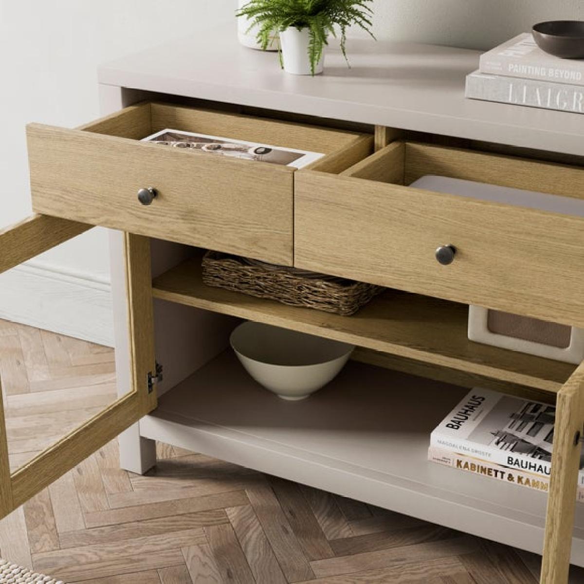 * Stone and light wood effect * Extra wide glazed sideboard * 3 drawers and 3 cupboards * Adjustable shelves This extra wide sideboard brings together a calming stone colour and a light wood-effect finish for a clean, modern feel. With three drawers and three spacious cupboards, there's plenty of room to keep your home organised. Glazed doors add a touch of elegance while letting you display your favourite pieces. Adjustable shelves offer flexibility, whether you're storing tableware, linens or board games. It's a smart, stylish solution for busy living or dining spaces.