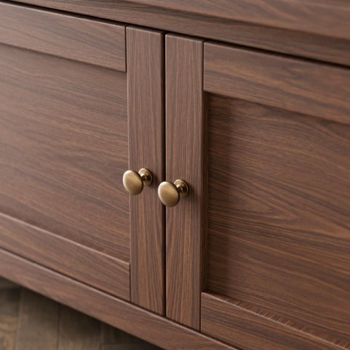 * Wooden TV Unit * Suitable for Large TVs * Brushed Brass Handles * Full Assembly Required Made with oak wood grain paper foil, this unit showcases visible shelves and internal shelving for organised storage. Its stable construction and TV stand design provide ample space for your devices and accessories. Complete with brushed metal brass handles and high-quality fittings and hinges, this unit offers both durability and style. Cable holes facilitate a tidy setup, making this unit a functional and attractive addition to your living space.