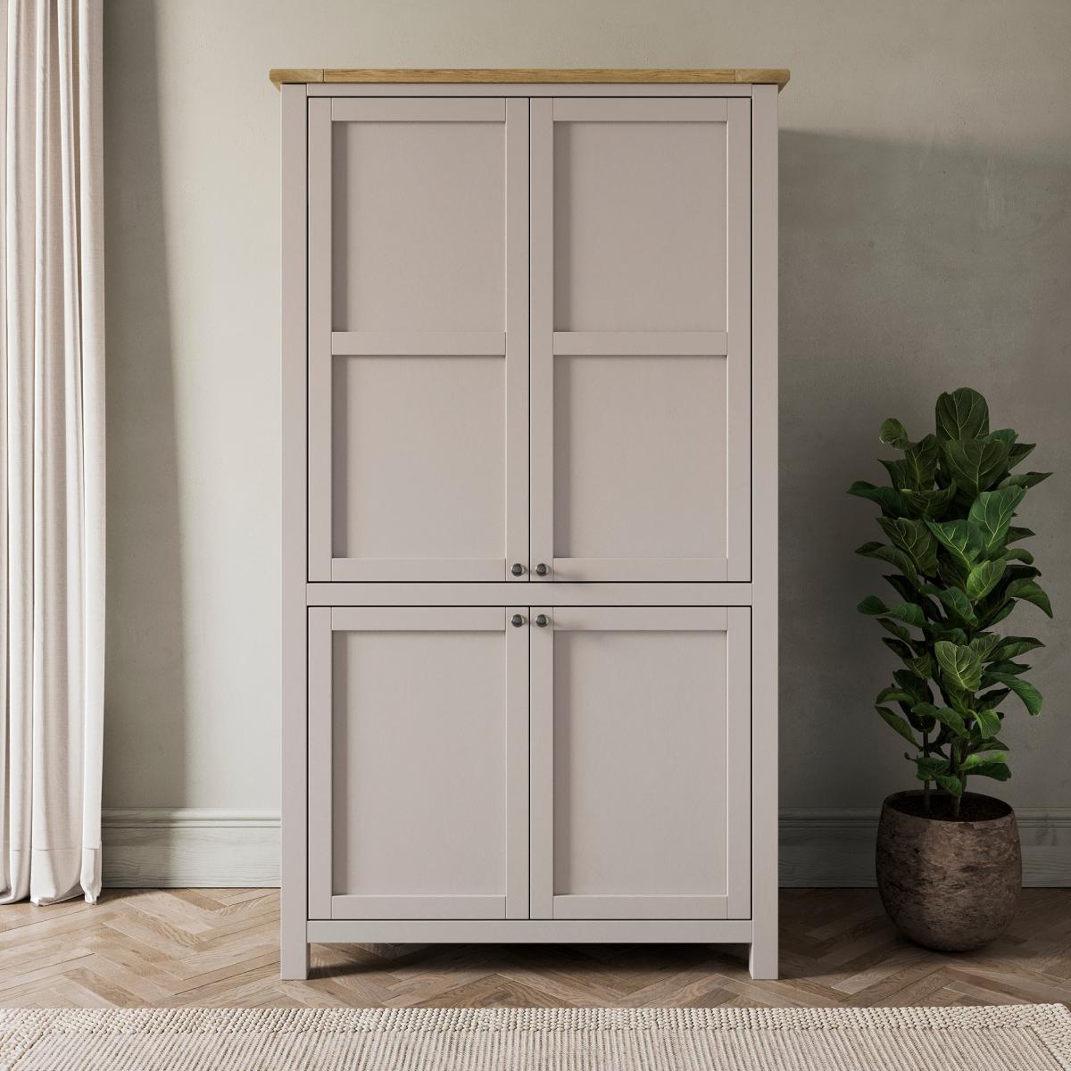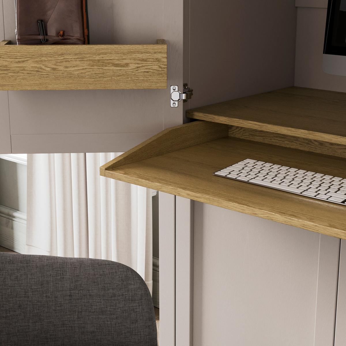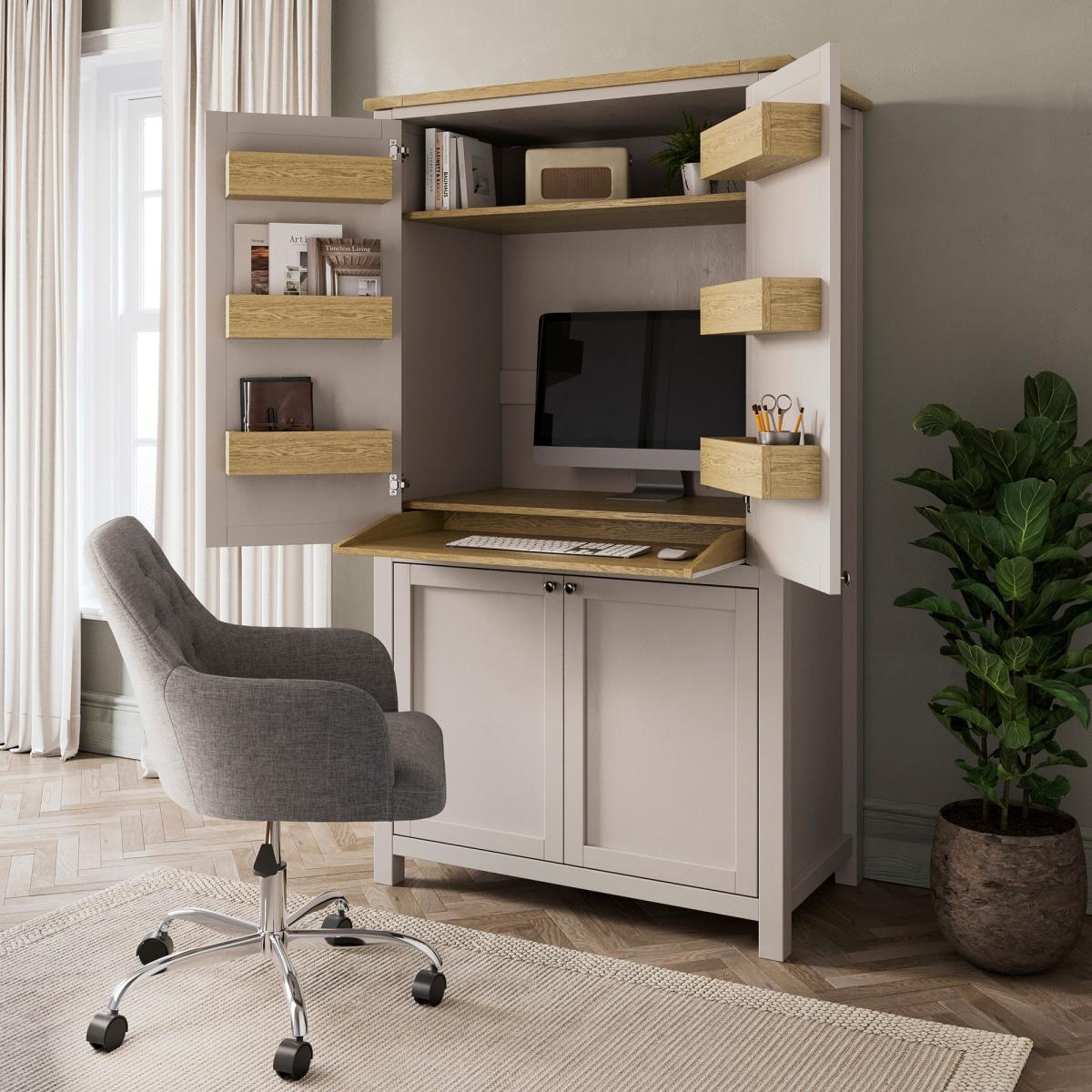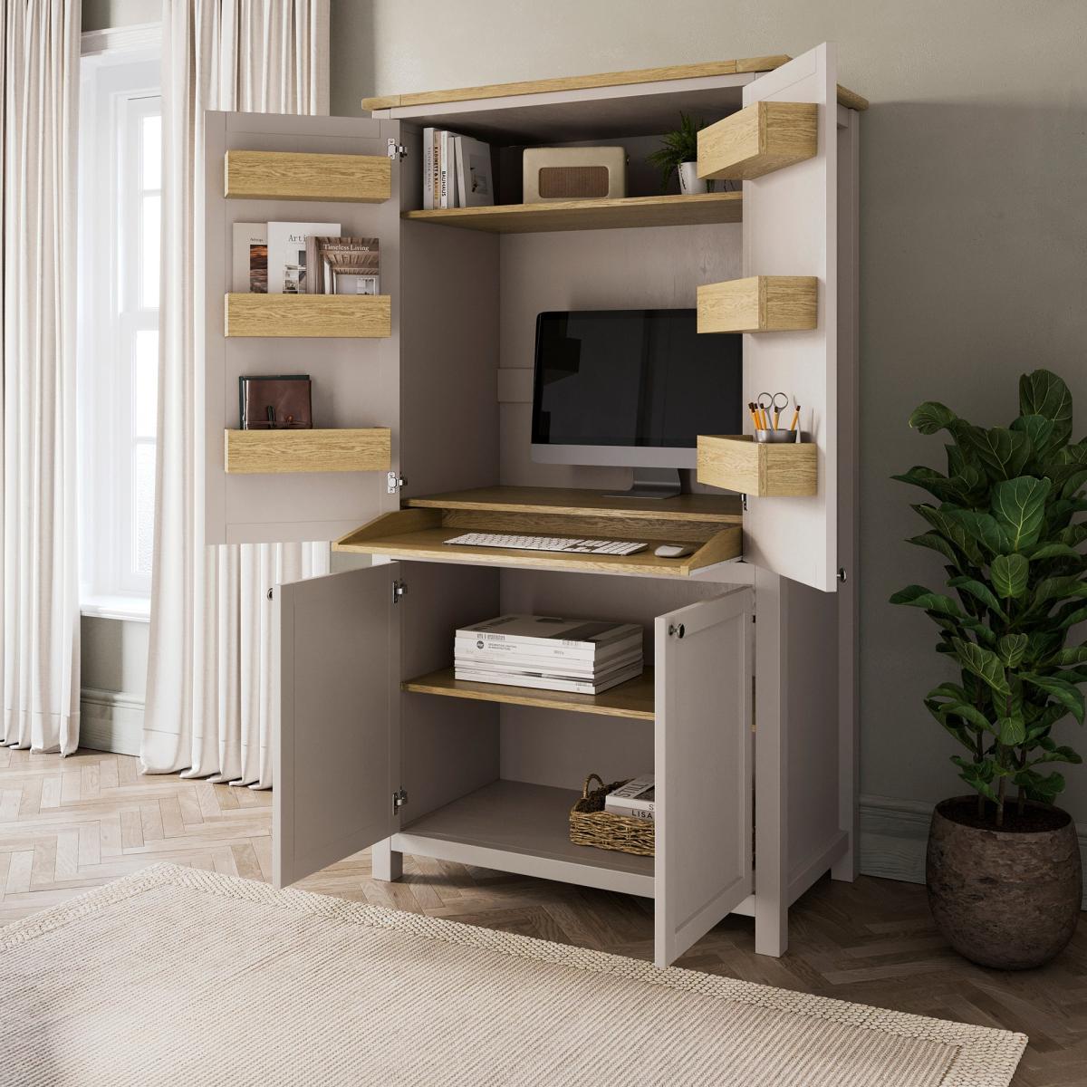 * Hideaway desk * Great for disguising your workspace * Large storage space * Extending keyboard panel This Olney Hideaway Desk is the perfect home office solution, allowing you to shut away your workspace at the end of the day so you can enjoy your living space. With a large storage cupboard at the base, two upper shelves and more storage on the doors, this desk will hold all your items effortlessly and an extending keyboard panel allows for comfortable working. All this whilst looking ultra-stylish, with a stone colourway and wood effect accents.