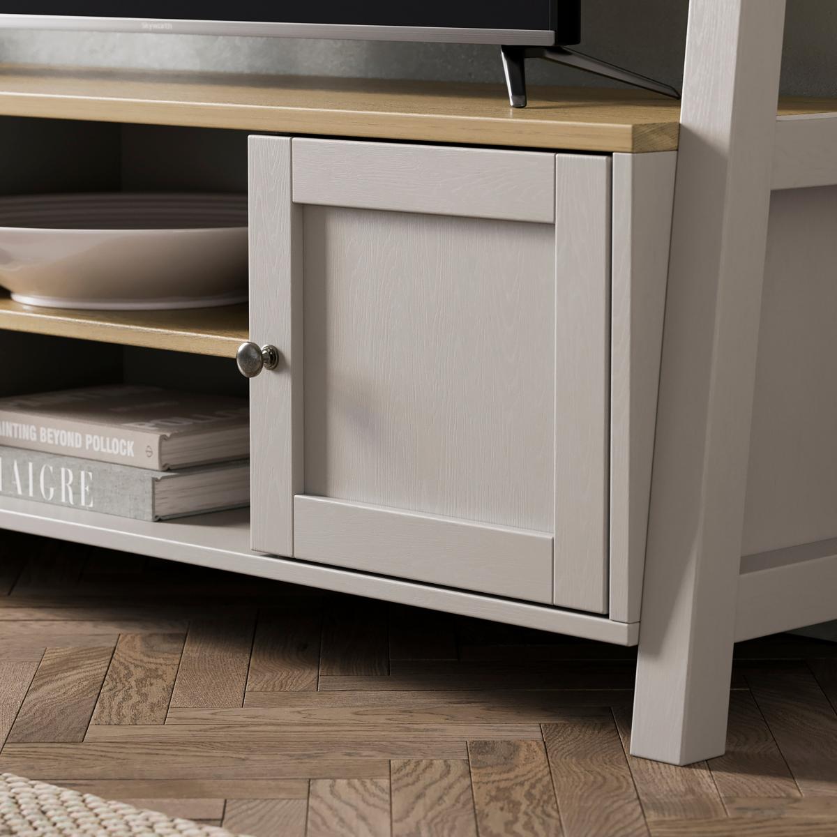 I’m a fan of this ladder-style TV stand because its mix of closed cupboard and open shelving keeps wires and consoles hidden while giving you display space. The muted stone paintwork and oak top work well in Scandi, modern farmhouse or coastal-inspired rooms, and its low profile lets light flow through without overwhelming the space. For styling, use the open shelf for a neat stack of coffee-table books or a storage basket for remotes, and tuck speakers or game consoles behind the cupboard door. On top, balance the screen with a low vase of greenery or a pair of short candle holders to keep sightlines clear and add a cosy touch.