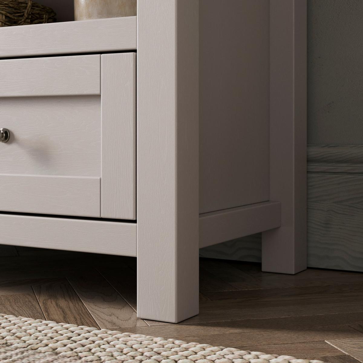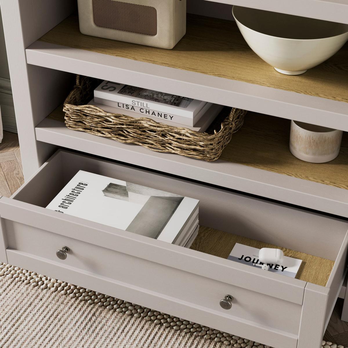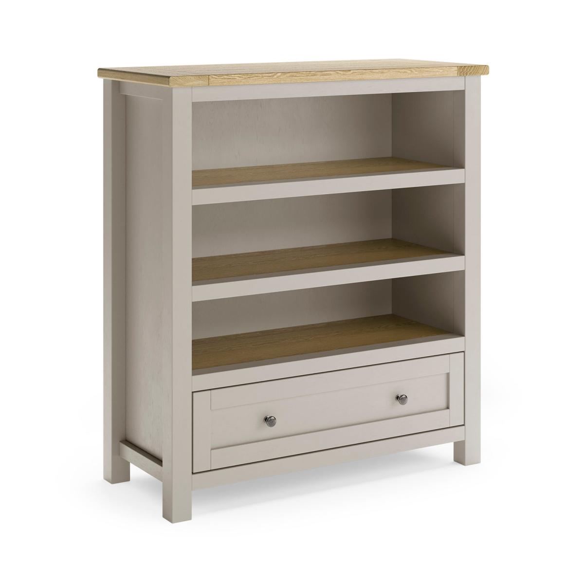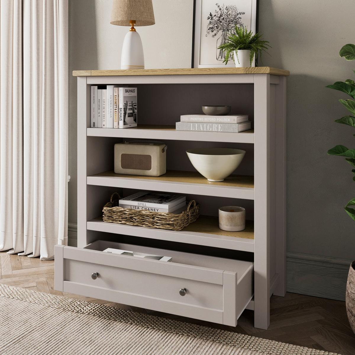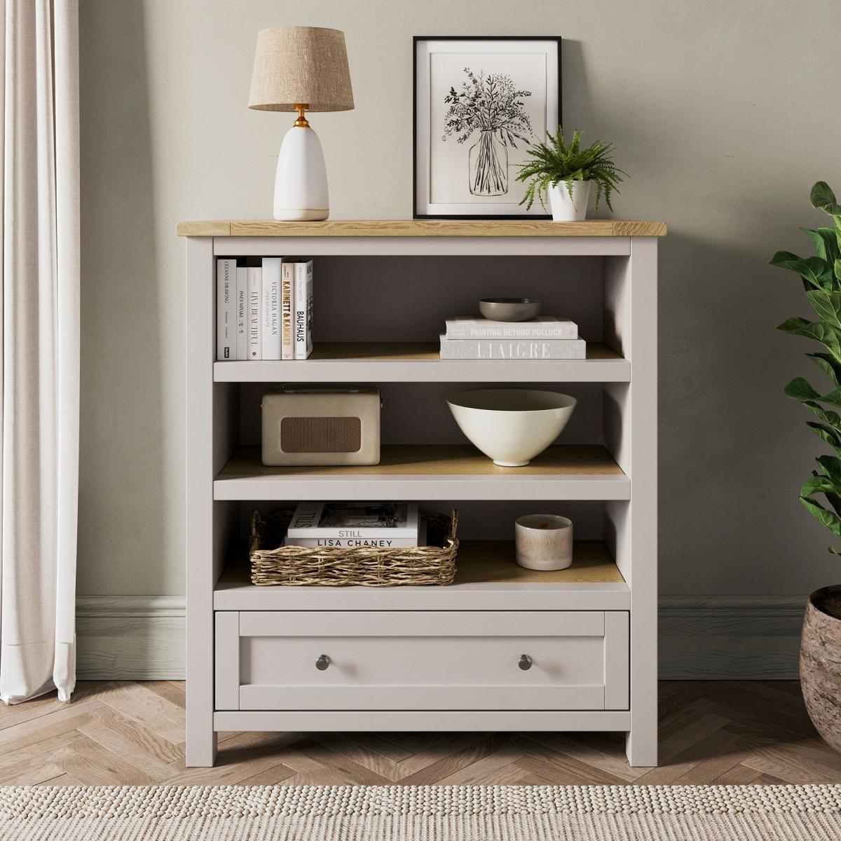 * Low bookcase * Storage drawer * Stone colourway * Wood effect shelves and top Bring style and practicality to your space with the Olney Low Bookcase. Perfect for storing books and displaying other items, this bookcase also features a drawer for handy out of sight storage. Finished in a stone colourway with wood effect shelves and top, this is a lovely piece for modern or traditional interior design styles.
