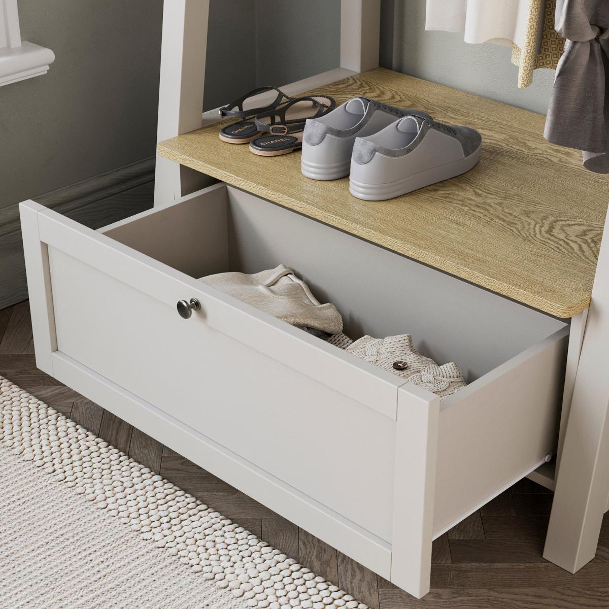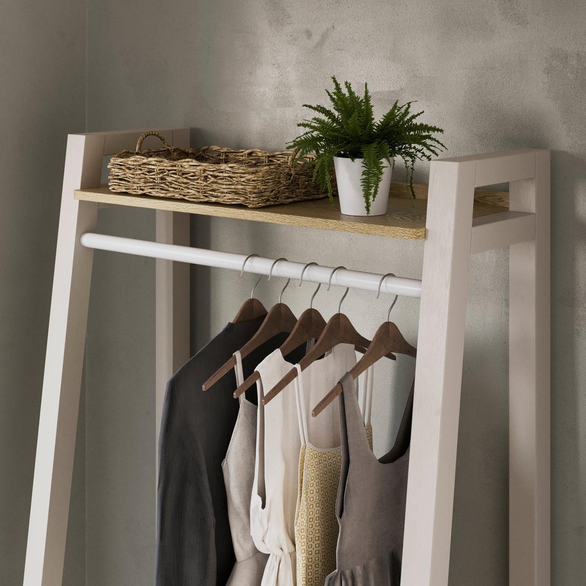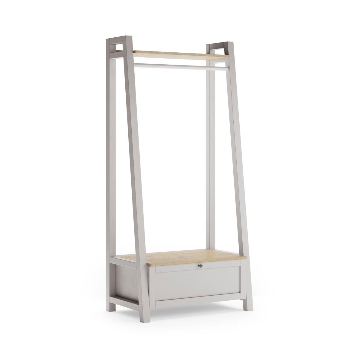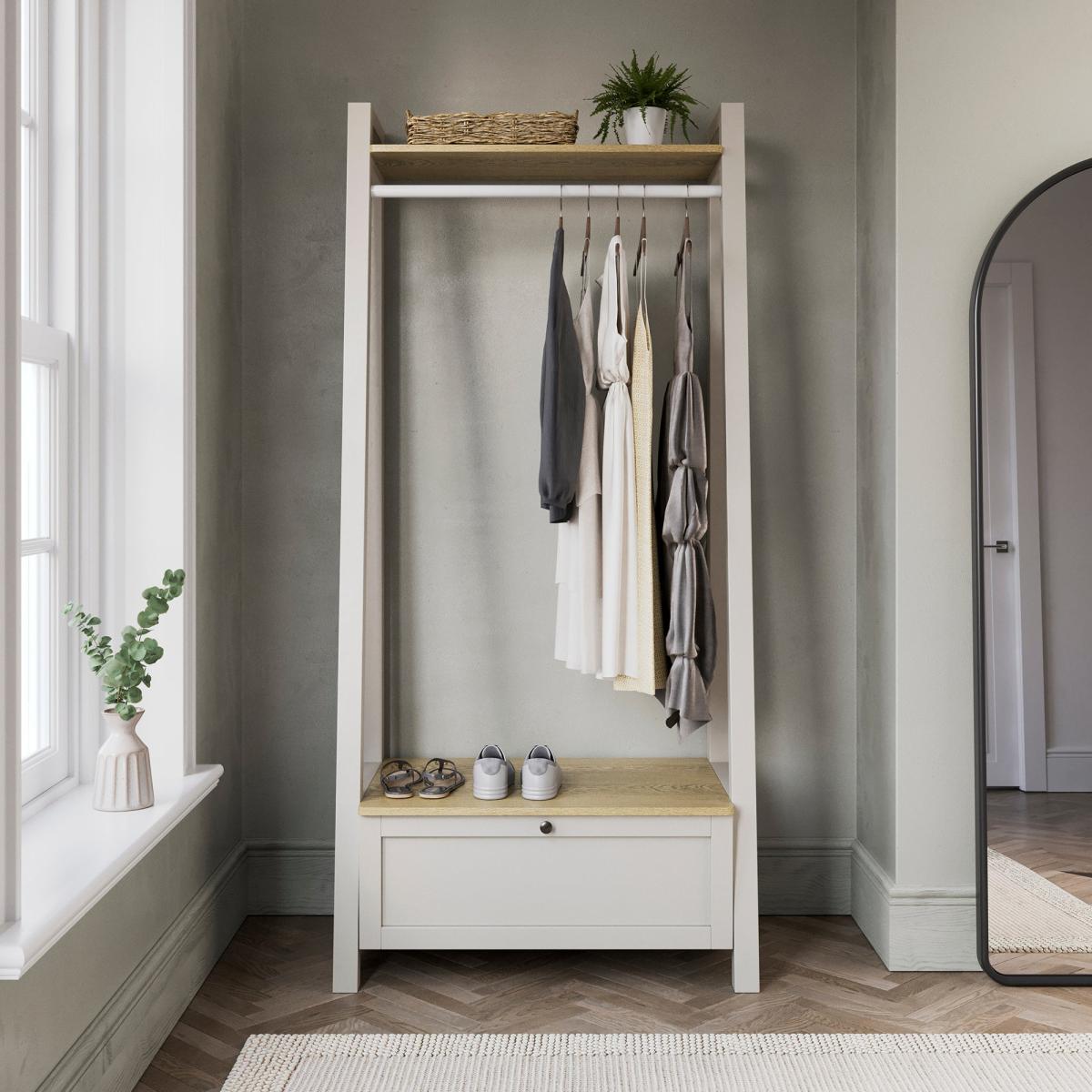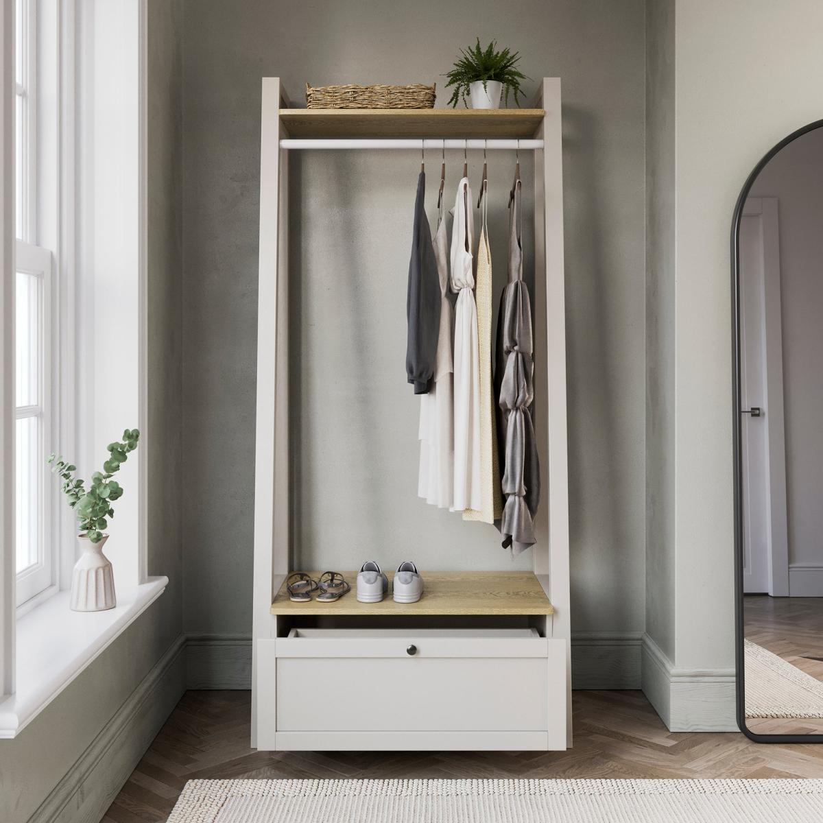 I love this open wardrobe for its clean lines and compact footprint. Its neutral finish and oak-toned shelf mean it slots effortlessly into Scandi, minimalist or coastal schemes, and it’s slim enough for a hallway, bedroom or spare corner. For styling, hang a curated edit of coats or dresses on matching wooden hangers, pop a woven basket of scarves on the top shelf and use the drawer below for folded knits or shoes. A small plant or framed print on top keeps the look personal without overcrowding.