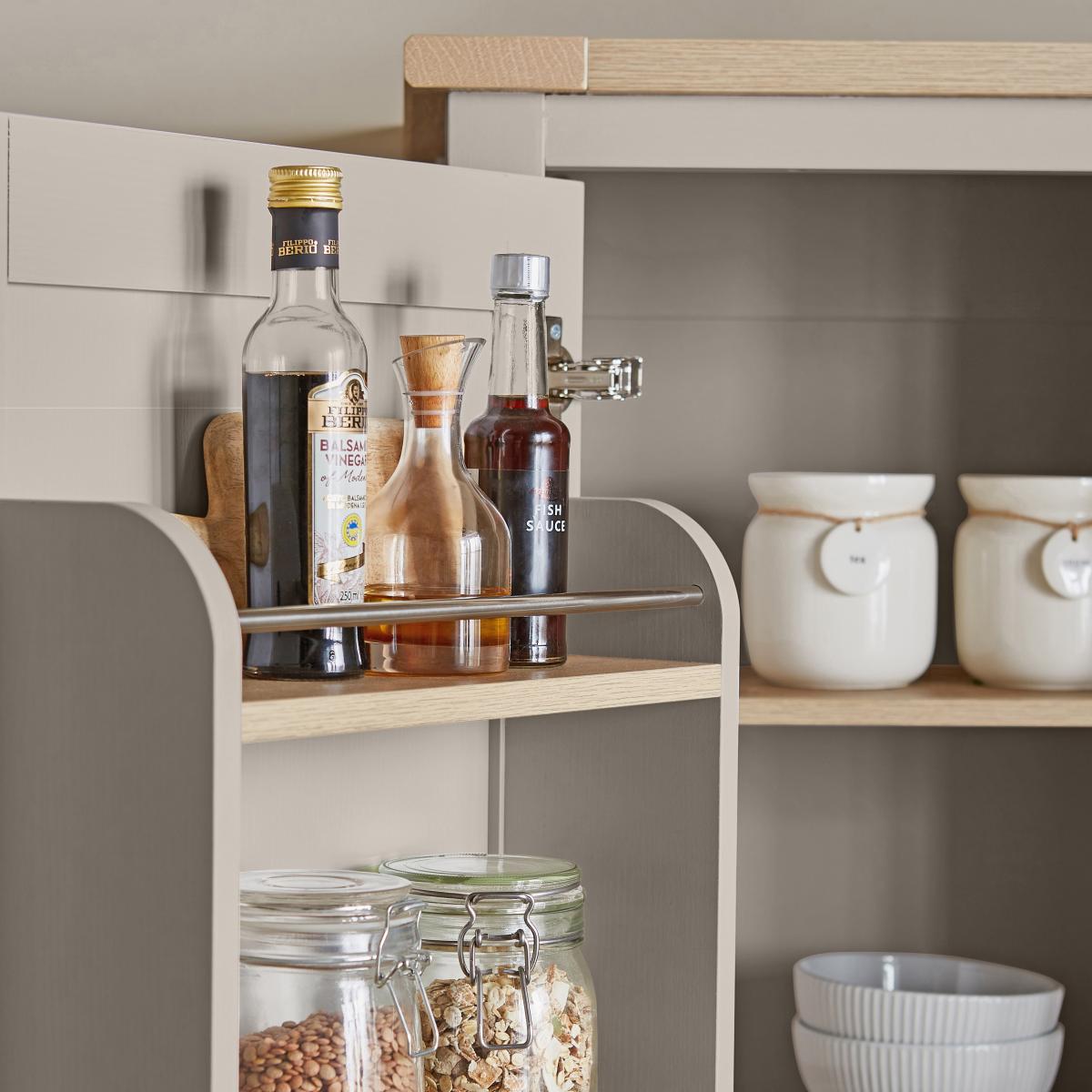 I really like the Olney single kitchen larder - the stone finish adds a neutral, versatile touch that suits both traditional and contemporary kitchens. It works particularly well in neutral or pastel colour schemes, where it can blend seamlessly, or as a statement piece in more pared-back interiors. Its practical design makes it ideal for storing dry goods, utensils, or even small appliances, with adjustable shelves that help optimise space. To style it, consider keeping the top clutter-free with simple decorative objects or plants for a natural touch, while adding some colour through neighbouring accessories or a colourful tray inside for visual interest. It’s a reliable choice that combines function with understated style.