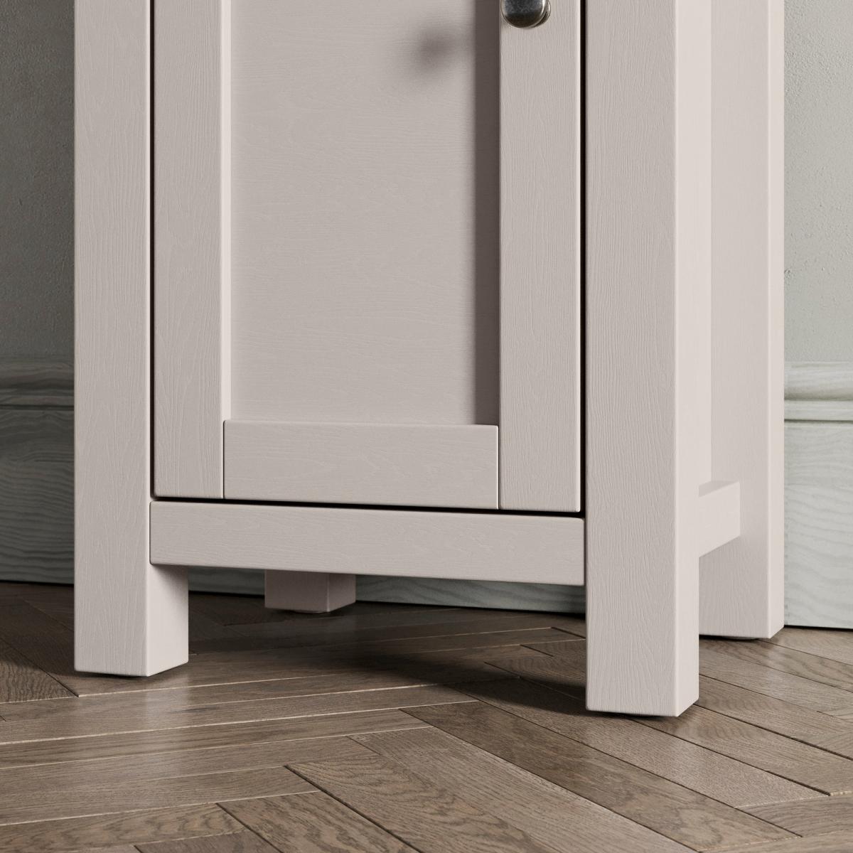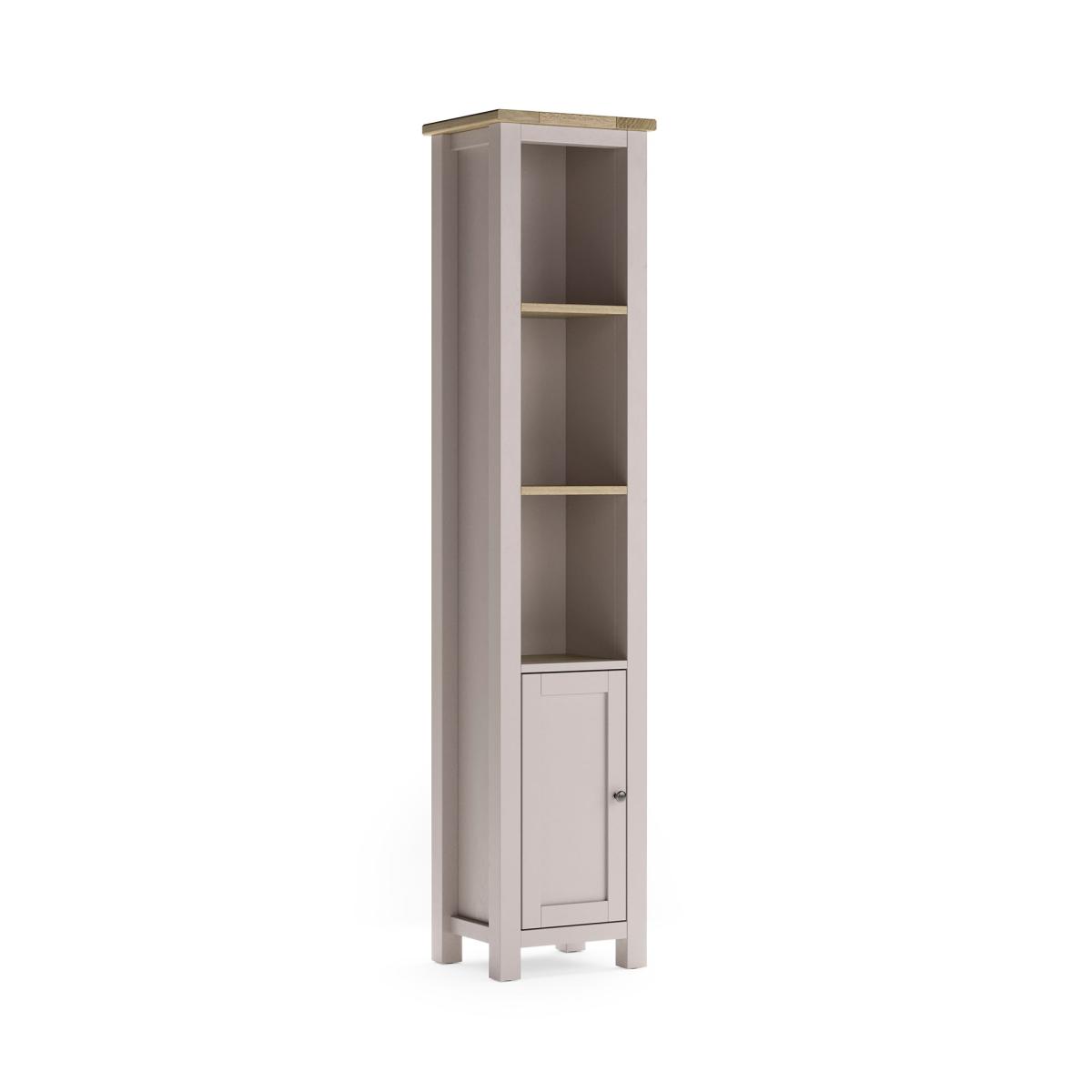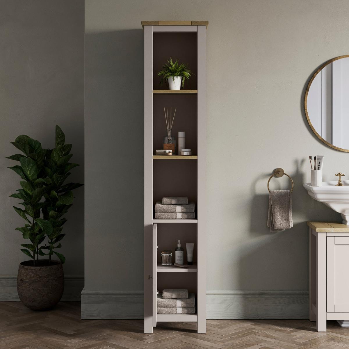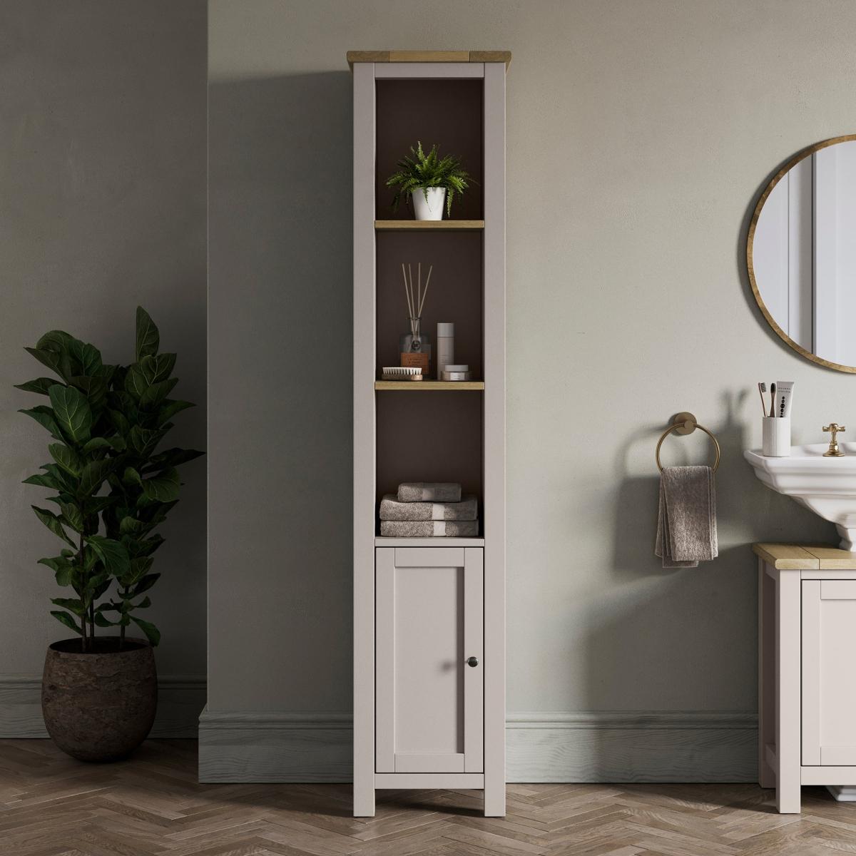I’m a fan of this slim shaker-style tallboy for its neat proportions and two-tone finish - fresh cream paint topped with oak makes it versatile from coastal to modern-Scandi schemes. It slots neatly into narrow hallways, bathrooms or living rooms, bringing both open shelving for display and a cupboard for concealed storage. For styling, group a couple of reed diffusers or candles on the top shelf, add a small plant or stack of linen-bound books on the middle shelf, and roll towels or hide toiletries behind the door below. Keep accessories minimal and colour-coordinate with your walls or soft furnishings to maintain a clean, organised look.