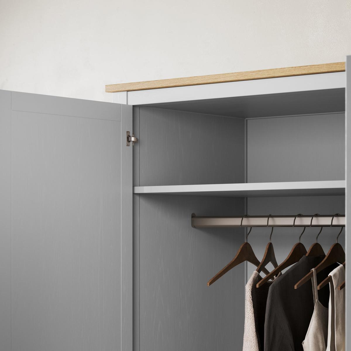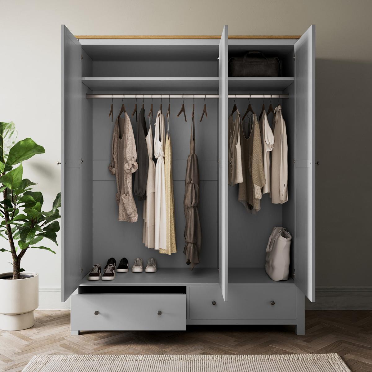 I love the Olney triple for its clean lines, soft grey finish and subtle oak-effect top, which makes it versatile enough for both minimalist and country-style schemes. It sits equally well in a Scandinavian-inspired room with neutral walls and natural linens or in a contemporary space paired with darker accents and simple metal details. For styling, fit it out with matching wooden or velvet-lined hangers and shelf organisers to maximise storage, while the three lower drawers are perfect for knitwear or smaller accessories. Top the unit with woven baskets or decorative boxes, and place a tall plant or table lamp alongside to break up the shape and add a personal touch.
