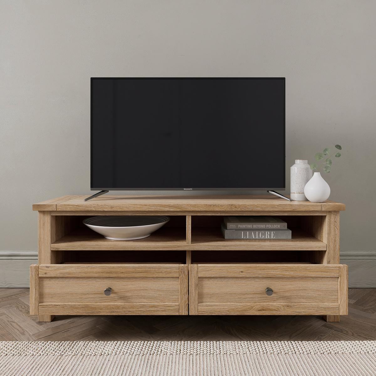 I’m a big fan of this oak TV unit for its clean lines and natural grain - it brings warmth without looking heavy. The combination of open shelves and drawers makes it ideal for hiding cables, stashing remotes or displaying a few carefully chosen accessories. It suits Scandi-inspired, contemporary and even mellow farmhouse schemes. To style it, keep the top surface uncluttered - perhaps a slim vase or framed photo either side of the screen - and arrange books or a low planter on one of the shelves. Use woven baskets in the lower compartments to corral games controllers or DVDs and maintain a streamlined feel.
