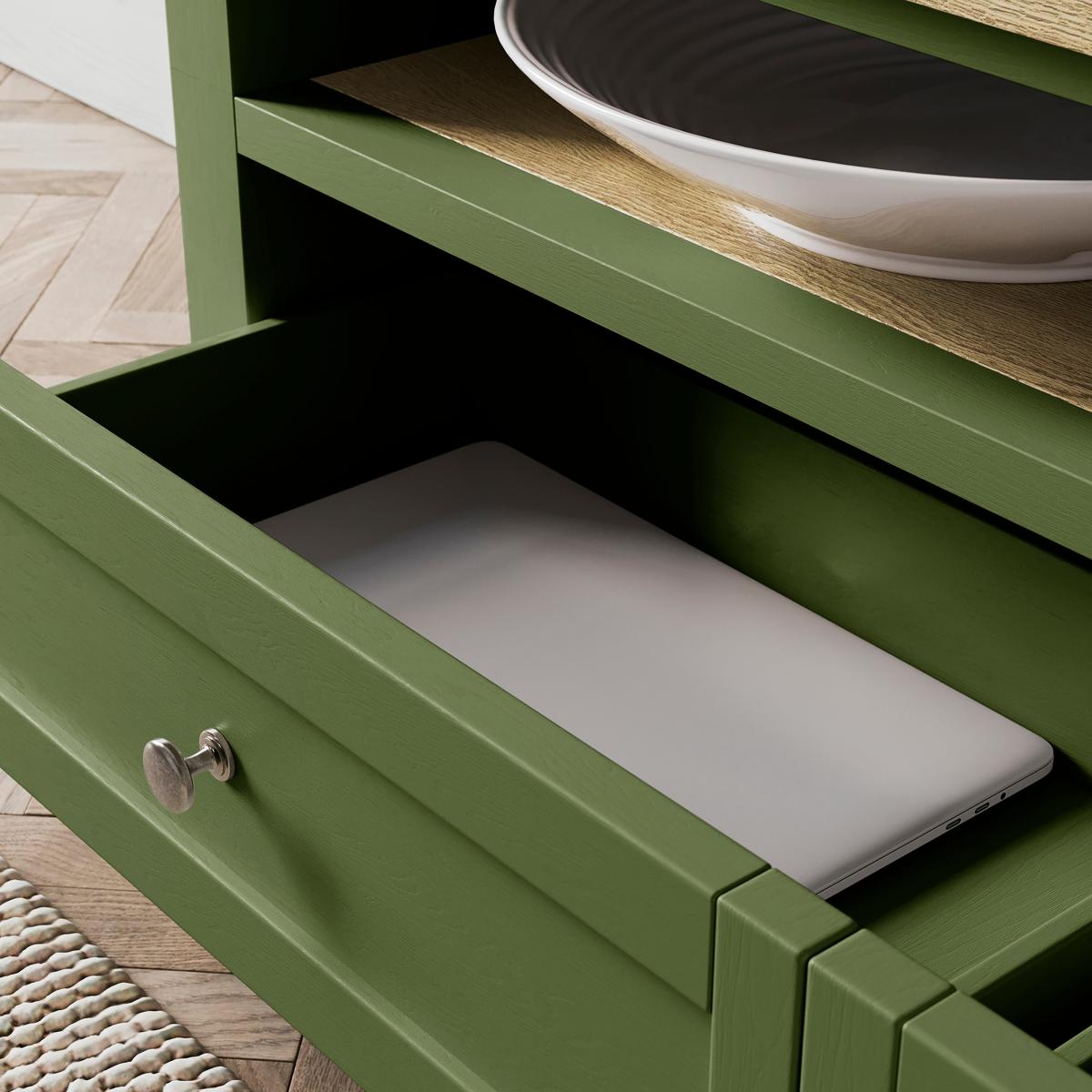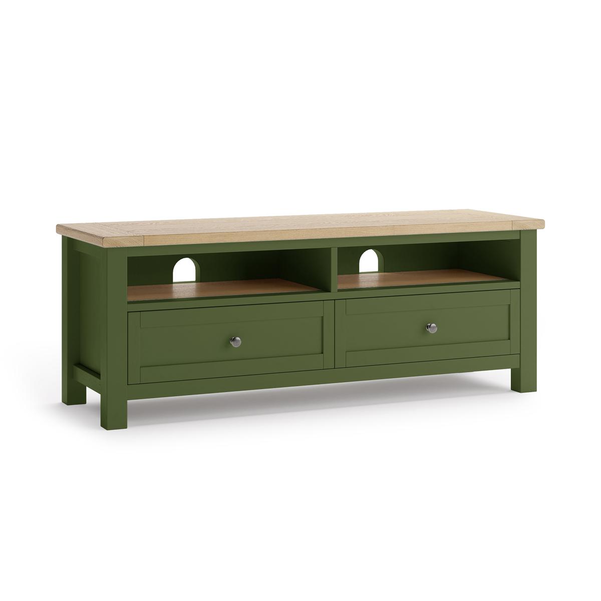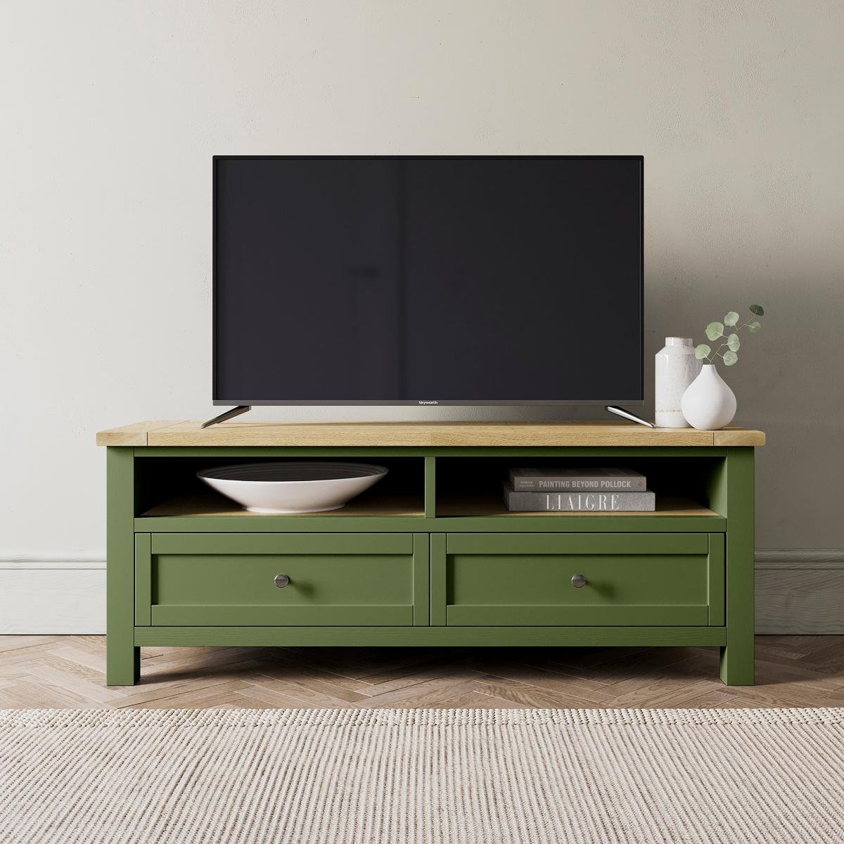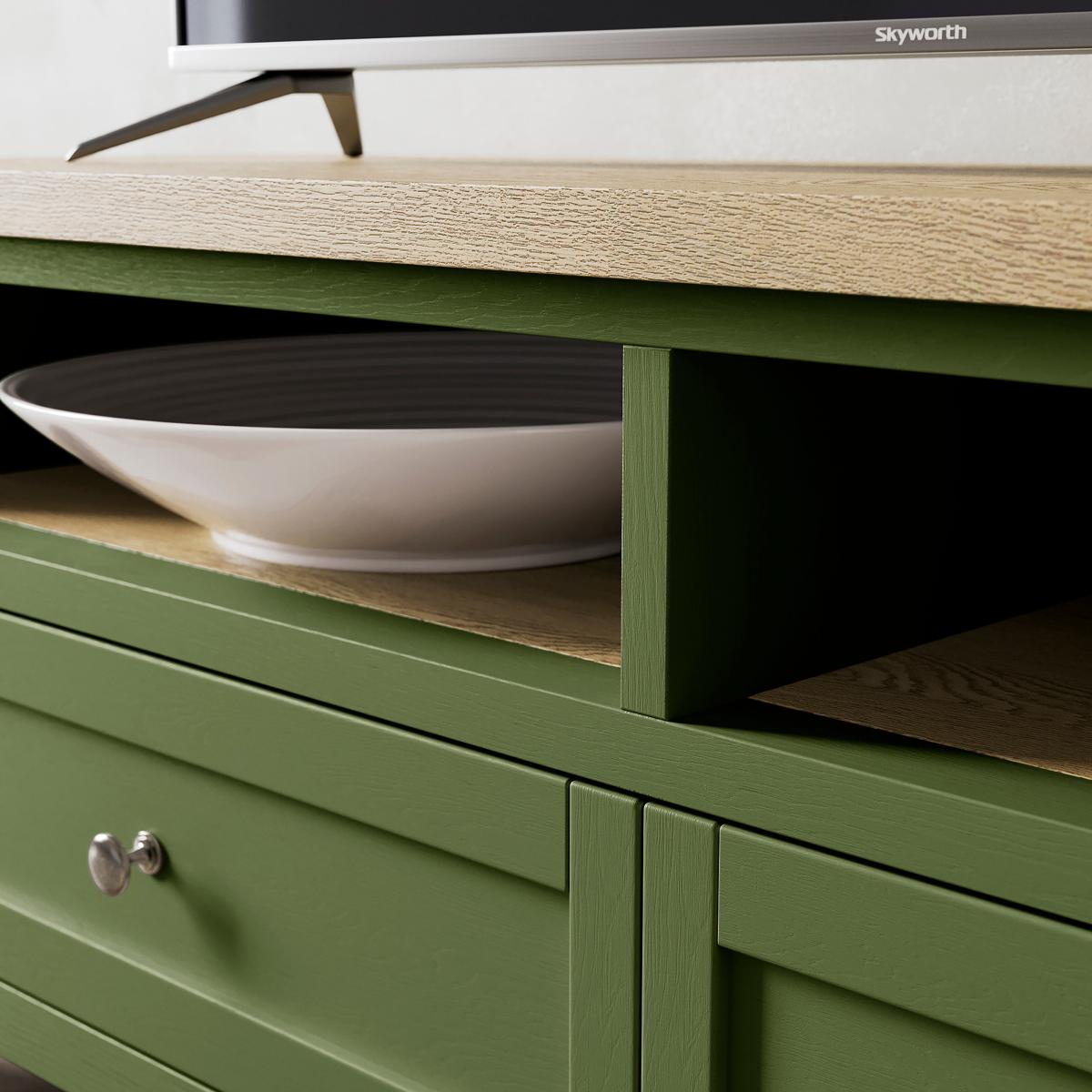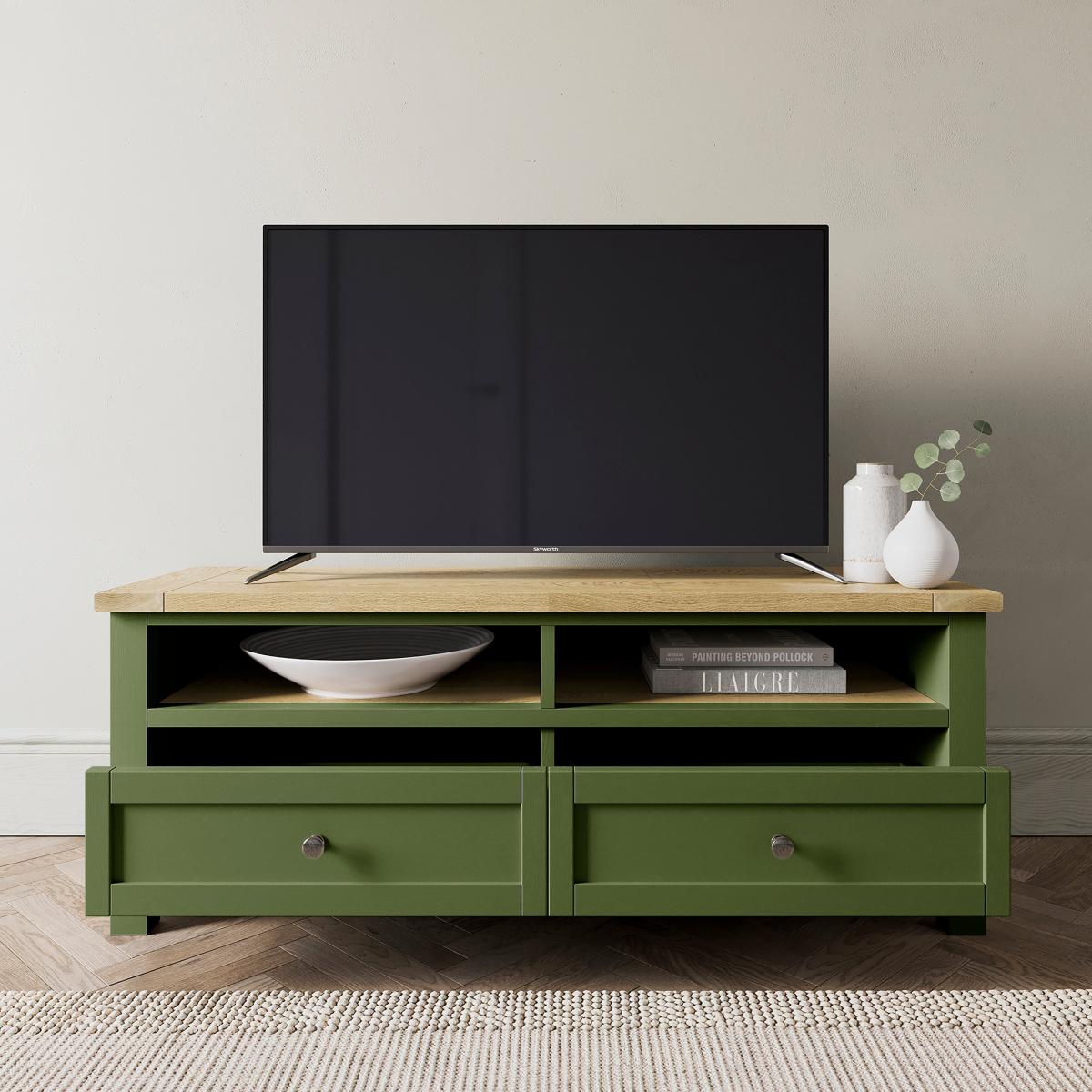 I love the Olney TV unit for its versatile and contemporary design, making it an ideal anchor in a range of interiors - from cottage chic to modern minimalism. Its two open shelves and spacious drawers offer practical storage, helping to keep tech paraphernalia and clutter organised. In terms of styling, I recommend pairing it with natural textures like woven baskets or ceramics to add warmth. It works particularly well against neutral or light-coloured walls, and you can easily dress it up with a bold vase or framed photos to personalise the space. For smaller rooms, its thoughtful proportions help maintain a streamlined look, making it as functional as it is stylish.