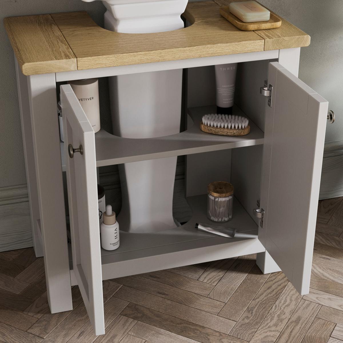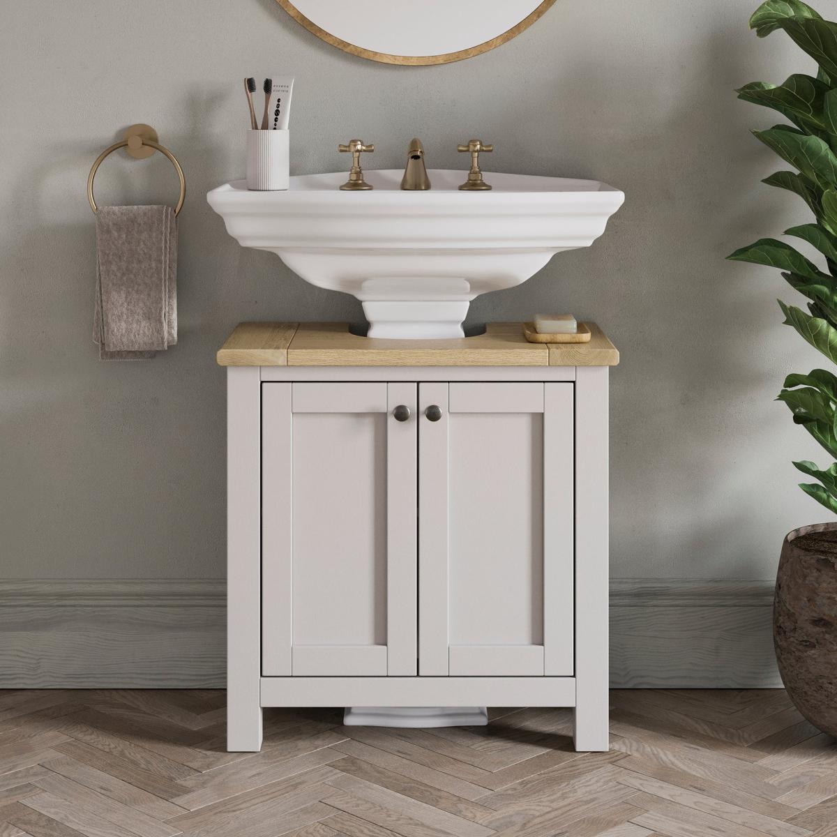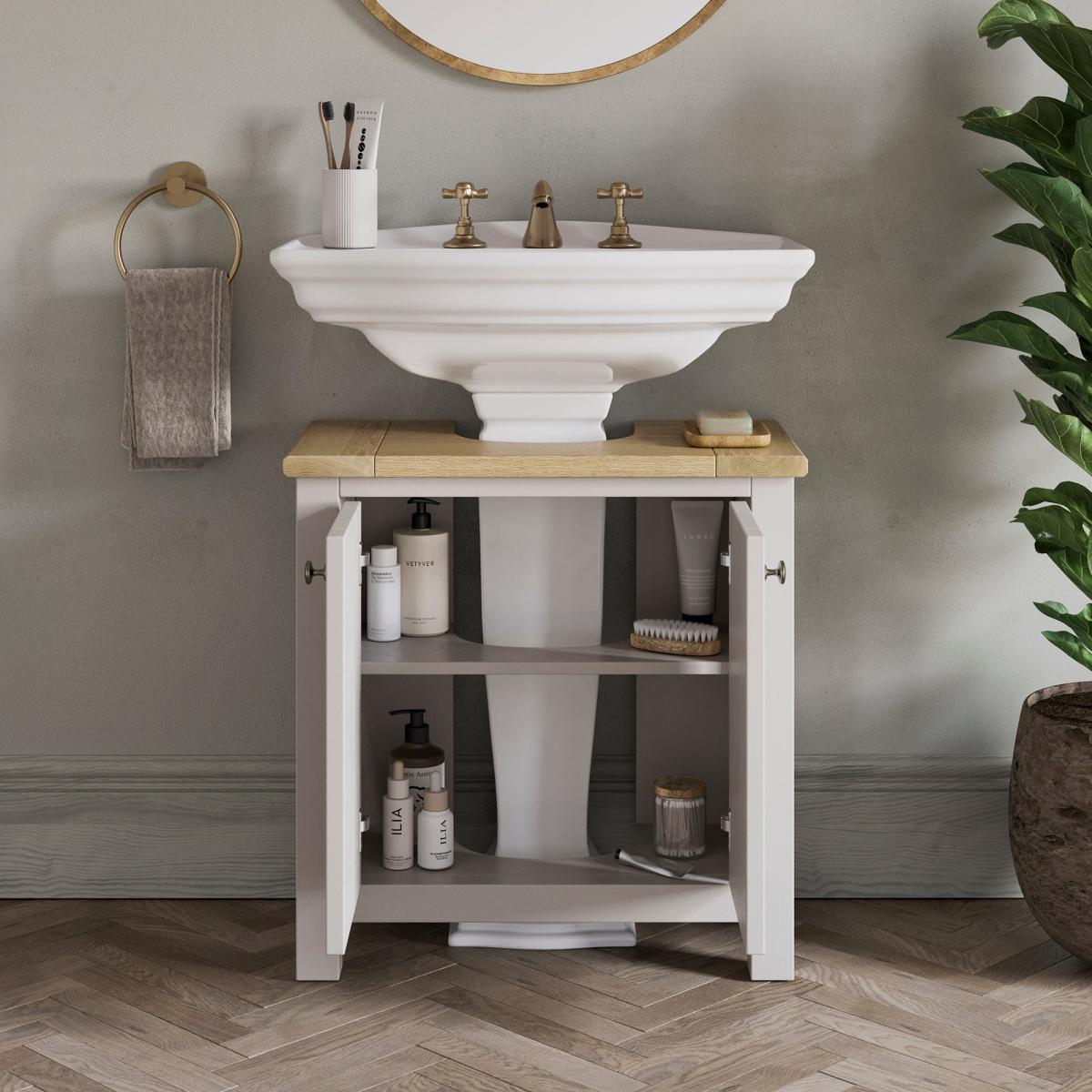 I really like the olney under sink unit because of its clean, classic design that works well in both traditional and contemporary settings. It’s versatile and adds a refined touch to bathroom or utility spaces, especially when paired with a vintage or shabby-chic vibe. Practical styling tips include keeping the top clear for a neat look, maybe adding a decorative tray or small plant for visual interest, and ensuring it’s placed against a light or neutral wall background to highlight its details. It’s a handy piece that provides essential storage while maintaining a tidy, stylish appearance.